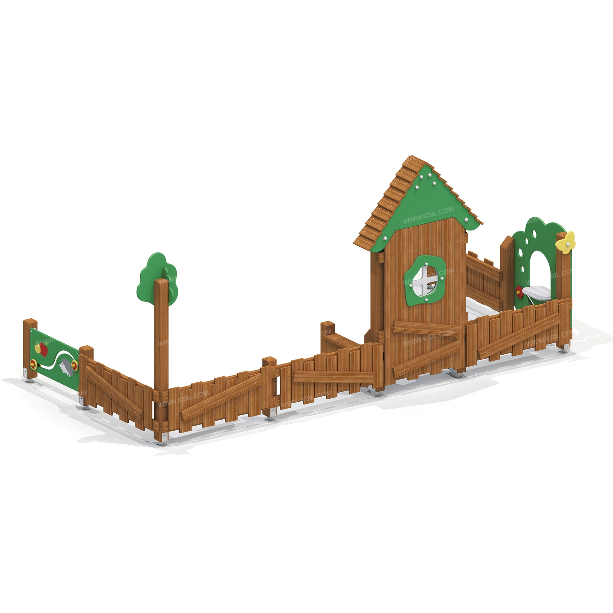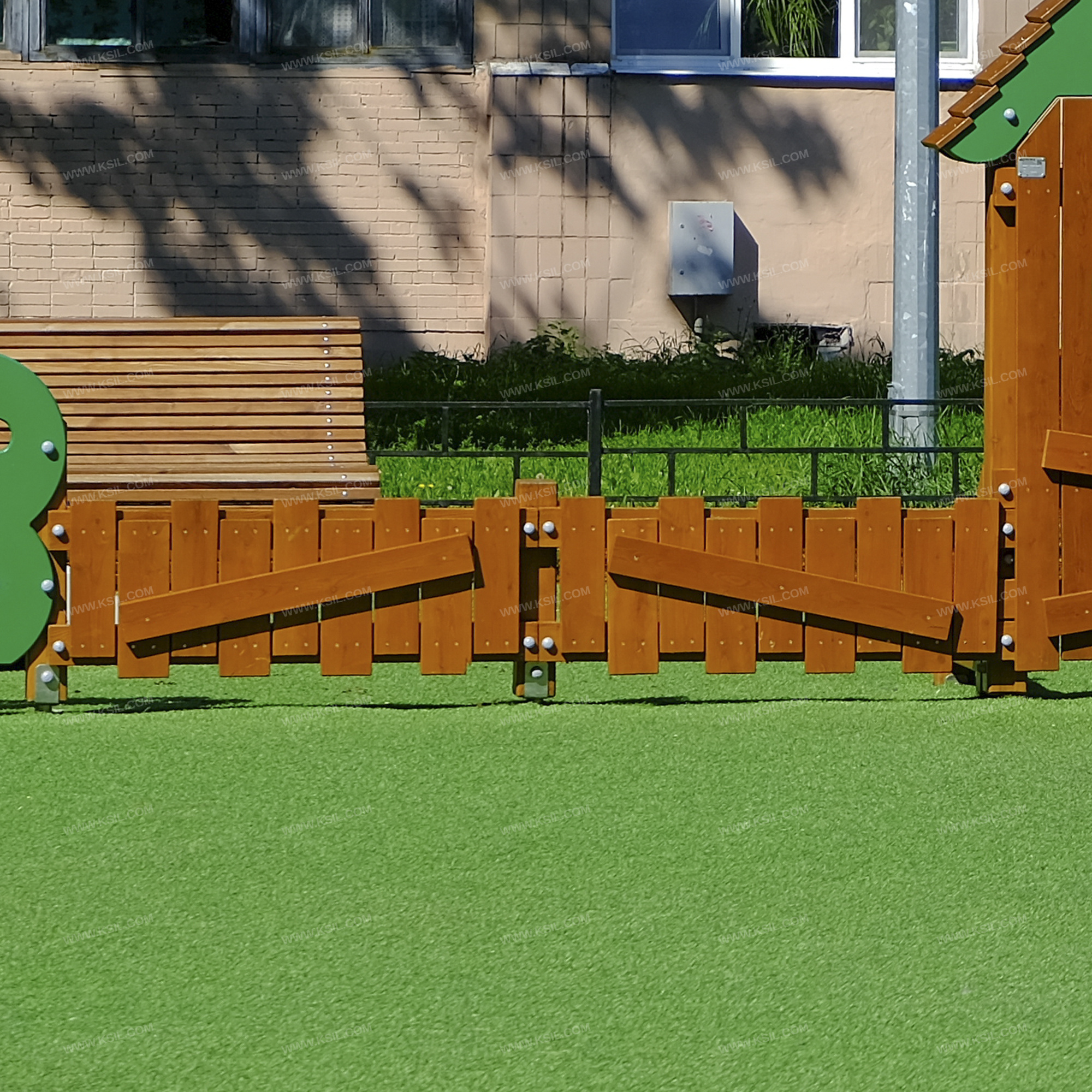 Деревянные доски лиственницы должны быть подвергнуты специальной обработке и сушке до мебельной влажности 7-10% для придания особой прочности несущим конструкциям.Материалы из древесины не должны иметь на поверхности дефектов обработки. Весь крепеж должен быть оцинкован, все углы закруглены радиусом не менее 3 мм. Промежутки и стыки между элементами оборудования не должны допускать застревания частей тела и одежды пользователей. В конструкции должна быть предусмотрена возможность доступа взрослого при обстоятельствах, требующих посторонней помощи пользователю.C целью повышения качества и безопасности продукции, в документацию на изделие могут вноситься изменения (изображение, размеры, и т.п.).