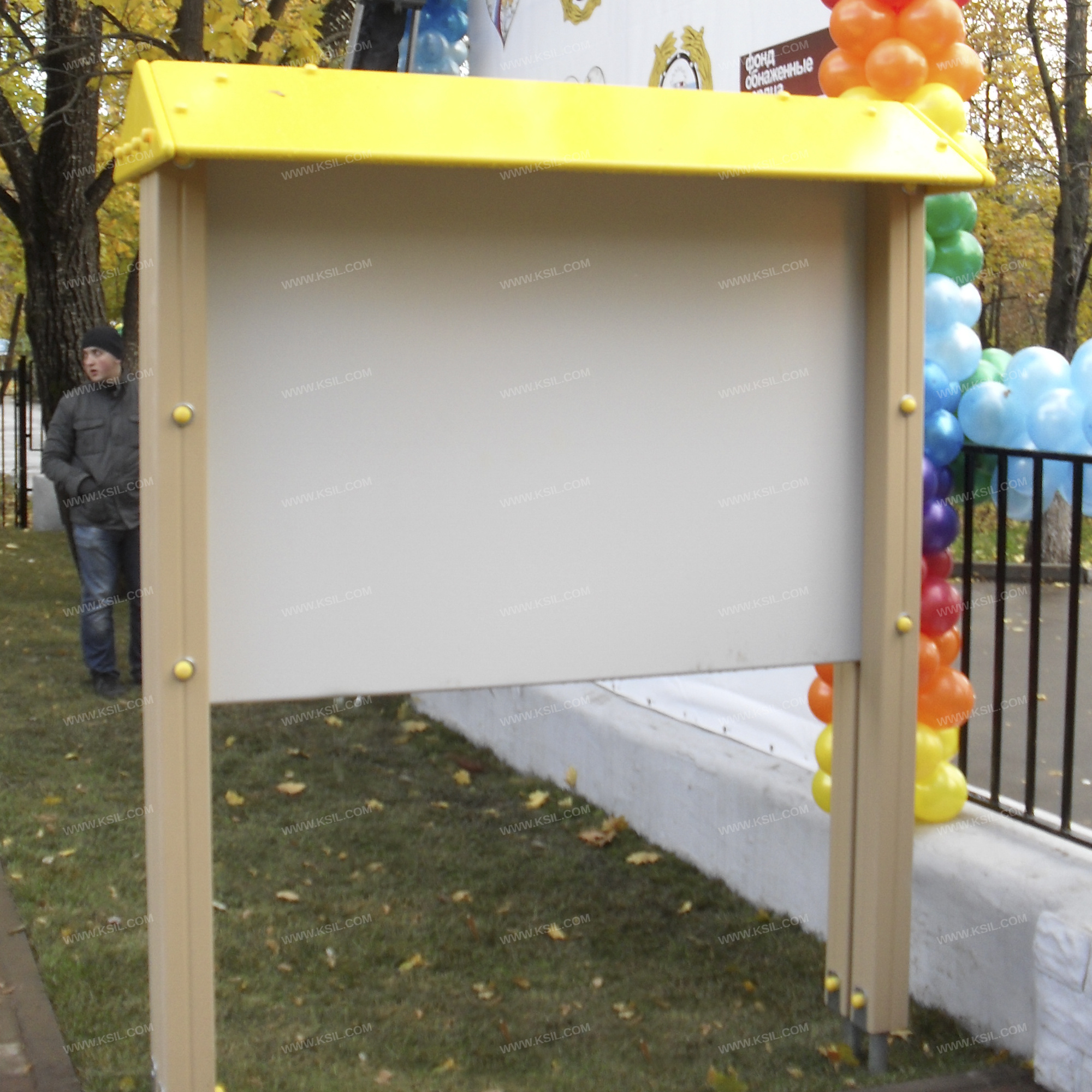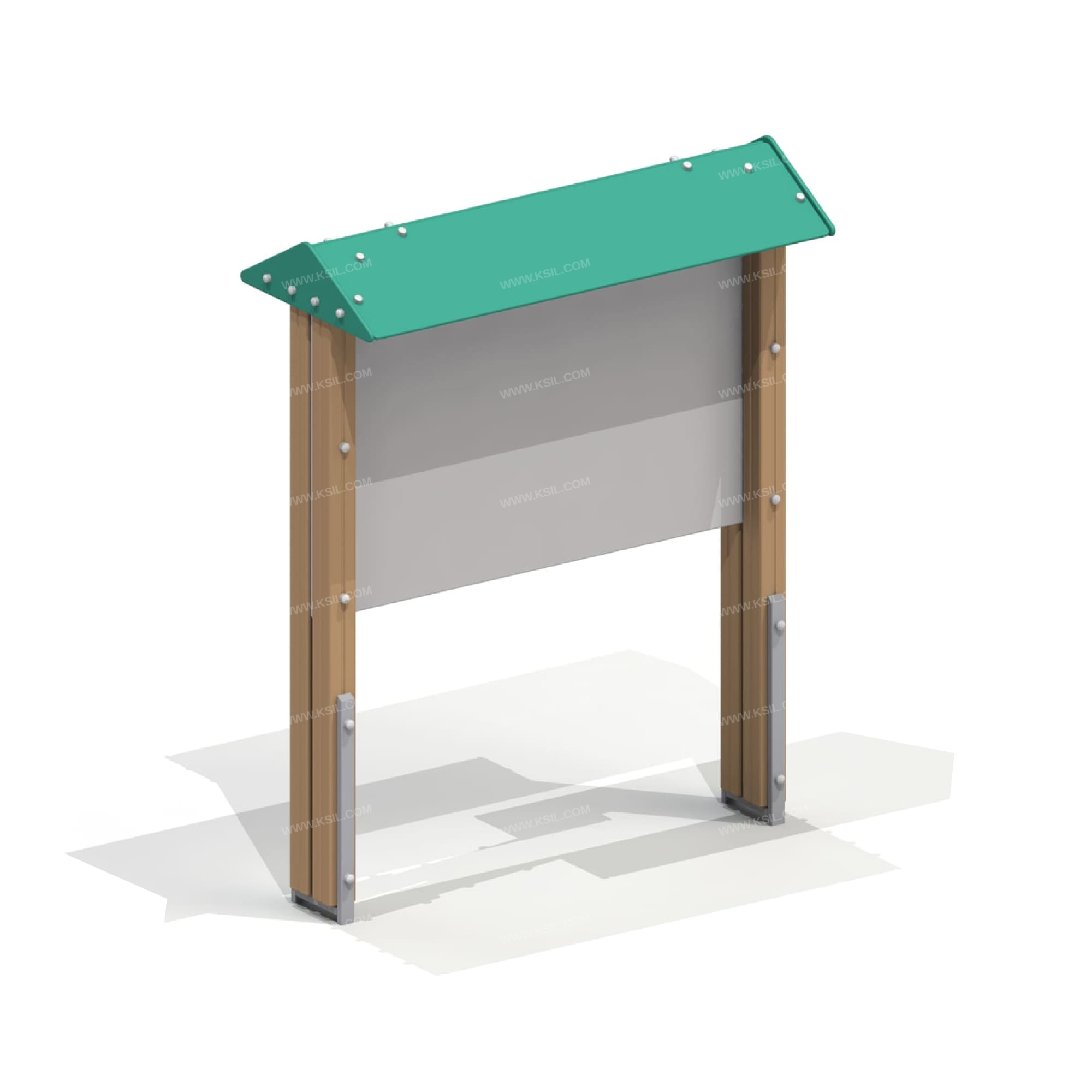 Информационный щит должен быть предназначен для размещения организационной информации на территории мест отдыха. Информационный щит должен представлять собой устойчивую конструкцию, состоящую из 4-х несущих столбов, стенда и 2-х скатного козырька. Стенд должен быть изготовлен из единого листа влагостойкой окрашенной фанеры толщиной не менее 21 мм.Несущие столбы должны быть выполнены из клееного деревянного бруса сечением не менее 100х100 мм и иметь скругленный профиль с канавкой посередине. Снизу столб должен заканчиваться металлическим оцинкованным подпятником из трубы сечением 50х25мм, который бетонируется в землю.Скаты козырька должны быть выполнены из влагостойкой фанеры толщиной не менее 15 мм.
