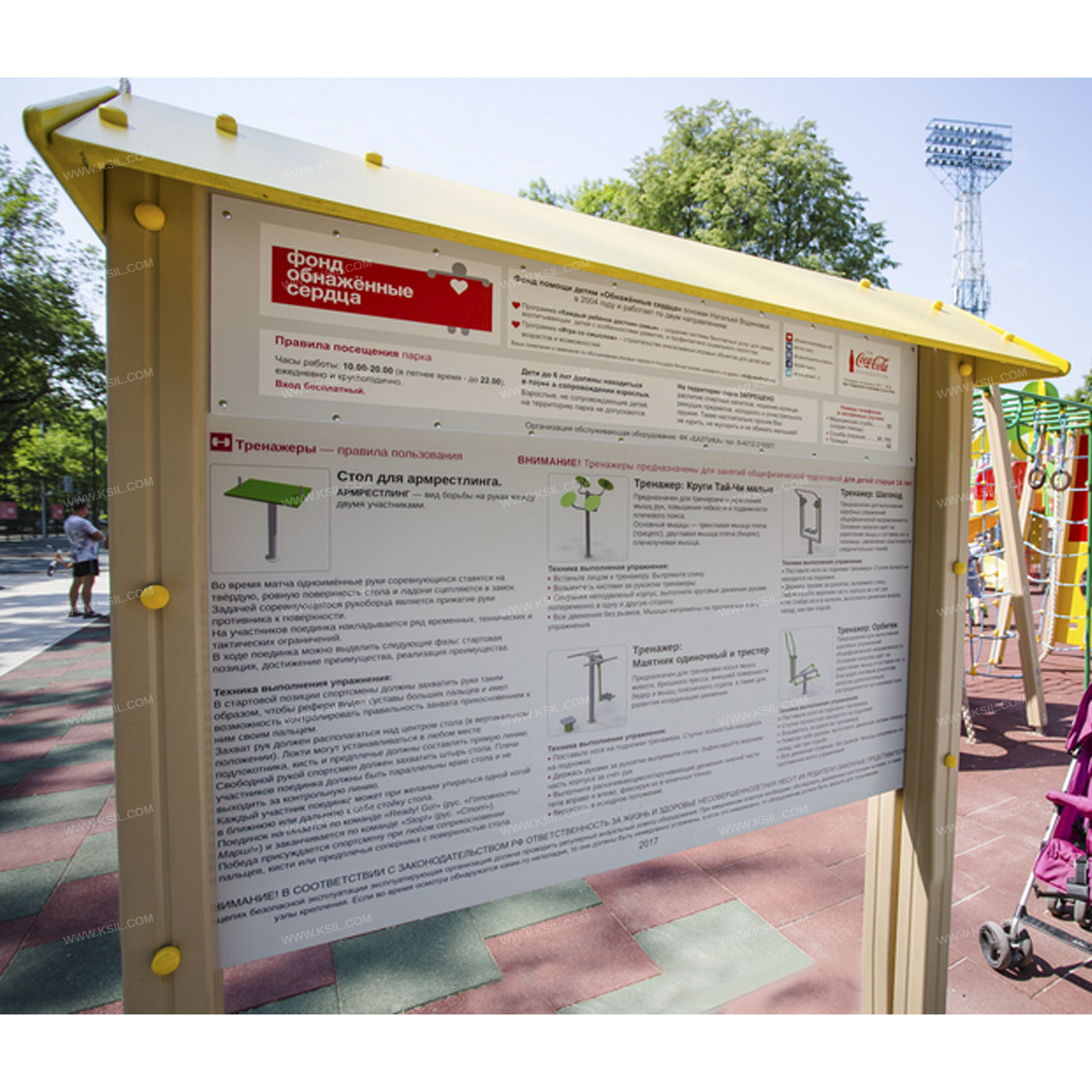 Металлические элементы должны быть покрыты порошковыми красками или подвергнуты гальванизации. Сварные швы должны быть гладкими и исключать возможность травмирования пользователей при контакте. Весь крепеж должен быть оцинкован, все углы закруглены радиусом не менее 3 мм. Деревянный брус должен быть склеен под прессом из нескольких отборных сосновых досок, подвергнутых специальной обработке и сушке до мебельной влажности 7-10% для придания особой прочности несущим конструкциям.Фанера влагостойкая не ниже I сорта изготовленная из шлифованного березового шпона повышенной водостойкости, склеенного клеем класса эмиссии Е1 с предварительной заделкой (замазкой или вставками) естественных дефектов древесины.Материалы из древесины не должны иметь на поверхности дефектов обработки. Промежутки и стыки между элементами оборудования не должны допускать застревания частей тела и одежды пользователей. В конструкции должна быть предусмотрена возможность доступа взрослого при обстоятельствах, требующих посторонней помощи пользователю.C целью повышения качества и безопасности продукции, в документацию на изделие могут вноситься изменения (изображение, размеры, и т.п.).
