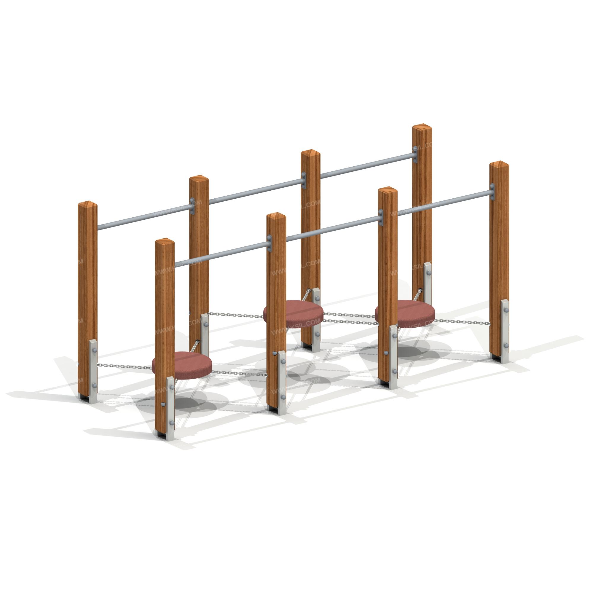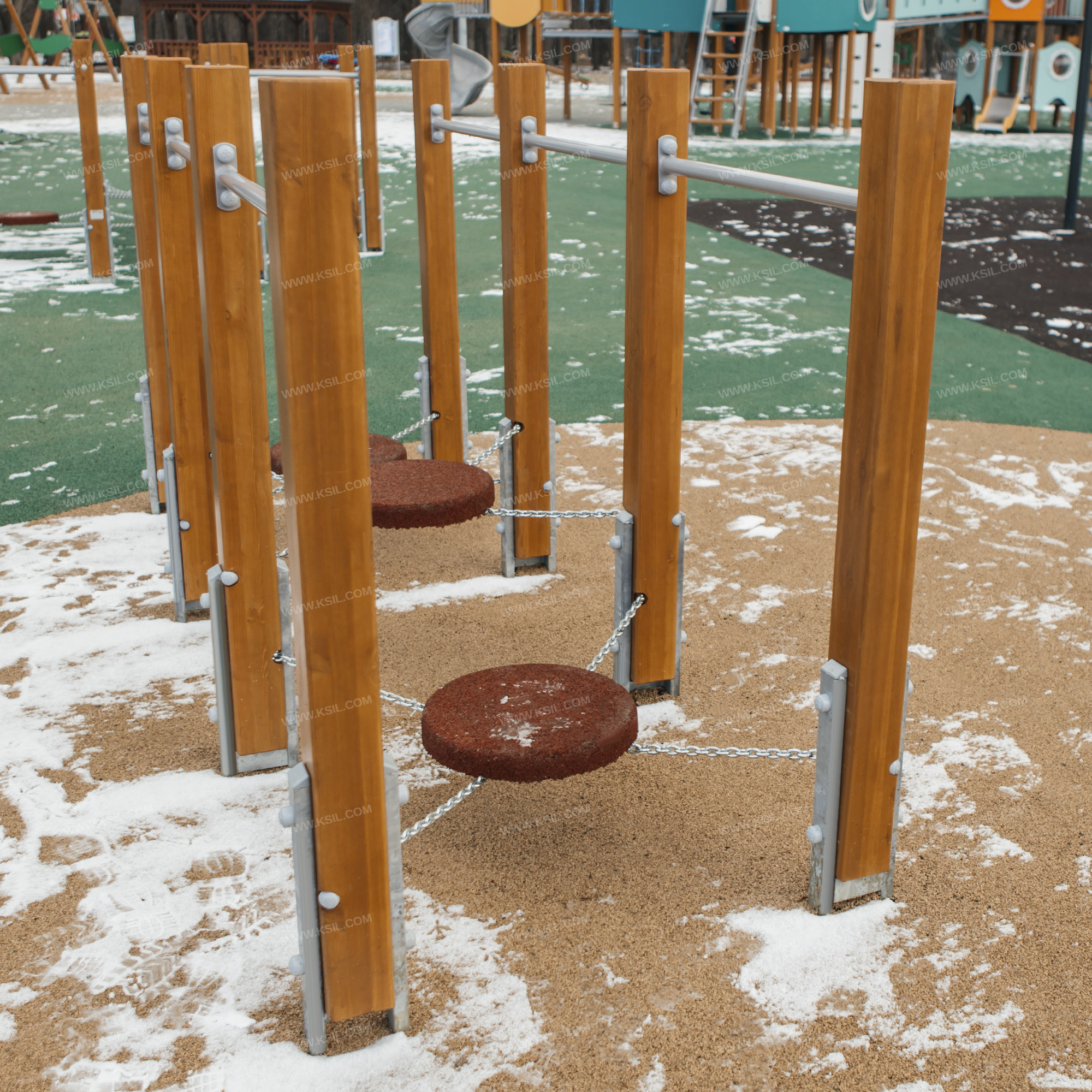 Детский игровой элемент должен представлять собой конструкцию для игры на открытом воздухе. Детский игровой элемент состоит из 3-х круглых резиновых ступенек, подвешенных на цепях к несущим стойкам.Круглая ступенька изготовлена из резиновых гранул, склеенных под давлением специальным полиуретановым клеем (биндером). Основание ступеней выполнено из влагостойкой фанеры толщиной не менее 21 мм. В ступенях закреплены болты для крепления к конструкции.Несущие стойки должны быть выполнены из клееного деревянного бруса лиственницы сечением не менее 100х100 мм и иметь скругленный профиль. Снизу столб крепится на металлический оцинкованный подпятник, выполненный из профильной трубы сечением 50х25, который бетонируется в землю.Перекладины должны быть выполнены из металлической трубы диаметром не менее 33 мм.Подвесы ступеней должны быть выполнены из оцинкованной стальной цепи, изготовленной методом контактной электросварки. На поверхности цепи не должно быть трещин, ситовидной пористости, плены и расслоения. Ступенька крепится к подвесу болтовым соединением с помощью фланцев из листового металла толщиной не менее 4 мм.