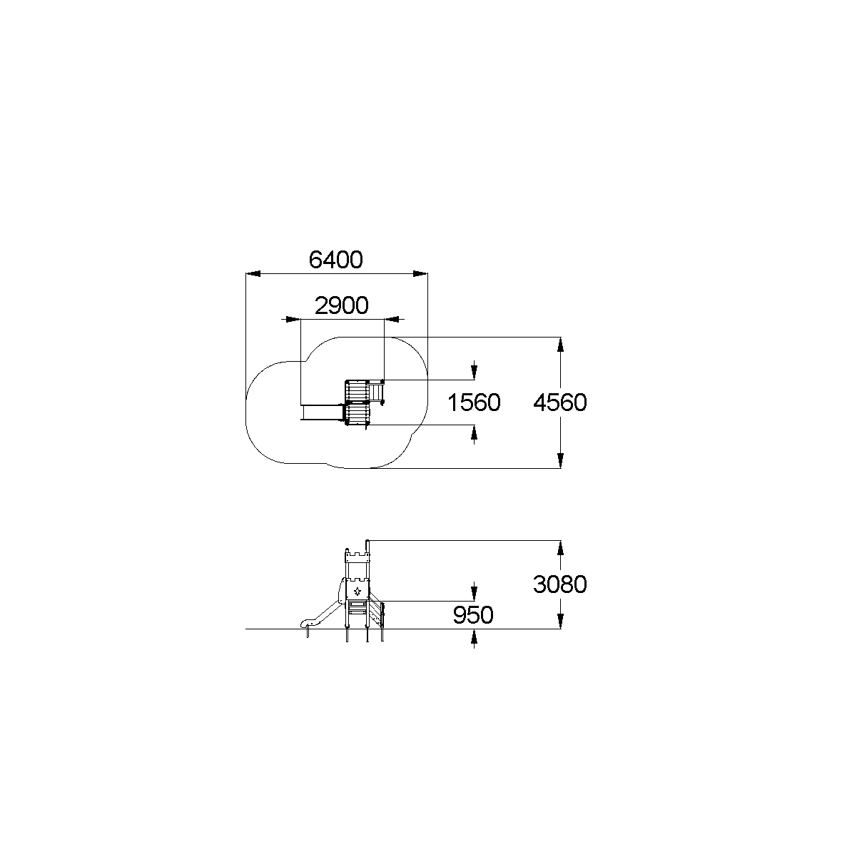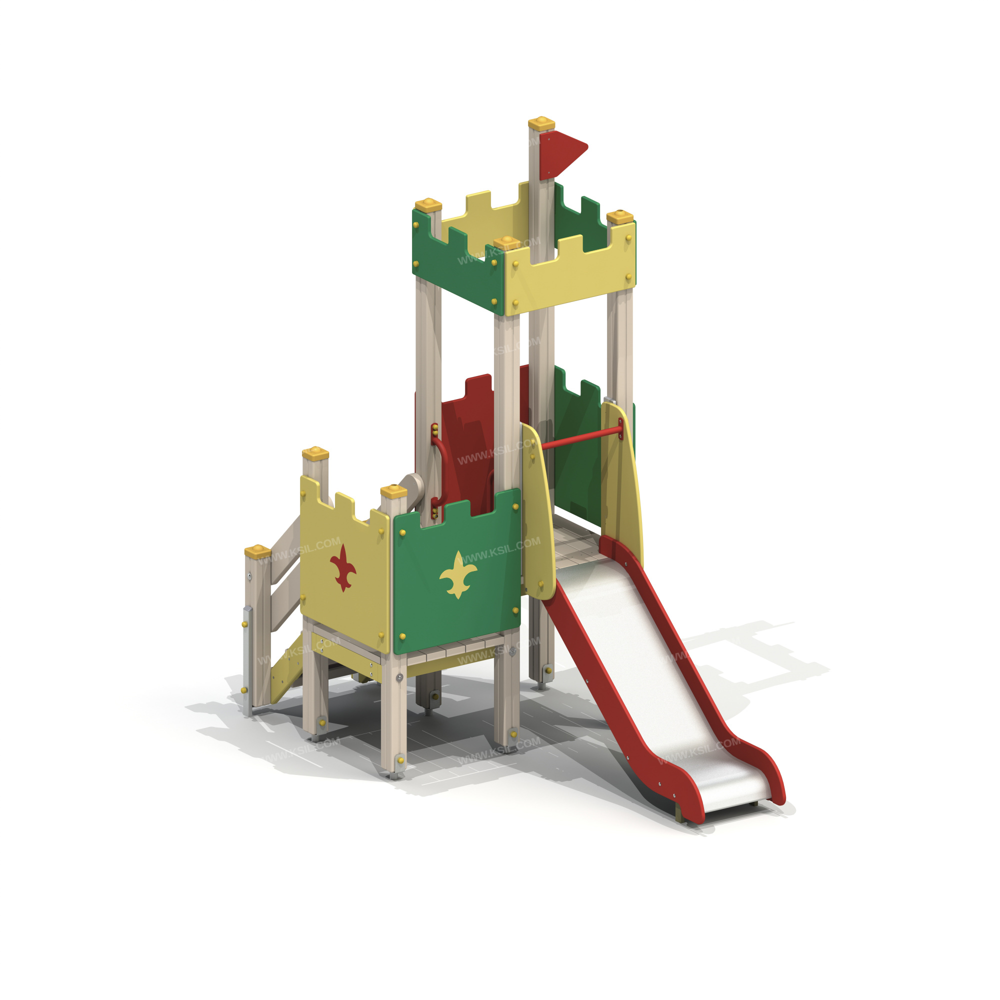 Детский игровой комплекс должен представлять собой модульную сборно-разборную конструкцию в виде крепости, состоящую из башни с полубашней.К башне с имитацией крыши, с высотой площадки не менее 950 мм, должны быть пристроены: фанерные ограждения с зубчатой верхней гранью и декоративным накладным элементом, горка, поручни и декоративный флаг, крепящийся к несущему столбу.К полубашне, с высотой площадки не менее 650 мм, должны быть пристроены: лестница, фанерные ограждения с зубчатой верхней гранью и декоративным накладным элементом.Несущие столбы комплекса должны быть выполнены из клееного деревянного бруса сечением не менее 100х100 мм и иметь скругленный профиль с канавкой посередине. Сверху столб должен заканчиваться пластиковой заглушкой, снизу столб должен заканчиваться металлическим оцинкованным подпятником диаметром не менее 42 мм, который бетонируется в землю.Пол башен должен быть выполнен из деревянной доски толщиной не менее 40 мм.Имитация крыши должна состоять из 4-х накладных элементов из влагостойкой фанеры толщиной не менее 21 мм с зубчатой верхней гранью, расположенных по периметру башни. Ограждения башен должны быть выполнены из влагостойкой фанеры толщиной не менее 21 мм. Горка должна состоять из ската, бортиков, защитной секции и защитной перекладины. Горка должна иметь стартовый участок высотой не менее 950 мм, участок скольжения и конечный участок. Скат должен быть изготовлен из единого листа нержавеющей стали толщиной 1,5 мм, утопленный в паз бортиков горки. Бортики горки должны быть высотой не менее 100 мм. Защитная перекладина должна быть выполнена из металлической трубы диаметром не менее 33 мм, побуждающая ребенка присесть и установлена на высоте не менее 600 мм от уровня поверхности стартового участка горки. Защитная секция горки должна быть выполнена из влагостойкой фанеры толщиной не менее 21 мм. Лестница высотой не менее 650 мм должна быть оснащена перилами, выполненные из деревянной доски толщиной не менее 40 мм, декоративных накладных элементов из влагостойкой фанеры толщиной 15 мм. Перила должны быть установлены от первой ступени. Ступени лестниц должны быть выполнены из ламинированной противоскользящей влагостойкой фанеры толщиной не менее 15 мм и деревянной доски толщиной 40 мм, склеенных между собой. Расстояние между ступенями должно быть одинаковым. Декоративные элементы должны быть выполнены из влагостойкой фанеры толщиной не менее 9 мм. Поручни и перекладина должны быть выполнены из металлической трубы диаметром не менее 33 мм.