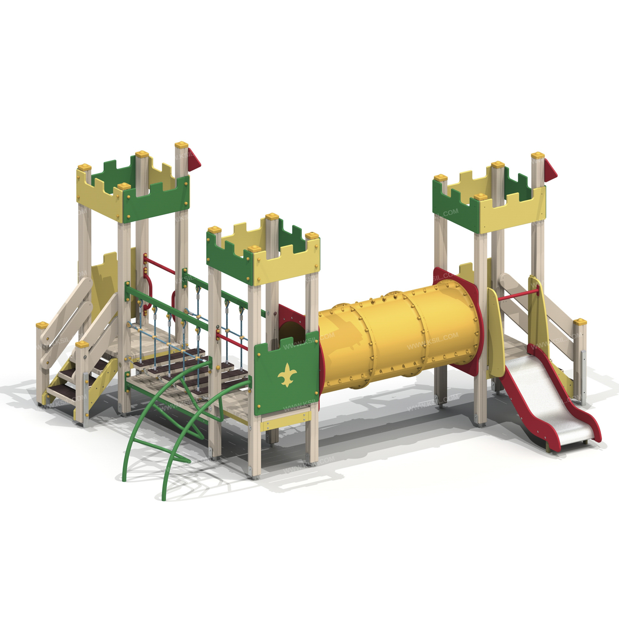Детский игровой комплекс должен представлять собой модульную сборно-разборную конструкцию, стилизованную под крепость. Детский комплекс должен состоять из 3-х башен с имитациями крыш, соединенных между собой подвесным мостом, тоннельным переходом.