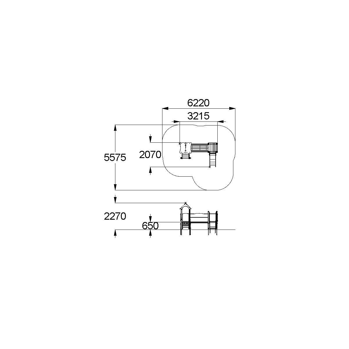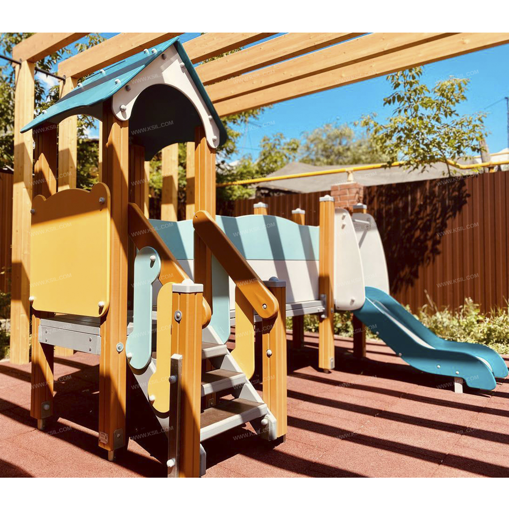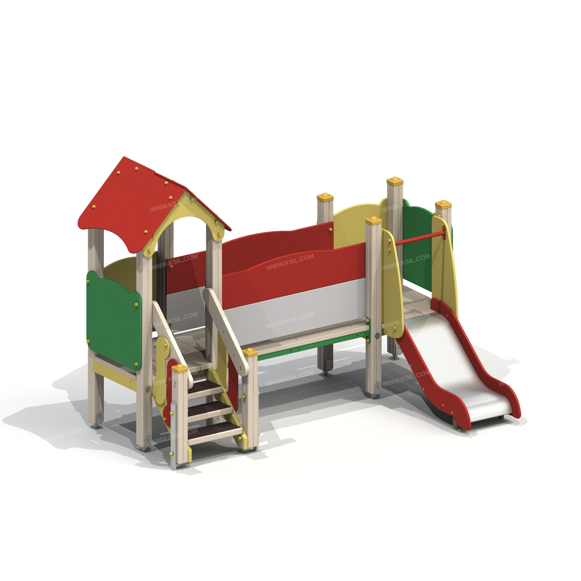 Детский игровой комплекс должен представлять собой модульную сборно-разборную конструкцию, состоящую из 2-х башен, одна из которых с крышей и соединенных между собой прямым мостом.К башне 1 с крышей должны быть пристроены: лестница, фанерное ограждение.К башне 2 должны быть пристроены: горка, фанерное ограждение.Несущие столбы комплекса должны быть выполнены из клееного деревянного бруса сечением не менее 100х100 мм и иметь скругленный профиль с канавкой посередине. Сверху открытый столб должен заканчиваться пластиковой заглушкой, снизу столб должен заканчиваться металлическим оцинкованным подпятником диаметром не менее 42 мм, который бетонируется в землю.Пол башен должен быть выполнен из деревянной доски толщиной не менее 40 мм.Крыша башни должна состоять из 2-х скатов и 2-х фронтов, выполненных из влагостойкой фанеры толщиной не менее 15 мм.Ограждения башен должны быть выполнены из влагостойкой фанеры толщиной не менее 21 мм. Горка должна состоять из ската, бортиков, защитной секции и защитной перекладины. Горка должна иметь стартовый участок высотой не менее 650 мм, участок скольжения и конечный участок. Скат должен быть изготовлен из единого листа нержавеющей стали толщиной 1,5 мм, утопленный в паз бортиков горки. Бортики горки, выполненные из влагостойкой фанеры толщиной не менее 21 мм должны быть высотой не менее 100 мм. Защитная перекладина должна быть выполнена из металлической трубы диаметром не менее 33 мм, побуждающая ребенка присесть и установлена на высоте не менее 600 мм от уровня поверхности стартового участка горки. Защитная секция горки должна быть выполнена из влагостойкой фанеры толщиной не менее 21 мм. Лестница высотой не менее 650 мм должна быть оснащена перилами, выполненные из деревянной доски толщиной не менее 40 мм, с декоративными накладными элементами из влагостойкой фанеры толщиной 15 мм. Перила должны быть установлены от первой ступени. Ступени лестниц должны быть выполнены из ламинированной противоскользящей влагостойкой фанеры толщиной не менее 15 мм и деревянной доски толщиной 40 мм, склеенных между собой. Расстояние между ступенями должно быть одинаковым. Прямой мост должен состоять из металлического каркаса, настила и ограждения. Настил должен быть выполнен из деревянных досок толщиной не менее 40 мм. Ограждение моста должно быть выполнены из влагостойкой фанеры толщиной не менее 21 мм. Металлический каркас моста должен быть разборным и состоять из металлической профильной трубы сечением не менее 50х25 мм.