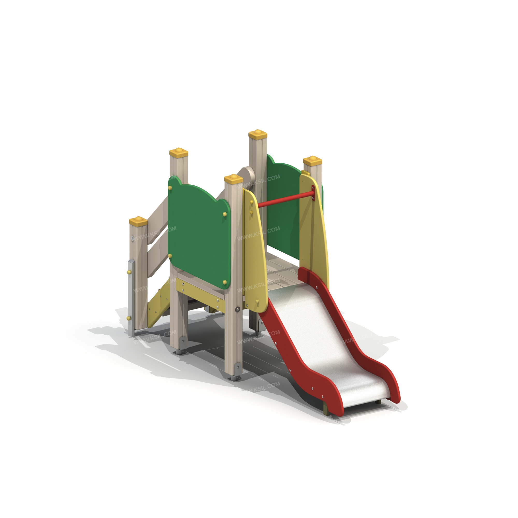 Детский игровой комплекс должен представлять собой модульную сборно-разборную конструкцию, состоящую из одной башни с горкой, лестницей и ограждениями.Несущие столбы комплекса должны быть выполнены из клееного деревянного бруса сечением не менее 100х100 мм и иметь скругленный профиль с канавкой посередине. Сверху столб должен заканчиваться пластиковой заглушкой, снизу столб должен заканчиваться металлическим оцинкованным подпятником диаметром не менее 42 мм, который бетонируется в землю.Пол башни должен быть выполнен из деревянной доски толщиной не менее 40 мм.Горка должна состоять из ската, бортиков, защитной секции и защитной перекладины. Горка должна иметь стартовый участок высотой не менее 650 мм, участок скольжения и конечный участок. Скат должен быть изготовлен из единого листа нержавеющей стали толщиной 1,5 мм, утопленный в паз бортиков горки. Бортики горки должны быть высотой не менее 100 мм. Защитная перекладина должна быть выполнена из металлической трубы диаметром не менее 33 мм, побуждающая ребенка присесть и установлена на высоте не менее 600 мм от уровня поверхности стартового участка горки. Защитная секция горки должна быть выполнена из влагостойкой фанеры толщиной не менее 21 мм. Ограждение башни с волнообразной верхней гранью должно быть выполнено из влагостойкой фанеры толщиной не менее 21 мм. Лестница высотой не менее 650 мм должна быть оснащена перилами, выполненные из деревянной доски толщиной не менее 40 мм. Перила должны быть установлены от первой ступени. Ступени лестниц должны быть выполнены из ламинированной противоскользящей влагостойкой фанеры толщиной не менее 15 мм и деревянной доски толщиной 40 мм, склеенных между собой. Расстояние между ступенями должно быть одинаковым.