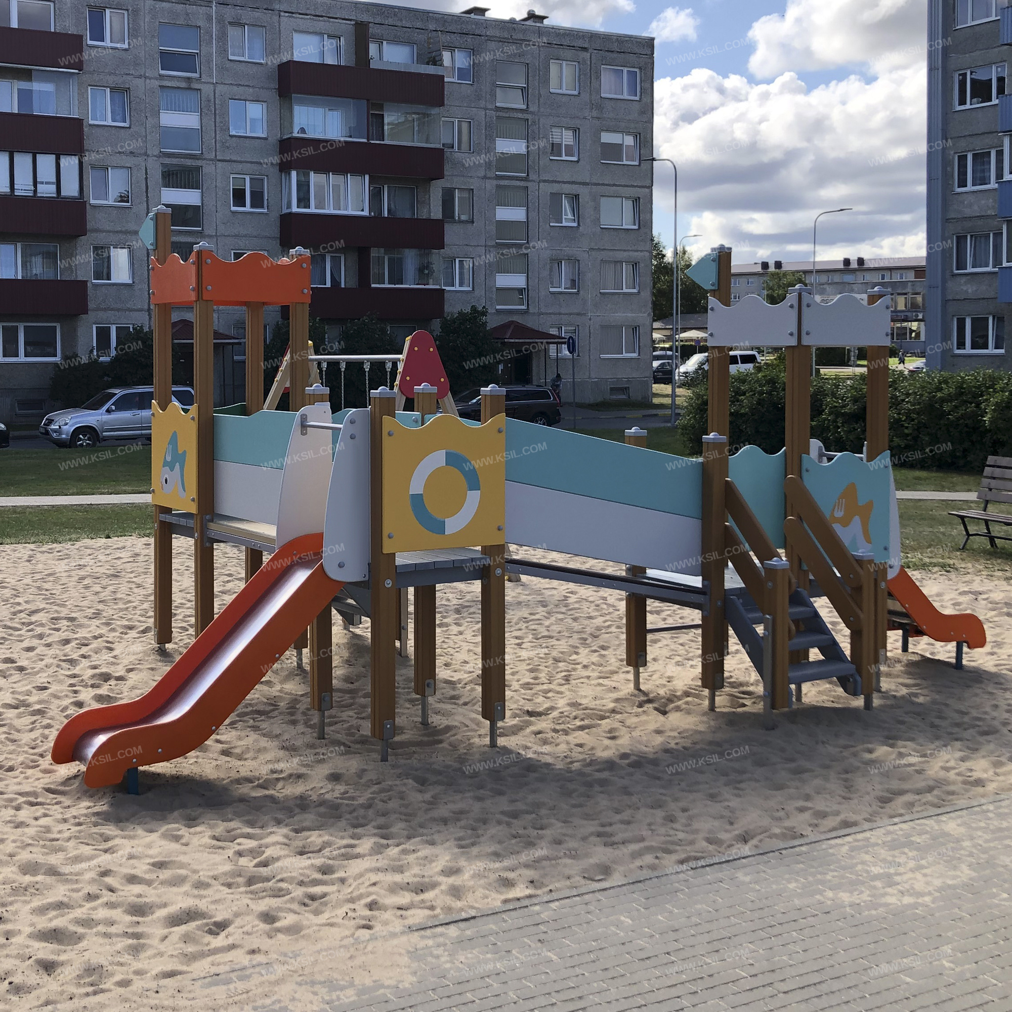 Детский игровой комплекс должен представлять собой модульную сборно-разборную конструкцию, стилизованную под сказку «Золотая рыбка». Детский комплекс должен состоять из 3-х башен с полубашней, соединенных между собой наклонным и прямым мостами. К башне 1 с имитацией крыши, с высотой площадки не менее 650 мм, должны быть пристроены: горка, фанерные ограждения, декоративный флаг и полубашня.К полубашне, с высотой площадки не менее 650 мм, должны быть пристроены: лестница, ограждение в виде перекладин и поручни.К башне 2, с высотой площадки не менее 950 мм, должны быть пристроены: горка, фанерное ограждение.К башне 3 с имитацией крыши, с высотой площадки не менее 950 мм, должны быть пристроены: лестница, фанерные ограждения и декоративный флаг.Несущие столбы комплекса должны быть выполнены из клееного деревянного бруса сечением не менее 100х100 мм и иметь скругленный профиль с канавкой посередине. Сверху столб должен заканчиваться пластиковой заглушкой, снизу столб должен заканчиваться металлическим оцинкованным подпятником диаметром не менее 42 мм, который бетонируется в землю.Пол башен должен быть выполнен из деревянной доски толщиной не менее 40 мм.Имитация крыши должна состоять из 4-х накладных элементов с волнообразной верхней гранью и декоративного элемента в виде якоря, выполненных из влагостойкой фанеры толщиной не менее 21 мм и не менее 9 мм.Ограждения с художественной росписью золотой рыбки и с декоративным элементом в виде спасательного круга должны быть выполнены из влагостойкой фанеры толщиной не менее 21 мм. Декоративные элементы должны быть выполнены из влагостойкой фанеры толщиной не менее 9 мм. Горки должны состоять из ската, бортиков, защитной секции и защитной перекладины. Горки должны иметь стартовый участок высотой не менее 650 мм и не менее 950 мм, участок скольжения и конечный участок. Скат должен быть изготовлен из единого листа нержавеющей стали толщиной 1,5 мм, утопленный в паз бортиков горки. Бортики горки, выполненные из влагостойкой фанеры толщиной не менее 21 мм должны быть высотой не менее 100 мм. Защитная перекладина должна быть выполнена из металлической трубы диаметром не менее 33 мм, побуждающая ребенка присесть и установлена на высоте не менее 600 мм от уровня поверхности стартового участка горки. Защитная секция горки должна быть выполнена из влагостойкой фанеры толщиной не менее 21 мм. Лестницы высотой не менее 650 мм и не менее 950 мм должны быть оснащены перилами, выполненные из деревянной доски толщиной не менее 40 мм. Перила должны быть установлены от первой ступени. Ступени лестниц должны быть выполнены из ламинированной противоскользящей влагостойкой фанеры толщиной не менее 15 мм и деревянной доски толщиной 40 мм, склеенных между собой. Расстояние между ступенями должно быть одинаковым. Ограждение в виде перекладин должно быть выполнено из металлических труб диаметром не менее 33 мм. Прямой мост должен состоять из металлического каркаса, настила и ограждения. Настил должен быть выполнен из деревянных досок толщиной не менее 40 мм. Ограждение моста должны быть выполнены из влагостойкой фанеры толщиной не менее 21 мм. Металлический каркас моста должен быть разборным и состоять из металлической профильной трубы сечением не менее 50х25 мм. Наклонный мост должен состоять из металлического каркаса, настила и огр