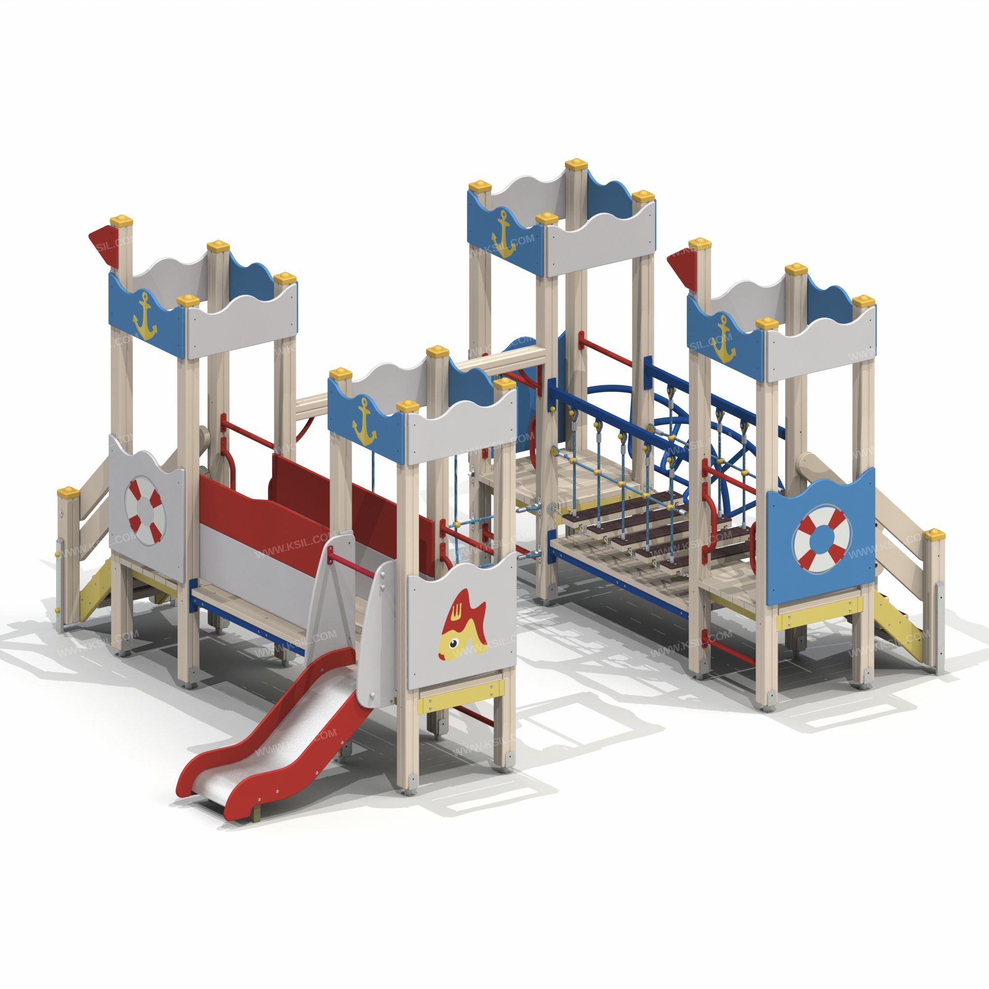 Детский игровой комплекс должен представлять собой модульную сборно-разборную конструкцию, стилизованную под сказу «Золотая рыбка». Детский комплекс должен состоять из 4-х башен с имитацией крыш и соединенных между собой подвесным мостом, прямым мостом и вертикальной полипропиленовой сеткой для лазания.