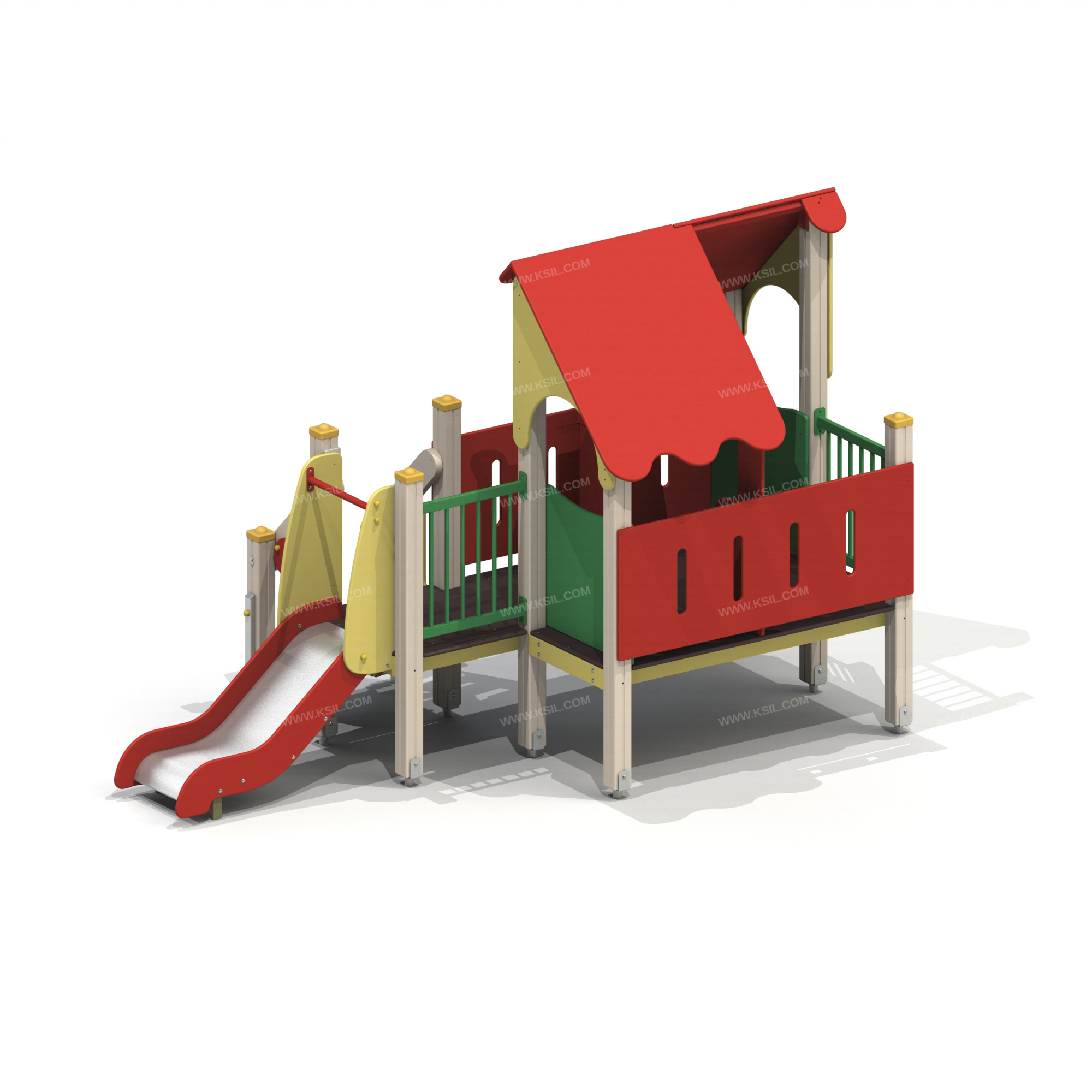 Детский игровой комплекс должен представлять собой модульную сборно-разборную конструкцию, состоящую из башни с крышей с двумя балконами и одной полубашни. Угловой балкон должен быть установлен в образовавшемся внешнем углу между башней и полубашней. К башне с крышей должны быть пристроены: фанерные ограждения и ограждения, перегородки, балконы радиусный и угловой. К полубашне должны быть пристроены: горка, лестница.Несущие столбы комплекса должны быть выполнены из клееного деревянного бруса сечением не менее 100х100 мм и иметь скругленный профиль с канавкой посередине. Сверху столб должен заканчиваться пластиковой заглушкой, снизу столб должен заканчиваться металлическим оцинкованным подпятником диаметром не менее 42 мм, который бетонируется в землю.Пол башни, полубашни должен быть выполнен из влагостойкой противоскользящей фанеры толщиной не менее 21 мм. Крыша башни должна быть двускатной, не сплошной, частично закрывающая площадь пола, визуально деля его на две части. Скаты и фронтоны крыши должны быть изготовлены из влагостойкой фанеры толщиной не менее 21 мм.Горка должна состоять из ската, бортиков, защитной секции и защитной перекладины. Горка должна иметь стартовый участок высотой не менее 630 мм, участок скольжения и конечный участок. Скат должен быть изготовлен из единого листа нержавеющей стали толщиной 1,5 мм, утопленный в паз бортиков горки. Бортики горки, выполненные из влагостойкой фанеры толщиной не менее 21 мм должны быть высотой не менее 100 мм. Защитная перекладина должна быть выполнена из металлической трубы диаметром не менее 33 мм, побуждающая ребенка присесть и установлена на высоте не менее 600 мм от уровня поверхности стартового участка горки. Защитная секция горки должна быть выполнена из влагостойкой фанеры толщиной не менее 21 мм. Ограждение башни и полубашни, перегородки, должны быть выполнены из влагостойкой фанеры толщиной не менее 15 мм и не менее 21 мм. Лестница высотой не менее 630 мм должна быть оснащена перилами, выполненнми из деревянной доски толщиной не менее 40 мм с декоративными накладными элементами из влагостойкой фанеры толщиной не менее 15 мм. Перила должны быть установлены от первой ступени. Ступени лестниц должны быть выполнены из ламинированной противоскользящей влагостойкой фанеры толщиной не менее 15 мм и деревянной доски толщиной 40 мм, склеенных между собой. Расстояние между ступенями должно быть одинаковым. Радиусный и угловой балконы должны состоять из пола, выполненного из влагостойкой ламинированной противоскользящей фанеры толщиной не менее 21 мм и металлического ограждения из труб диаметрами не менее 21 мм и не менее 33 мм.