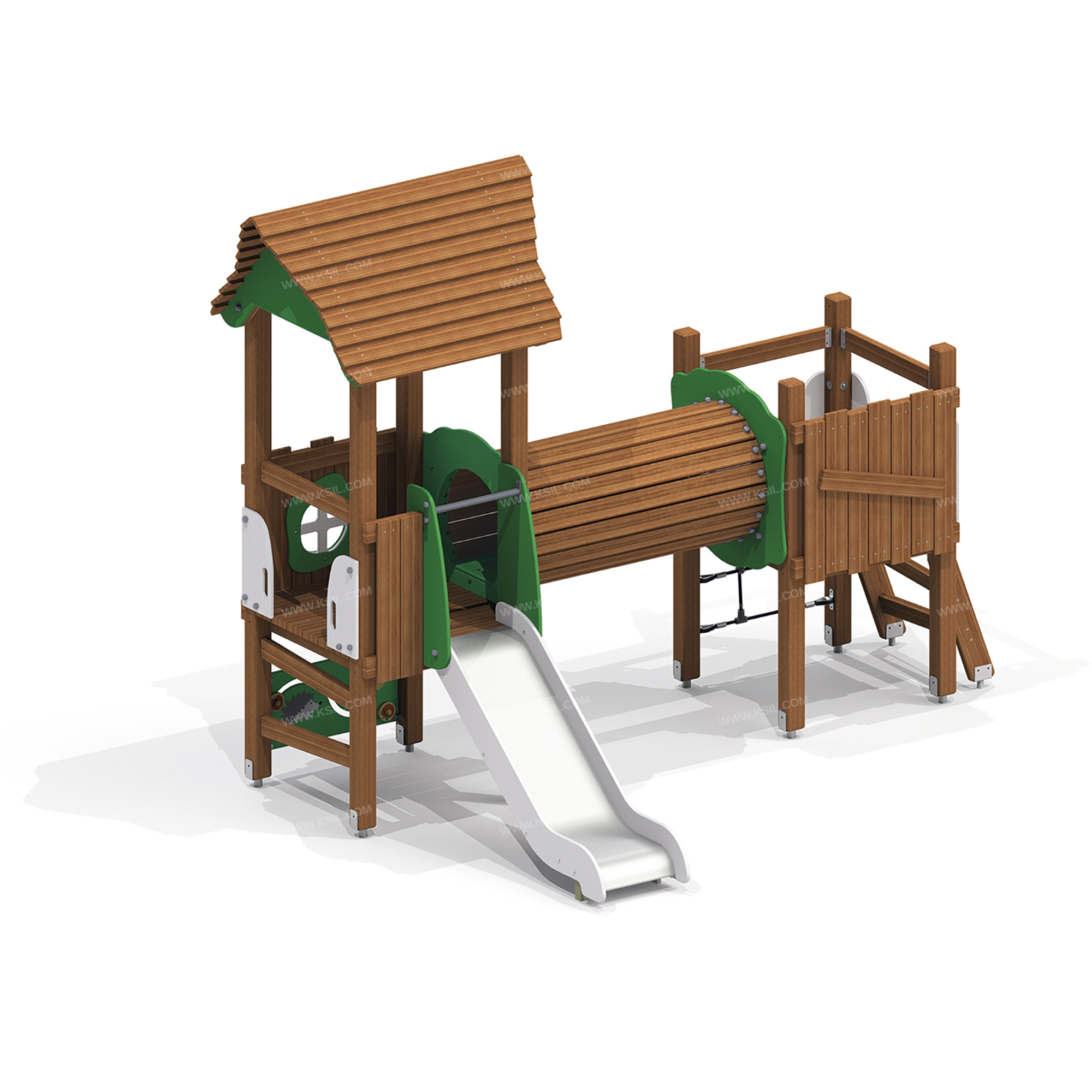 Детский игровой комплекс должен представлять собой модульную сборно-разборную конструкцию, состоящую из двух башен, одна из которых с крышей, соединенных между собой деревянным тоннелем. К башне 1 с крышей с высотой площадки не менее 950 мм, должны быть пристроены: горка, наборное ограждение с окном, игровая панель, вертикальная лазалка с фанерными поручнями.К башне 2 с высотой площадки не менее 950 мм, должны быть пристроены: наборное ограждение, наклонная лазалка с фанерными поручнями, сетка. Несущие столбы комплекса должны быть выполнены из лиственницы, брус сечением не менее 100х100 мм имеет скругленный профиль. Вертикальные столбы снизу должны заканчиваться металлическим оцинкованным подпятником диаметром не менее 42мм, который бетонируется в землю.Пол башен должен быть выполнен из деревянной доски лиственницы толщиной не менее 40 мм.Деревянный тоннель выполнен из досок лиственницы сечением не менее 100х40 мм, которые крепятся по окружности металлического обруча из листового металла толщиной не менее 3 мм. Обруч с двух сторон крепится к фигурным элементам, выполненным из влагостойкой фанеры толщиной не менее 21 мм. По низу деревянного тоннеля изнутри закреплен настил для удобного перемещения по тоннелю. Насти выполнен из влагостойкой фанеры толщиной не менее 21 мм.Горка, с высотой стартового участка не менее 950 мм должна состоять из ската, бортиков высотой не менее 100 мм, защитной перекладины, выполненной из металлической трубы диаметром не менее 33 мм, побуждающая ребенка присесть и установлена на высоте не менее 600 мм от уровня поверхности стартового участка горки. Защитная секция и бортики горок, должны быть выполнены из влагостойкой фанеры толщиной не менее 21 мм. Скат должен быть изготовлен из единого листа нержавеющей стали толщиной 1,5 мм, утопленный в паз бортиков горки.Ограждение наборное с окном состоит из направляющих досок сечением 40*100мм, на которые крепятся вертикальные доски сечением 115х20 мм и 130х20 мм, окно из влагостойкой фанеры толщиной не менее 21 мм и наличники с двух сторон из влагостойкой фанеры толщиной не менее 15 мм.Ограждение наборное состоит из направляющих досок сечением 40*100мм, на которые крепятся вертикальные доски сечением 115х20 мм и 130х20 мм и наклонная доска сечением не менее 100х30 мм.Крыша состоит из двух скатов, которые выполнены из деревянных досок лиственницы сечением не менее 115х20, деревянных стропил сечением не менее 140х40 и декоративных накладок, выполненных из влагостойкой фанеры толщиной не менее 21 мм. Стропила крыши соединяются между собой с помощью пластины, выполненной из листового металла толщиной не менее 4 мм.Вертикальная лазалка выполнена из отдельных досок лиственницы сечением не менее 100х40 мм, которые крепятся к столбам комплекса под углом с помощью уголков из листового металла толщиной не менее 3 мм. Наклонная лазалка выполнена из досок лиственницы сечением не менее 100х40 мм, которые крепятся в пазы к двум направляющим из досок лиственницы сечением не менее 140х40 мм, закрепленным под углом к башне. Снизу направляющие опираются на металлические оцинкованные подпятники, выполненные из металлической трубы диаметром не менее 33 мм и листового металла толщиной не менее 4 мм.Фанерные поручни выполнены из влагостойкой фанеры толщиной не менее 21 мм. В поручнях должна быть прорезь для захвата рук