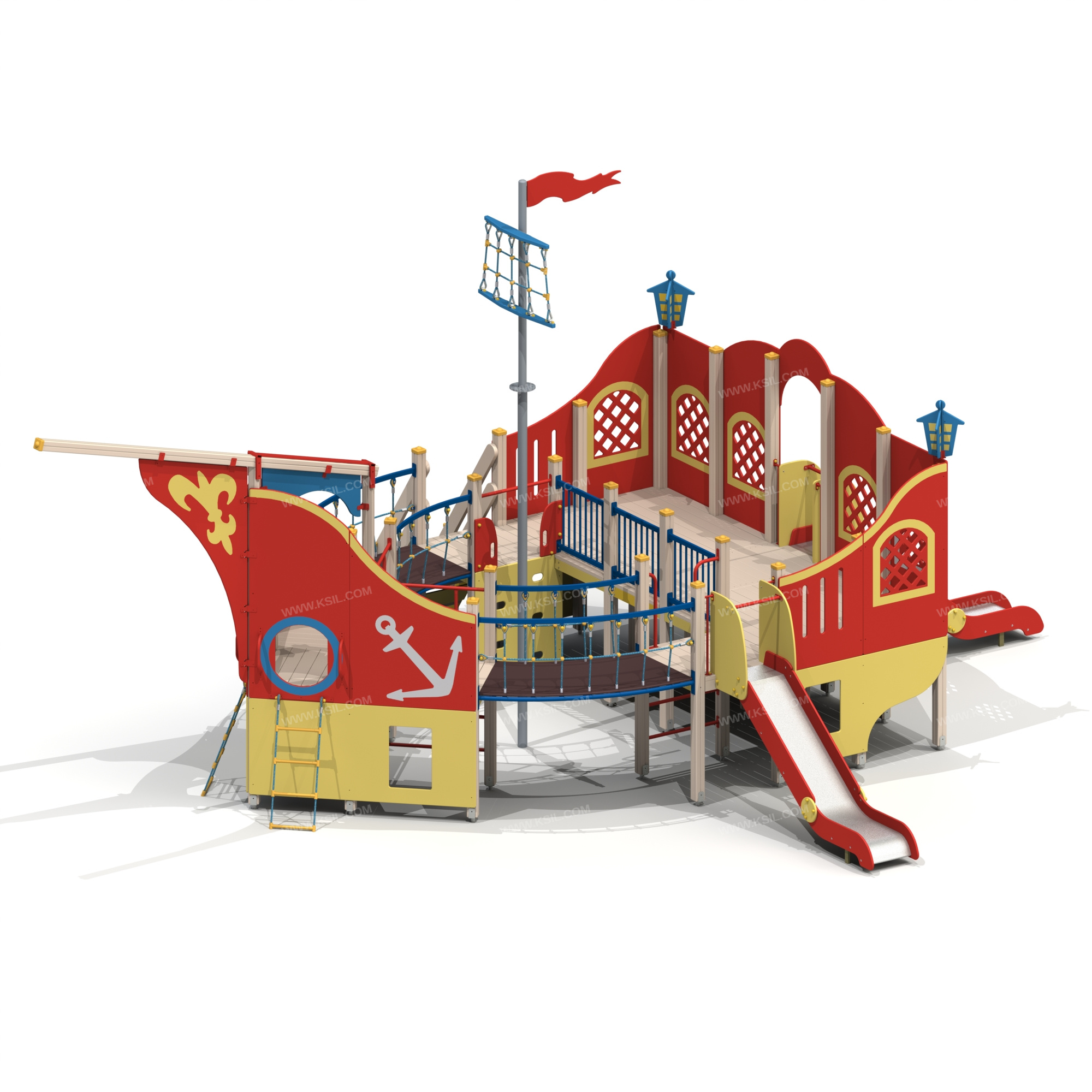 Детский игровой комплекс должен представлять собой модульную сборно-разборную конструкцию, стилизованную под бриг с декоративными элементами. Комплекс с одной металлической мачтой должен состоять из 2-х башен и 2-х полубашен, соединенных между собой 2-мя подвесными изогнутыми мостами.