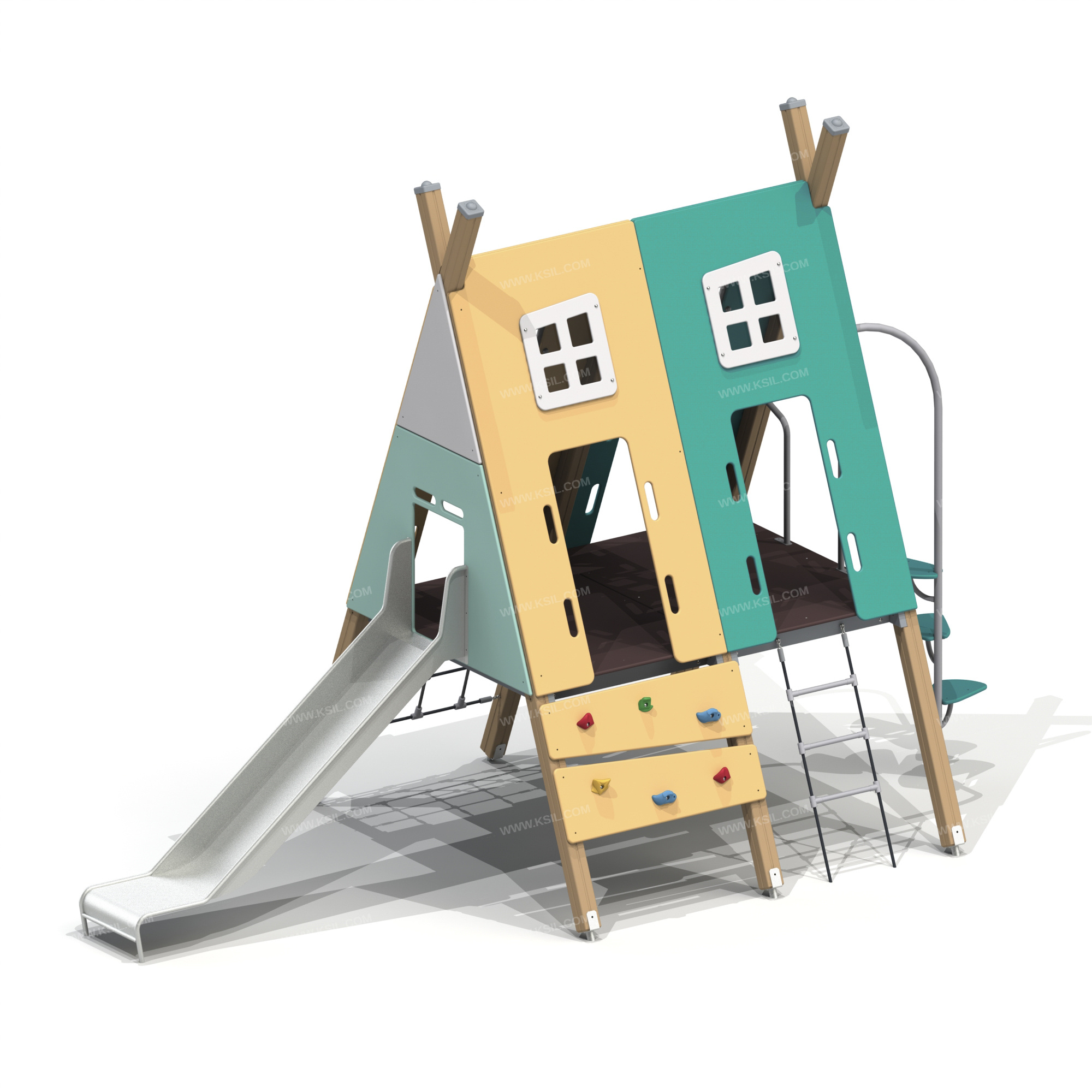 Металлические элементы должны быть покрыты порошковыми красками или подвергнуты гальванизации. Сварные швы должны быть гладкими и исключать возможность травмирования пользователей при контакте. Металлические элементы конструкции не должны состоять из нескольких частей, соединенных между собой.Весь крепеж должен быть оцинкован, все углы закруглены радиусом не менее 3 мм. Концы труб должны быть закрыты.Деревянный брус должен быть склеен под прессом из нескольких отборных сосновых досок, подвергнутых специальной обработке и сушке до мебельной влажности 7-10% для придания особой прочности несущим конструкциям.Деревянные доски/бруски хвойных пород дерева должны быть подвергнуты специальной обработке и сушке до мебельной влажности 7-10% для придания особой прочности несущим конструкциямФанера влагостойкая не ниже I сорта изготовленная из шлифованного березового шпона повышенной водостойкости, склеенного клеем класса эмиссии Е1 с предварительной заделкой (замазкой или вставками) естественных дефектов древесины.Материалы из древесины не должны иметь на поверхности дефектов обработки. Заглушки пластиковые на места резьбовых соединений.Промежутки и стыки между элементами оборудования не должны допускать застревания частей тела и одежды пользователей. В конструкции должна быть предусмотрена возможность доступа взрослого при обстоятельствах, требующих посторонней помощи пользователю.C целью повышения качества и безопасности продукции, в документацию на изделие могут вноситься изменения (изображение, размеры, и т.п.).