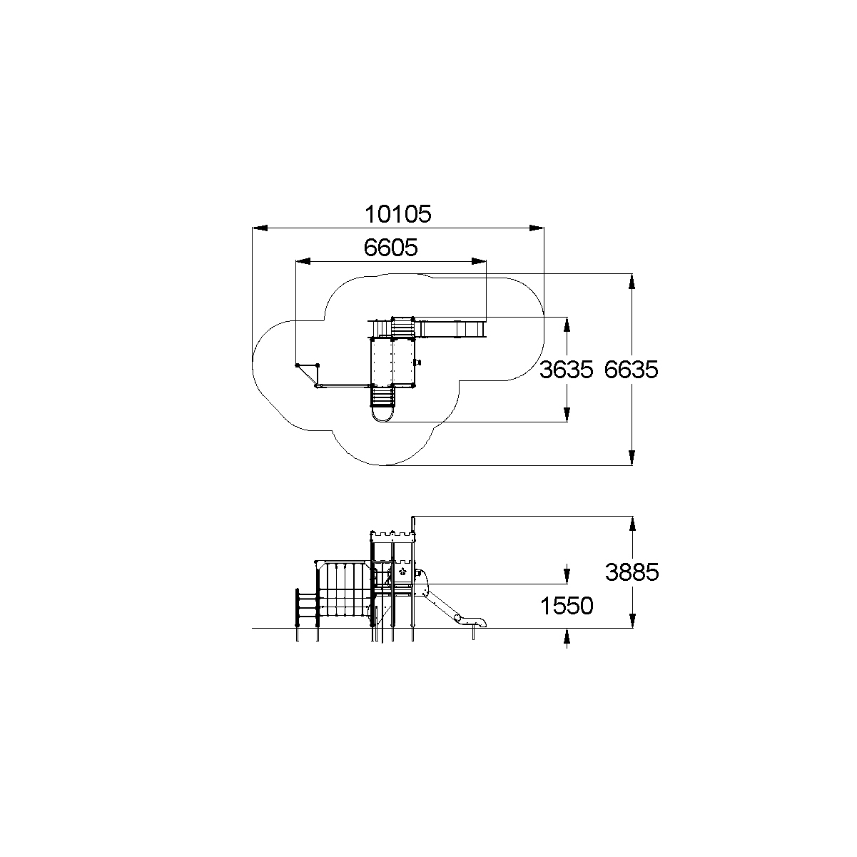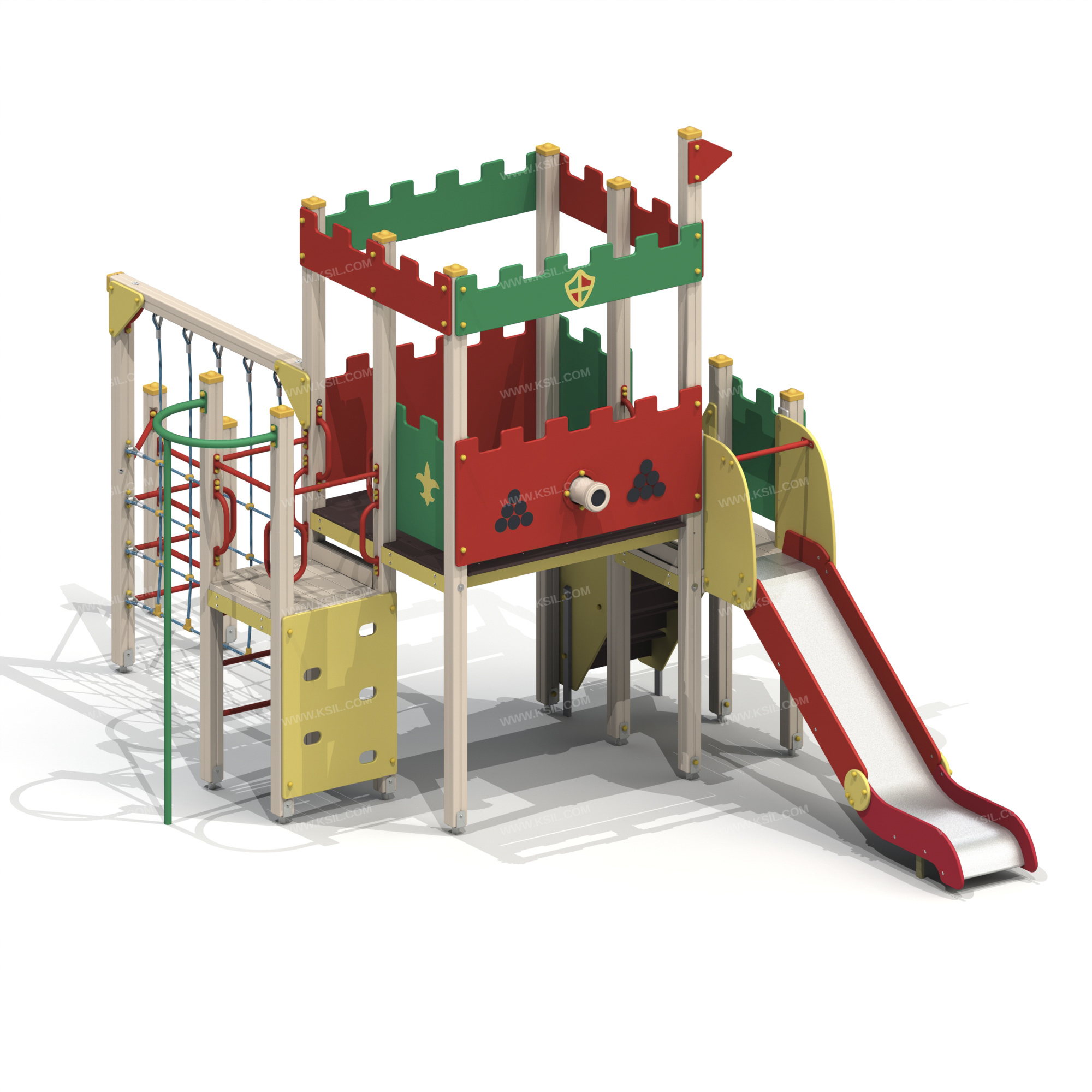 Детский игровой комплекс должен представлять собой модульную сборно-разборную конструкцию, состоящую из одной башни с 2-мя полубашнями и вынесенным гимнастическим комплексом. К башне с имитацией крыши, с высотой площадки не менее 1550 мм, должны быть пристроены: ограждения фанерные и ограждение фанерное с пушкой, имитация крыши, поручни.К полубашне 1 с высотой площадки не менее 1250 мм пристроены: горка, фанерное ограждение, фанерная лестница.К полубашне 2 с высотой площадки не менее 1250 мм пристроены: вертикальный шест с креплением в виде дуги, поручни, вертикальная лестница и ограждение в виде перекладин, альпинистская стенка.Вынесенный гимнастический комплекс должен состоять из полипропиленовой сетки для лазанья, шведских стенок и перекладины. Несущие столбы комплекса должны быть выполнены из клееного деревянного бруса сечением не менее 100х100 мм и иметь скругленный профиль с канавкой посередине. Сверху столб должен заканчиваться пластиковой заглушкой, снизу столб должен заканчиваться металлическим оцинкованным подпятником диаметром не менее 42 мм, который бетонируется в землю. К одному из столбов сверху должен крепиться декоративный флажок.Пол полубашен должен быть выполнен из деревянной доски толщиной не менее 40 мм.Пол башни должен быть выполнен из влагостойкой противоскользящей фанеры толщиной не менее 21 мм. Имитация крыши должна быть выполнена из влагостойкой фанеры толщиной не менее 21 мм в виде 4-х зубчатых элементов, к двум из которых должен крепиться декоративный элемент в виде герба. Горка должна состоять из каркаса, ската, бортиков, защитной секции и защитной перекладины. Каркас горки должен быть выполнен из металлической трубы сечением не менее 50х25 мм. Горка должна иметь стартовый участок высотой не менее 1250 мм, участок скольжения и конечный участок. Скат должен быть изготовлен из единого листа нержавеющей стали толщиной 1,5 мм, утопленный в паз бортиков горки. Бортики горки, выполненные из влагостойкой фанеры толщиной не менее 21 мм должны быть высотой не менее 150 мм. Защитная перекладина должна быть выполнена из металлической трубы диаметром не менее 33 мм, побуждающая ребенка присесть и установлена на высоте не менее 600 мм от уровня поверхности стартового участка горки. Защитная секция горки должна быть выполнена из влагостойкой фанеры толщиной не менее 21 мм. Ограждения башни и полубашни должны быть выполнены из влагостойкой фанеры толщиной не менее 21 мм. Альпинистская стенка с отверстиями для рук и ног должна быть выполнена из влагостойкой фанеры толщиной не менее 21 мм.Лестница с высотой не менее 1250мм должна быть оснащена 2-я бортами, выполненными из влагостойкой фанеры толщиной не менее 21мм и поручнем. Один борт имеет отверстия для рук, а на другом борте крепится поручень. Борта должны быть установлены от первой ступени. Ступени лестниц, выполнены из ламинированной противоскользящей влагостойкой фанеры толщиной не менее 21 мм. Расстояние между ступенями должно быть одинаковым.Вертикальный шест без спирали с креплением в виде дуги должен быть выполнен из металлической трубы диаметром не менее 42,3 мм. Нижняя часть шеста бетонируется в землю. Дуга выполнена из металлической трубы диаметром не менее 48 мм.Перекладины вертикальной лестницы, ограждение в виде перекладин, перекладины шведской стенки, поручни д