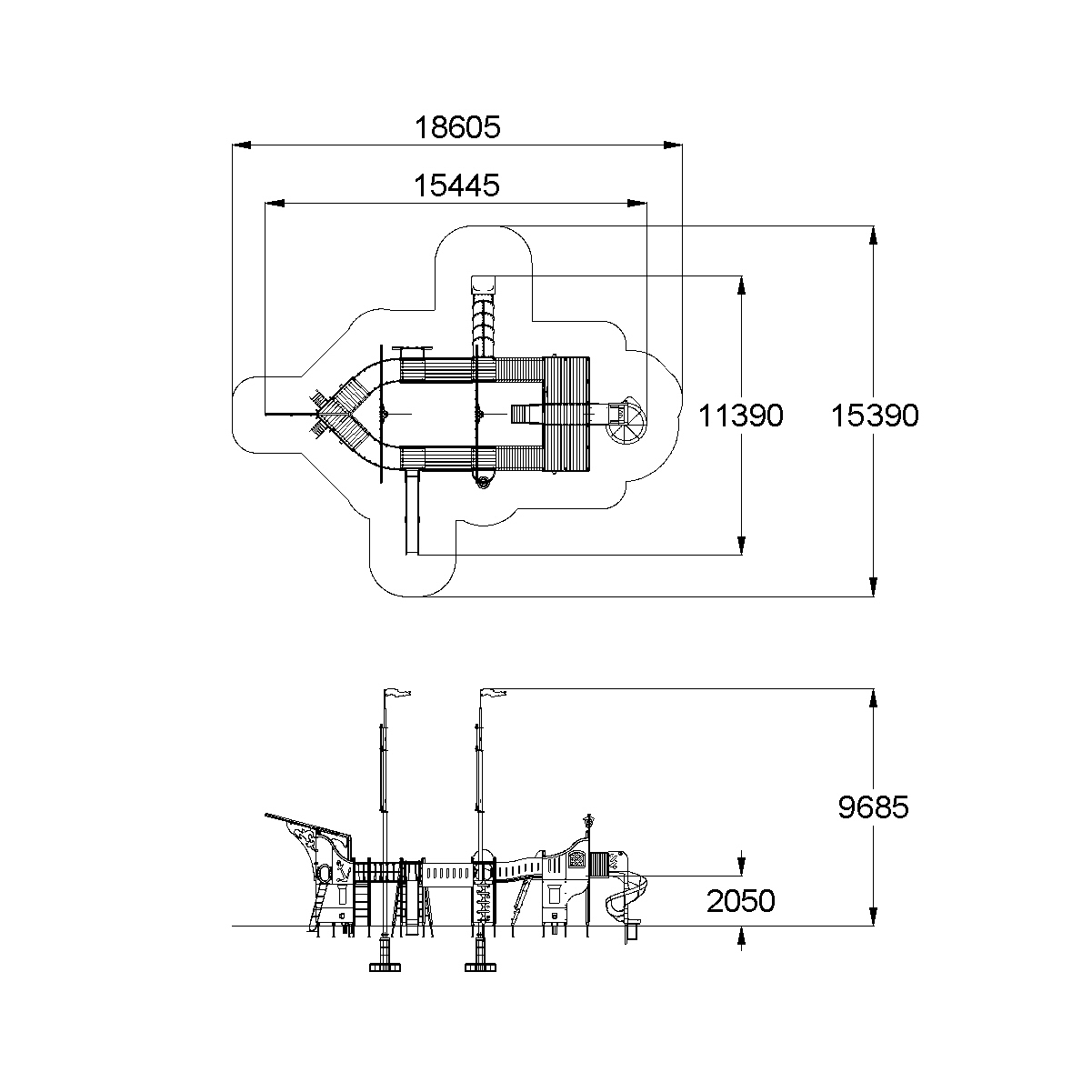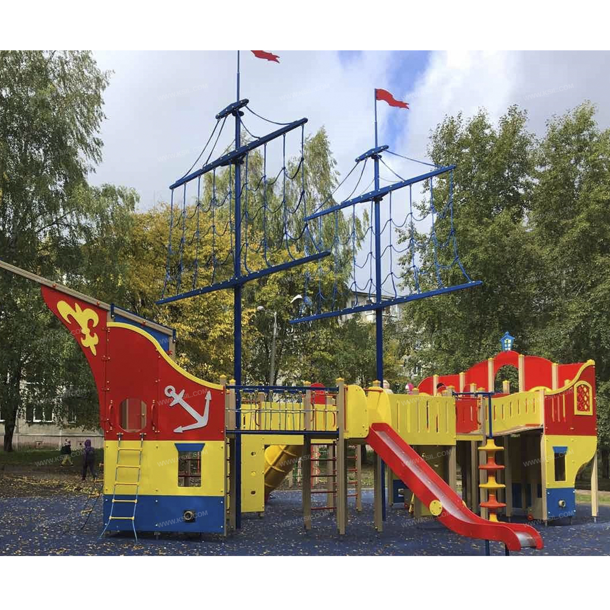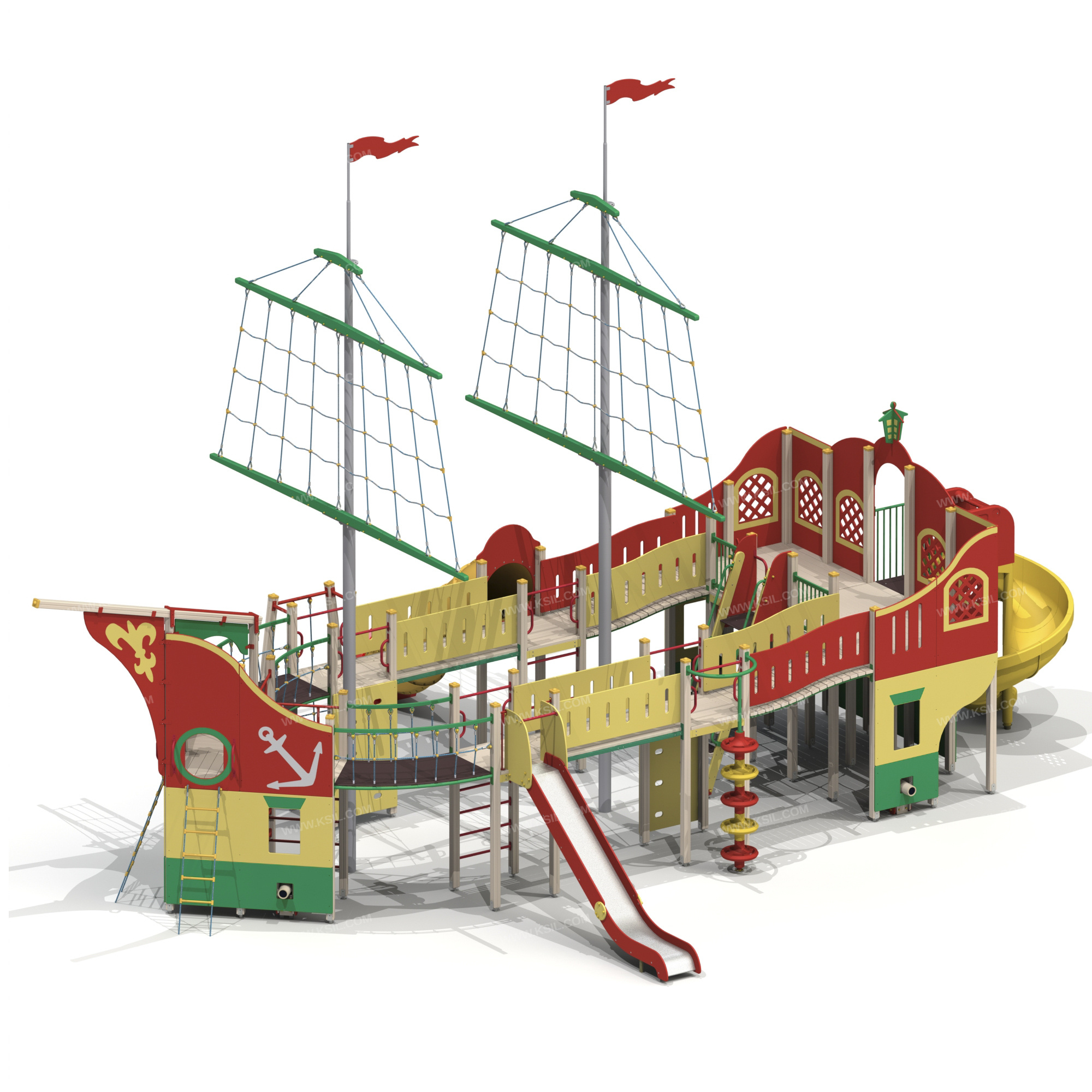 Детский игровой комплекс должен представлять собой модульную сборно-разборную конструкцию, стилизованную под корвет с декоративными элементами. Комплекс с двумя металлическими мачтами должен состоять из 6-ти башен, соединенных между собой 2-мя волнообразными, 2-мя радиальными и 2-мя прямыми мостами.К башне 1, с высотой площадки не менее 2050 мм, установленной в кормовой части корвета, должны быть пристроены: спиральная горка, фанерные ограждения с решетчатыми окошками, нижние боковые стенки с окошками и нижние передние стенки, арка с декоративным фонарем, лестница, металлическое ограждение решётка и металлическое ограждение со штурвалом, под площадкой башни должны быть расположены пушки.К башне 2, с высотой площадки не менее 1850 мм, установленной в боковой части корвета должны быть пристроены: вертикальный шест с колесами, альпинистская стенка с отверстиями для рук и ног, перекладины и поручни.К башне 3, с высотой площадки не менее 1850 мм, установленной в боковой части корвета должны быть пристроены: горка, вертикальная лестница, ограждение в виде перекладины, поручни. К башне 4, с высотой площадки не менее 1850 мм, установленной в носовой части корвета должны быть пристроены: два ограждения с круглым отверстием, гибкие лестницы, нижние боковые стенки с окошками, брус, имитирующий бушприт, под площадкой башни должны быть расположены пушки.К башне 5, с высотой площадки не менее 1850 мм, установленной в боковой части корвета должны быть пристроены: альпинистская стенка с отверстиями для руг и ног, трапециевидная полипропиленовая сетка для лазания, перекладины, поручни.К башне 6, с высотой площадки не менее 1850 мм, установленной в боковой части корвета должны быть пристроены: тоннельная горка, ограждение в виде перекладины, поручни, вертикальная лестница для лазанья.Несущие разновысокие столбы комплекса должны быть выполнены из клееного деревянного бруса сечением не менее 100х100 мм и иметь скругленный профиль с канавкой посередине. Сверху столб должен заканчиваться пластиковой заглушкой, снизу столб должен заканчиваться металлическим оцинкованным подпятником диаметром не менее 42 мм, который бетонируется в землю.Пол башен должен быть выполнен из деревянной доски толщиной не менее 40 мм.Приставная лестница высотой не менее 2050 мм должна быть оснащена поручнями, выполненными из металлической трубы диаметром не менее 33 мм. Ступени должны быть изготовлены из ламинированной нескользящей влагостойкой фанеры толщиной не менее 15 мм и деревянной доски толщиной 40 мм, склеенных между собой. Расстояние между ступенями должно быть одинаковым. В верхней части должны крепиться ограждающие стенки из влагостойкой фанеры толщиной не менее 21 мм.Горка должна состоять из каркаса, ската, бортиков, защитной секции и защитной перекладины. Каркас горки должен быть выполнен из металлической трубы сечением не менее 50х25 мм. Горка должна иметь стартовый участок высотой не менее 1850 мм, участок скольжения и конечный участок. Скат должен быть изготовлен из единого листа нержавеющей стали толщиной 1,5 мм, утопленный в паз бортиков горки. Бортики горки, выполненные из влагостойкой фанеры толщиной не менее 21 мм должны быть высотой не менее 150 мм. Защитная перекладина должна быть выполнена из металлической трубы диаметром не менее 33 мм, побуждающая ребенка присесть и 