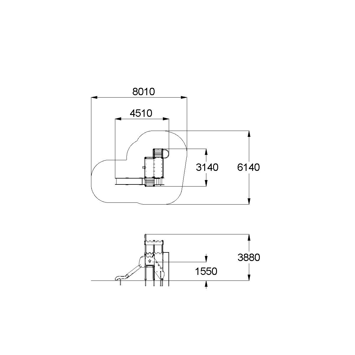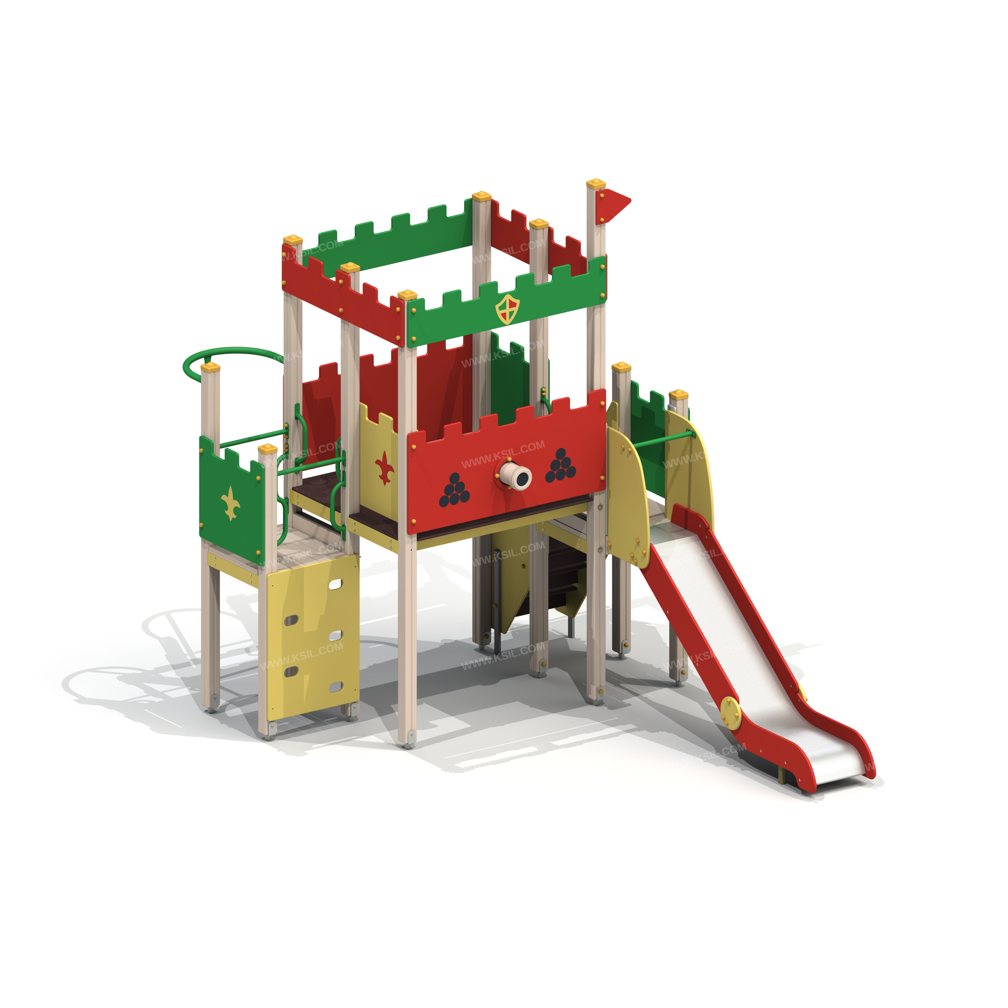 Детский игровой комплекс должен представлять собой модульную сборно-разборную конструкцию, состоящую из одной башни с 2-мя полубашнями.К башне с имитацией крыши, с высотой площадки не менее 1550 мм должны быть пристроены: ограждения фанерные, ограждение фанерное с пушкой, поручни.К полубашне 1 с высотой площадки не менее 1250 мм пристроены: горка, фанерное ограждение, фанерная лестница.К полубашне 2 с высотой площадки не менее 1250 мм пристроены: вертикальный шест без спирали и креплением в виде дуги, поручни, перекладины, альпинистская стенка. Несущие столбы комплекса должны быть выполнены из клееного деревянного бруса сечением не менее 100х100 мм и иметь скругленный профиль с канавкой посередине. Сверху столб должен заканчиваться пластиковой заглушкой, снизу столб должен заканчиваться металлическим оцинкованным подпятником диаметром не менее 42 мм, который бетонируется в землю. К одному из столбов сверху должен крепиться декоративный флажок.Пол полубашен должен быть выполнен из деревянной доски толщиной не менее 40 мм.Пол башни должен быть выполнен из влагостойкой противоскользящей фанеры толщиной не менее 21 мм. Имитация крыши должна быть в виде зубчатых накладных элементов по периметру башни из влагостойкой фанеры толщиной не менее 21 мм. Горка должна состоять из каркаса, ската, бортиков, защитной секции и защитной перекладины. Каркас горки должен быть выполнен из металлической трубы сечением не менее 50х25 мм. Горка должна иметь стартовый участок высотой не менее 1250 мм, участок скольжения и конечный участок. Скат должен быть изготовлен из единого листа нержавеющей стали толщиной 1,5 мм, утопленный в паз бортиков горки. Бортики горки, выполненные из влагостойкой фанеры толщиной не менее 21 мм должны быть высотой не менее 150 мм. Защитная перекладина должна быть выполнена из металлической трубы диаметром не менее 33 мм, побуждающая ребенка присесть и установлена на высоте не менее 600 мм от уровня поверхности стартового участка горки. Защитная секция горки должна быть выполнена из влагостойкой фанеры толщиной не менее 21 мм. Ограждение башни, ограждение полубашни должны быть выполнены из влагостойкой фанеры толщиной не менее 21 мм. Лестница с высотой не менее 1250мм должна быть оснащена 2-я бортами, выполненными из влагостойкой фанеры толщиной не менее 21мм и поручнем. Один борт имеет отверстия для рук, а на другом борте крепится поручень. Борта должны быть установлены от первой ступени. Ступени лестниц, выполнены из ламинированной противоскользящей влагостойкой фанеры толщиной не менее 21 мм. Расстояние между ступенями должно быть одинаковым.Альпинистская стенка с отверстиями для рук и ног должна быть выполнена из влагостойкой фанеры толщиной не менее 21 мм.Вертикальный шест без спирали с креплением в виде дуги должен быть выполнен из металлической трубы диаметром не менее 42 мм. Нижняя часть шеста бетонируется в землю.Перекладина, поручни должны быть выполнены из металлической трубы диаметром не менее 33 мм.