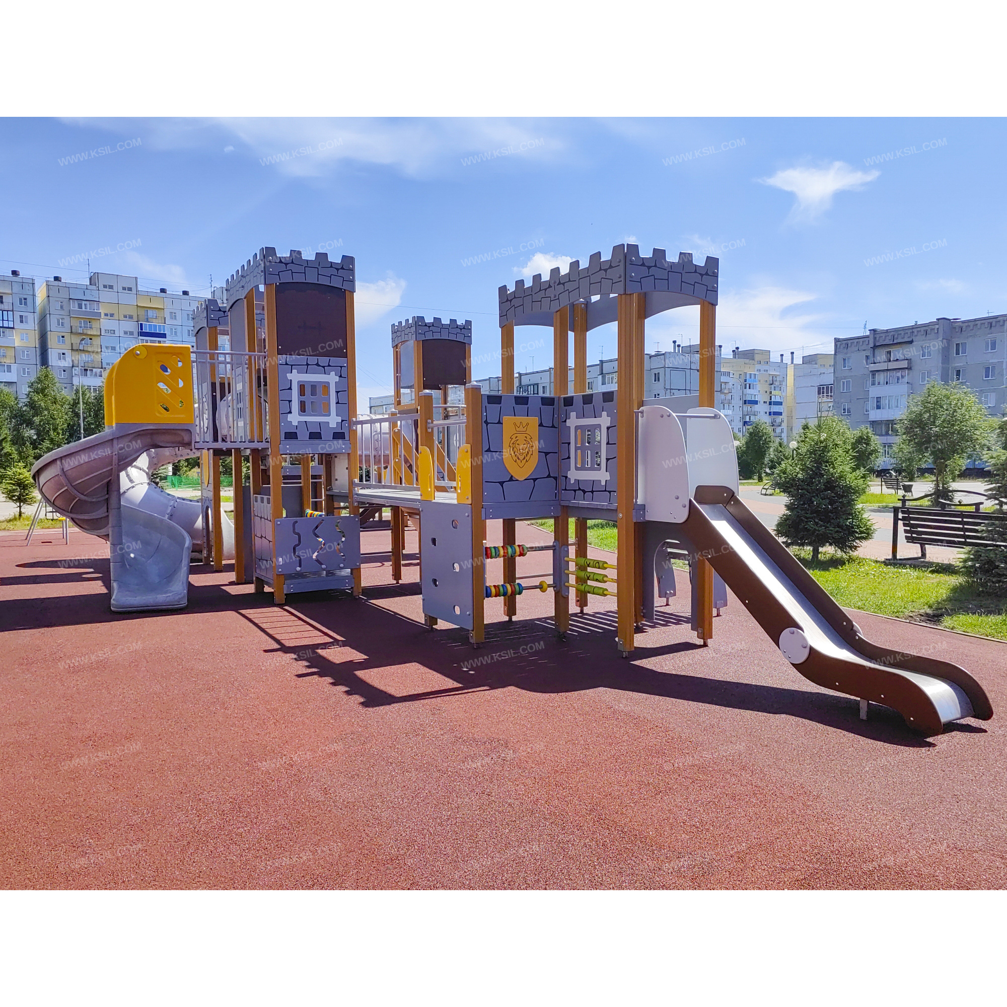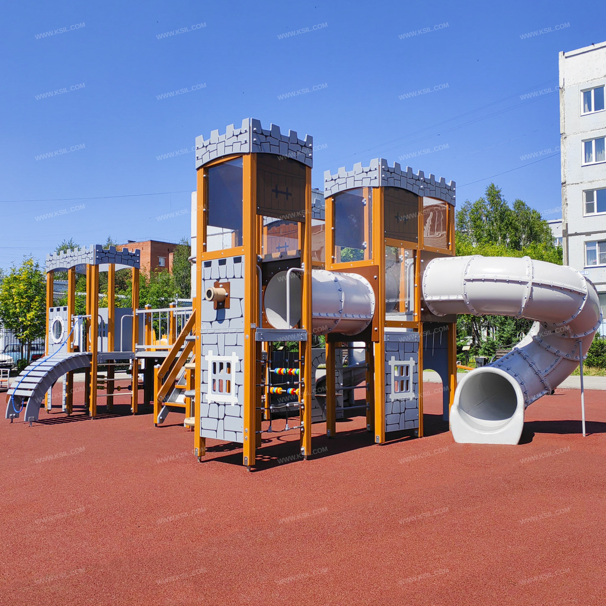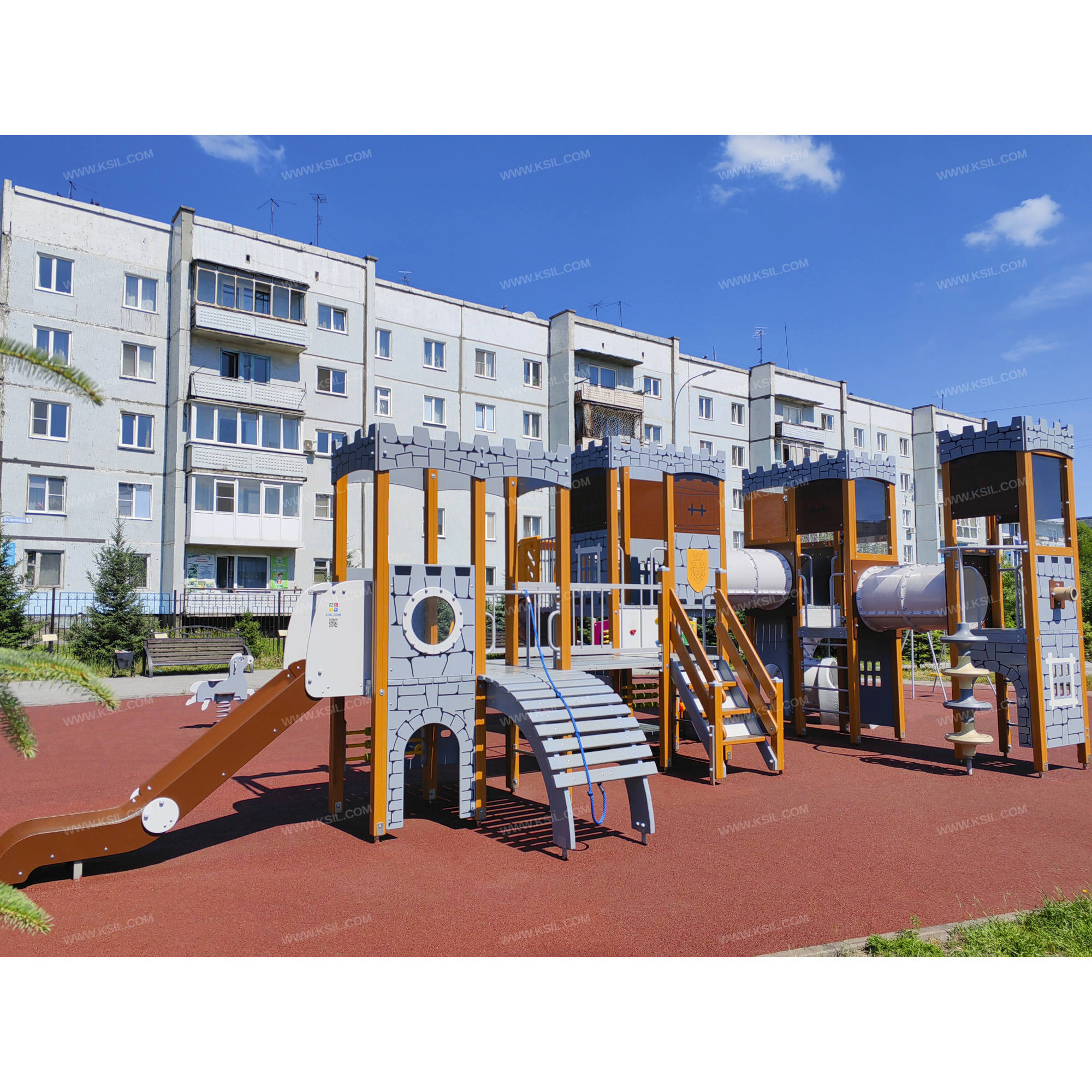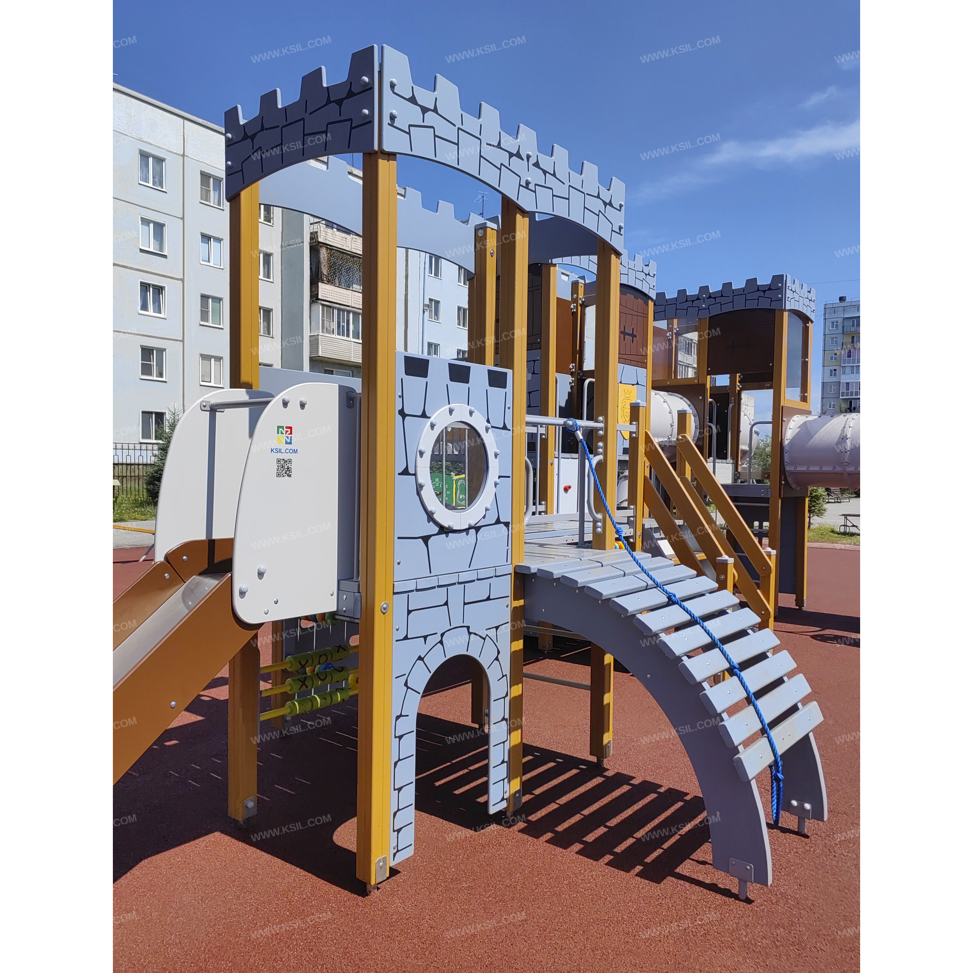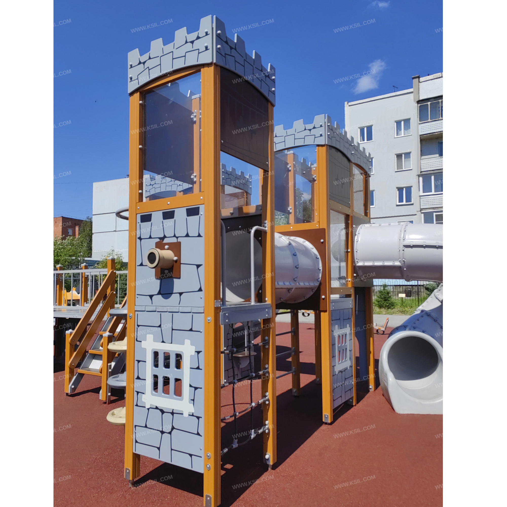 Детский игровой комплекс должен представлять собой модульную сборно-разборную конструкцию и состоять из одинарной одноуровневой башне, присоединённой к сдвоенной двухуровневой башне тоннельным переходом, к которой присоединена через тоннельный проход одноуровневая двойная башня с полубашней, которая соединяется с полубашней прямым мостом и присоединяется к одноуровневой двойной башне.К башне 1 с одним уровнем площадки 1550 мм, должны быть пристроены: тоннельный переход из нержавеющей стали, лаз для тоннельного перехода, Г-образные поручни, ограждение фанерное с изображением камней и окном, ограждение фанерное с изображением камней и имитацией пушки, ограждение фанерное с изображением ставней, ограждения фанерные с изображением камней и зубчатой верхней гранью, ограждение с поликарбонатом, полипропиленовая сетка, шест с кольцами.К башне 2 с разными уровнями площадок 1550 мм и 1850 мм, должны быть пристроены: ограждение фанерное с изображением ставней, ограждения фанерные с изображением камней и зубчатой верхней гранью, ограждение с поликарбонатом, тоннельный переход из нержавеющей стали, лаз для тоннельного перехода, шведская стенка, Г-образные поручни, ограждение фанерное с изображением камней и окном, ограждение фанерное нижнее с арочным проходом и изображением камней, ограждение фанерное с изображением камней и накладкой в виде герба с изображение льва, ограждение фанерное с изображением камней и иллюминатором из поликарбоната, тоннельная горка из нержавеющей стали, 2-е опоры под горку тоннель, лаз для тоннельной горки, вставка между уровнями. К башне 3 с одним уровнем площадки 1850 мм, должны быть пристроены: полубашня, тоннельная горка-труба, горловина для горки трубы, опоры под горку тоннель, Г-образные поручни, тоннельный переход из нержавеющей стали, лаз для тоннельного перехода, игровая панель, игровой элемент счеты, фанерный экран с окном и изображением камней со столиком, ограждения фанерные с изображением камней и окном, ограждение фанерное с изображением камней и накладкой в виде герба с изображение льва, ограждения фанерные с изображением ставней, ограждения фанерные с изображением камней и зубчатой верхней гранью, ограждение с поликарбонатом, альпинистская стенка, нижней пол, игровой элемент крестики нолики.К полубашне 1 с высотой площадки 1250 мм, должны быть пристроены: прямой мост, шведская стенка, Г-образные поручни, лестница.К полубашне 2 с высотой площадки 1250 мм должны быть пристроены: перекладина, прямой мост, игровой элемент счеты, ограждение фанерное с изображением камней и накладкой в виде герба с изображение льва, альпинистская стенка с отверстиями для рук и ног, поручни фанерные.К башне 4 с уровнями площадок 1250 мм, должны быть пристроены: горка-скат из нержавеющей стали, лаз для горки-скат с захватами, Г-образные поручни, перекладины шведской стенки, игровой элемент крестики нолики, ограждение фанерное с изображением камней и окном, ограждения фанерные с изображением камней и зубчатой верхней гранью, ограждение фанерное с изображением камней и имитацией пушки, трап-барабан с поручнями, ограждение фанерное нижнее с арочным проходом и изображением камней. Несущие столбы комплекса должны быть выполнены из клееного деревянного бруса сечением не менее 100х100 мм и иметь скругленный профиль с канавко