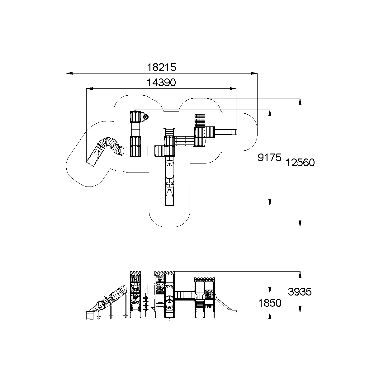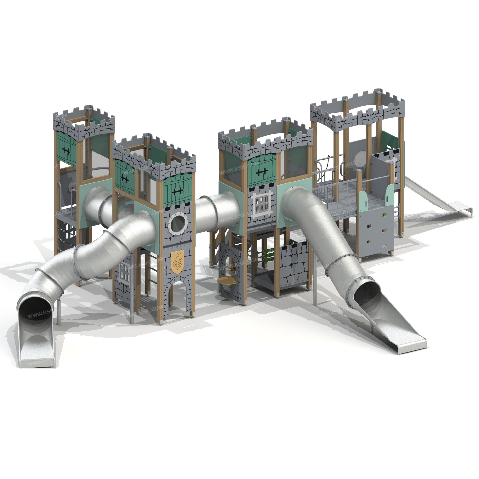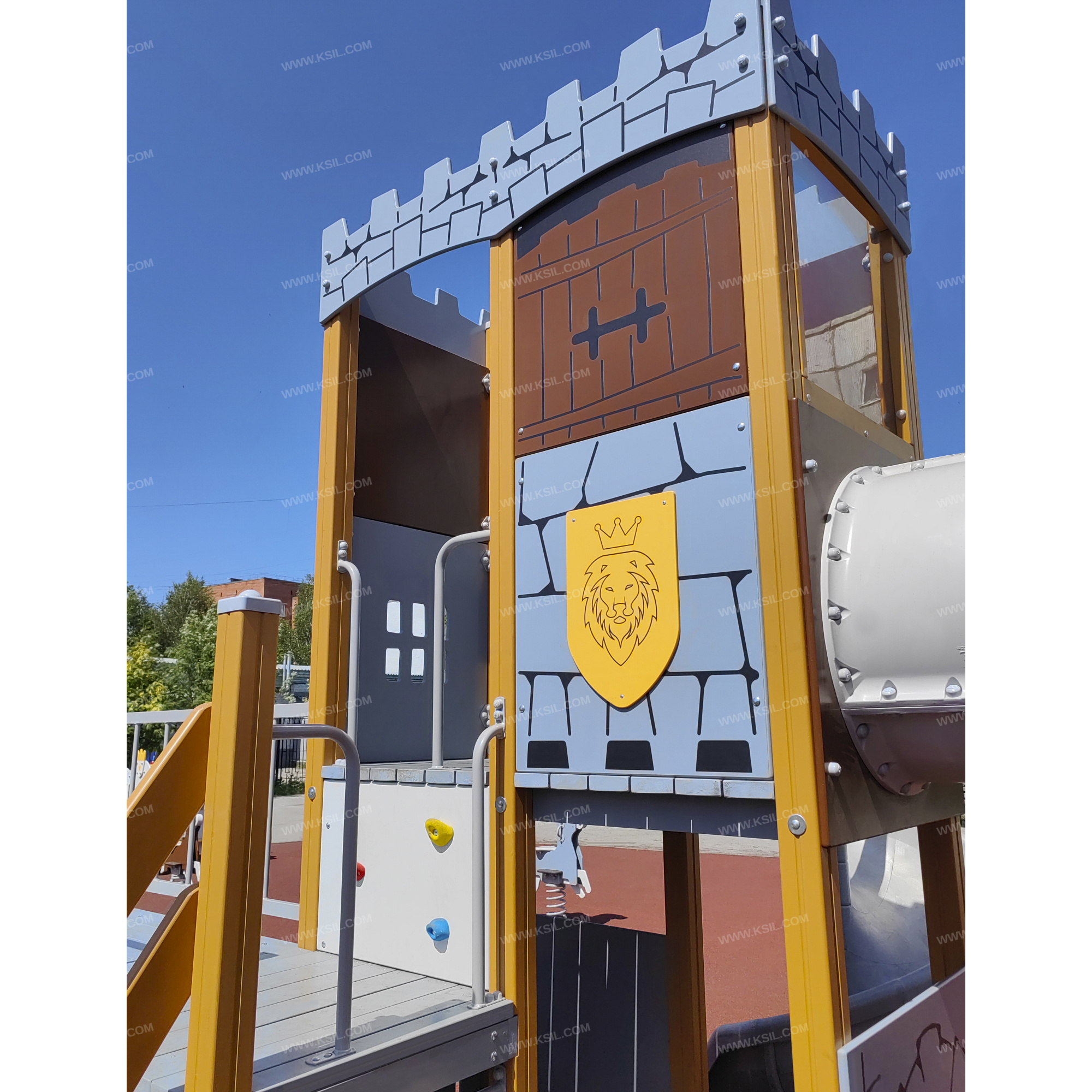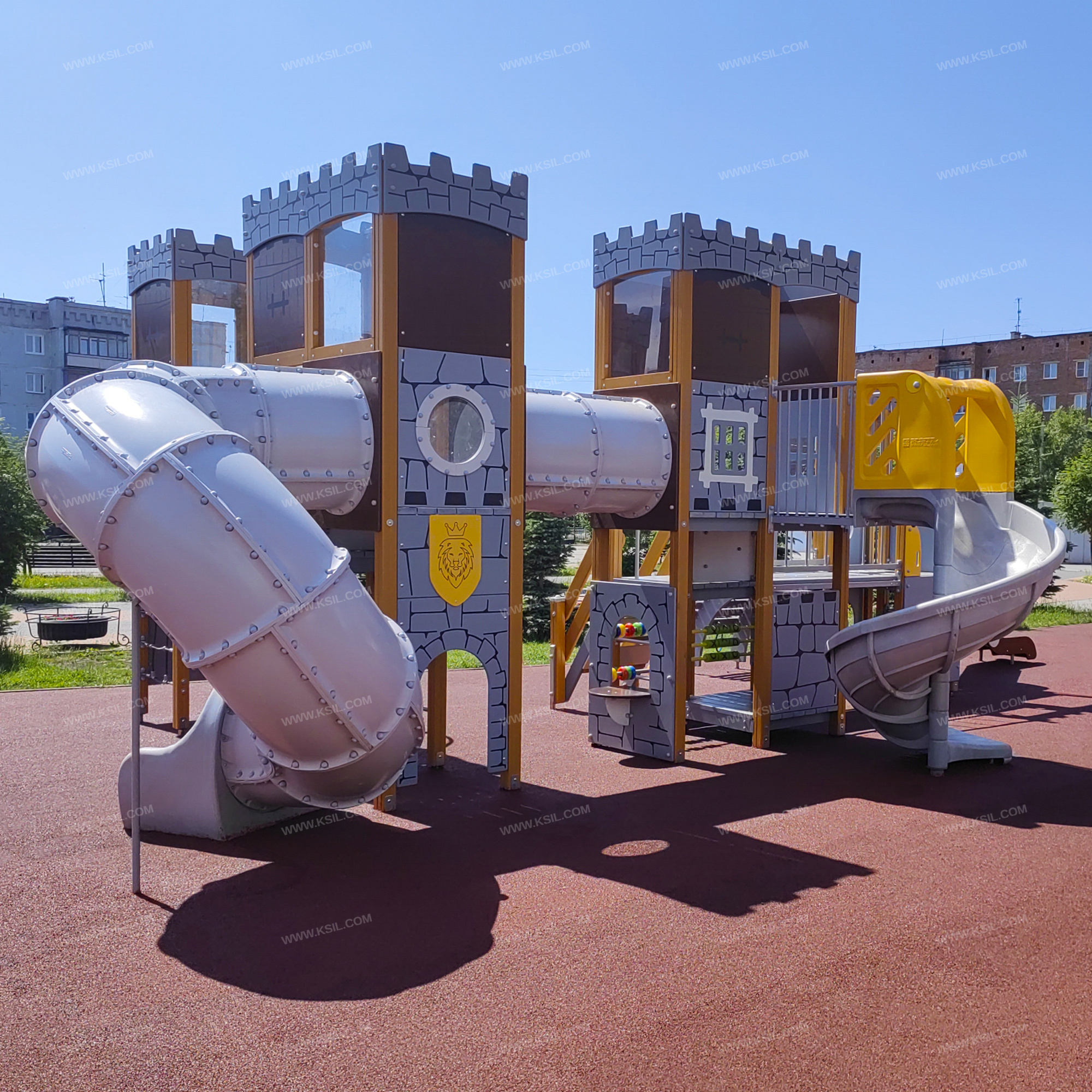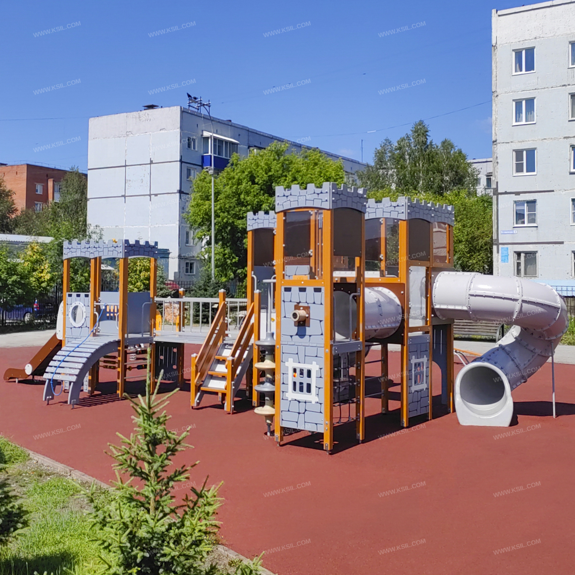 Детский игровой комплекс должен представлять собой модульную сборно-разборную конструкцию и состоять из одинарной одноуровневой башне, присоединённой к сдвоенной двухуровневой башне тоннельным переходом, к которой присоединена через тоннельный проход одноуровневая двойная башня с полубашней, которая соединяется с полубашней прямым мостом и присоединяется к одноуровневой двойной башне.К башне 1 с одним уровнем площадки 1550 мм, должны быть пристроены: тоннельный переход из нержавеющей стали, лаз для тоннельного перехода, Г-образные поручни, ограждение фанерное с изображением камней и окном, ограждение фанерное с изображением камней и имитацией пушки, ограждение фанерное с изображением ставней, ограждения фанерные с изображением камней и зубчатой верхней гранью, ограждение с поликарбонатом, полипропиленовая сетка, шест с кольцами.К башне 2 с разными уровнями площадок 1550 мм и 1850 мм, должны быть пристроены: ограждение фанерное с изображением ставней, ограждения фанерные с изображением камней и зубчатой верхней гранью, ограждение с поликарбонатом, тоннельный переход из нержавеющей стали, лаз для тоннельного перехода, шведская стенка, Г-образные поручни, ограждение фанерное с изображением камней и окном, ограждение фанерное нижнее с арочным проходом и изображением камней, ограждение фанерное с изображением камней и накладкой в виде герба с изображение льва, ограждение фанерное с изображением камней и иллюминатором из поликарбоната, тоннельная горка из нержавеющей стали, 2-е опоры под горку тоннель, лаз для тоннельной горки, вставка между уровнями. К башне 3 с одним уровнем площадки 1850 мм, должны быть пристроены: полубашня, тоннельная горка-труба, горловина для горки трубы, опоры под горку тоннель, Г-образные поручни, тоннельный переход из нержавеющей стали, лаз для тоннельного перехода, игровая панель, игровой элемент счеты, фанерный экран с окном и изображением камней со столиком, ограждения фанерные с изображением камней и окном, ограждение фанерное с изображением камней и накладкой в виде герба с изображение льва, ограждения фанерные с изображением ставней, ограждения фанерные с изображением камней и зубчатой верхней гранью, ограждение с поликарбонатом, альпинистская стенка, нижней пол, игровой элемент крестики нолики.К полубашне 1 с высотой площадки 1250 мм, должны быть пристроены: прямой мост, шведская стенка, Г-образные поручни, лестница.К полубашне 2 с высотой площадки 1250 мм должны быть пристроены: перекладина, прямой мост, игровой элемент счеты, ограждение фанерное с изображением камней и накладкой в виде герба с изображение льва, альпинистская стенка с отверстиями для рук и ног, поручни фанерные.К башне 4 с уровнями площадок 1250 мм, должны быть пристроены: горка-скат из нержавеющей стали, лаз для горки-скат с захватами, Г-образные поручни, перекладины шведской стенки, игровой элемент крестики нолики, ограждение фанерное с изображением камней и окном, ограждения фанерные с изображением камней и зубчатой верхней гранью, ограждение фанерное с изображением камней и имитацией пушки, трап-барабан с поручнями, ограждение фанерное нижнее с арочным проходом и изображением камней. Несущие столбы комплекса должны быть выполнены из клееного деревянного бруса сечением не менее 100х100 мм и иметь скругленный профиль с канавко