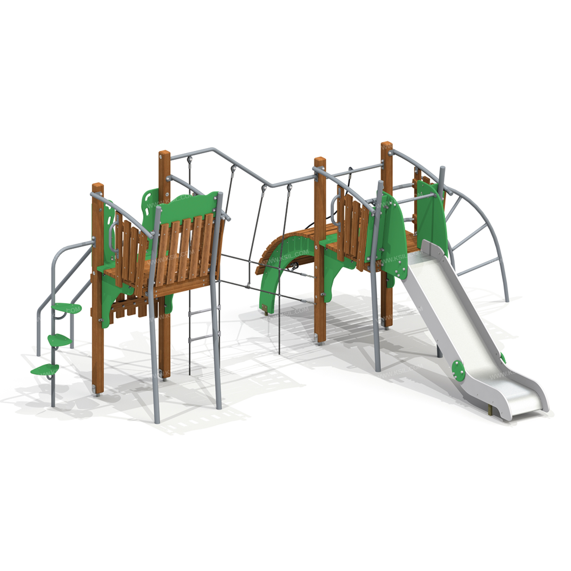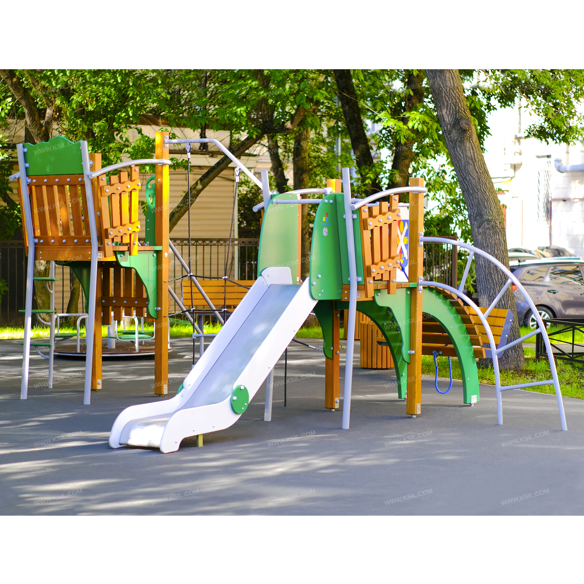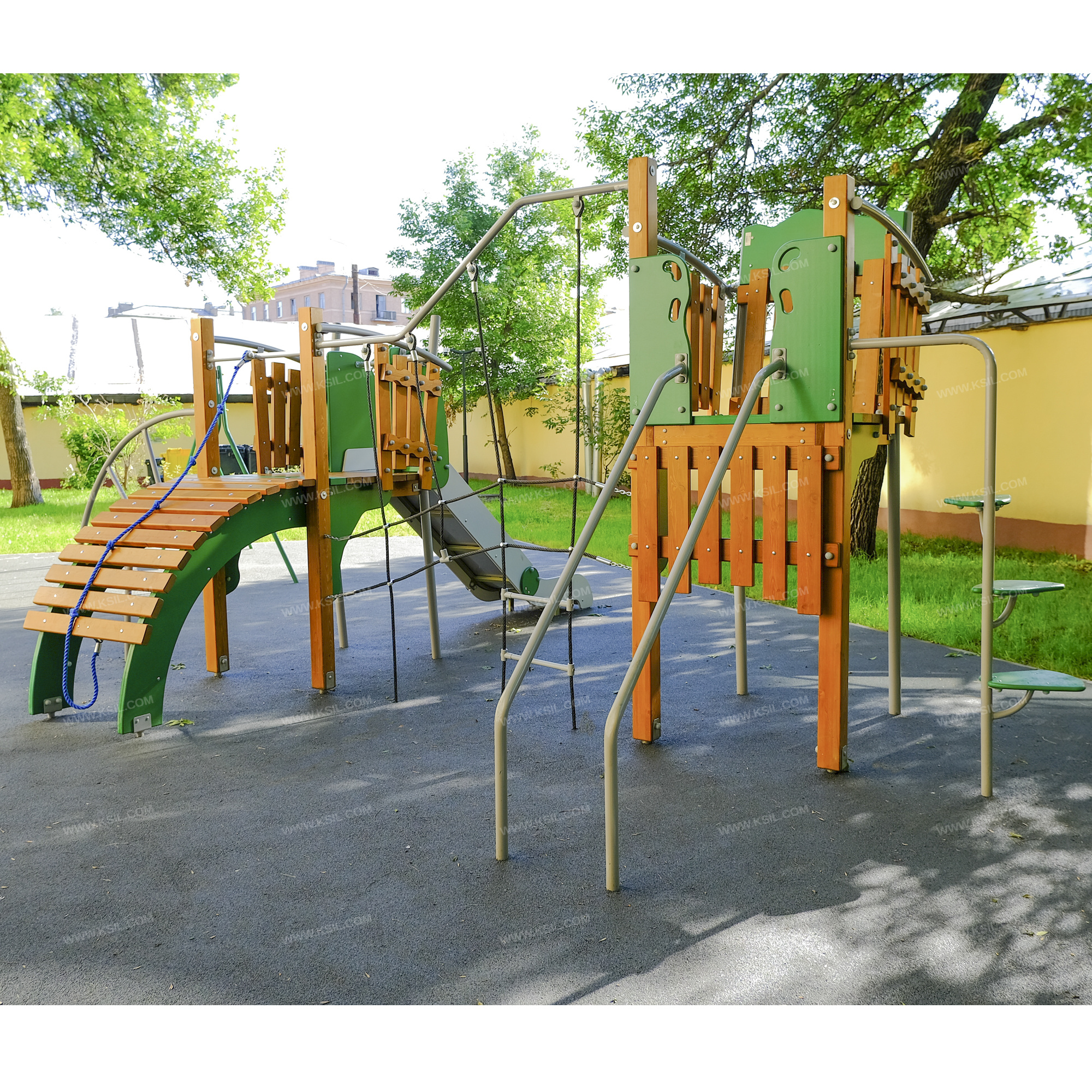 Металлические элементы должны быть покрыты порошковыми красками. Сварные швы должны быть гладкими и исключать возможность травмирования пользователей при контакте. Металлические элементы конструкции не должны состоять из нескольких частей, соединенных между собой.Весь крепеж должен быть оцинкован, все углы закруглены радиусом не менее 3 мм. Концы труб должны быть закрыты.Деревянный брус должен быть склеен под прессом из нескольких отборных досок лиственницы, подвергнутых специальной обработке и сушке до мебельной влажности 7-10% для придания особой прочности несущим конструкциям.Деревянные доски хвойных пород дерева должны быть подвергнуты специальной обработке и сушке до мебельной влажности 7-10% для придания особой прочности несущим конструкциямФанера влагостойкая не ниже I сорта изготовленная из шлифованного березового шпона повышенной водостойкости, склеенного клеем класса эмиссии Е1 с предварительной заделкой (замазкой или вставками) естественных дефектов древесины.Материалы из древесины не должны иметь на поверхности дефектов обработки. Концы труб должны быть закрыты. Заглушки пластиковые на места резьбовых соединений.Промежутки и стыки между элементами оборудования не должны допускать застревания частей тела и одежды пользователей. В конструкции должна быть предусмотрена возможность доступа взрослого при обстоятельствах, требующих посторонней помощи пользователю.C целью повышения качества и безопасности продукции, в документацию на изделие могут вноситься изменения (изображение, размеры, и т.п.).