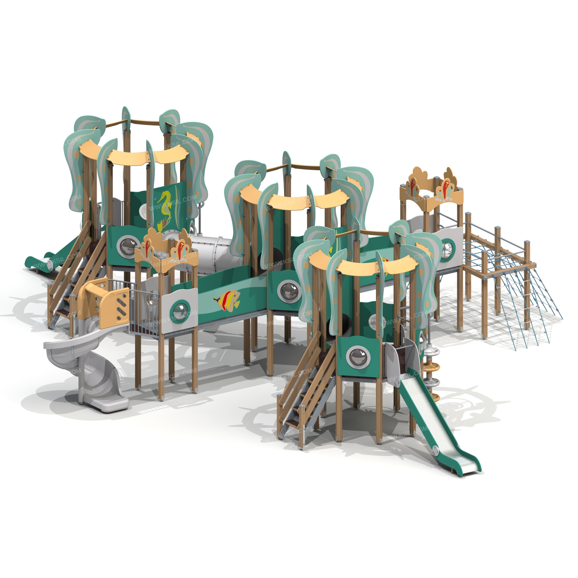 Детский игровой комплекс должен представлять собой модульную сборно-разборную конструкцию в морской тематике. Комплекс должен состоять из пяти башен, три из которых восьмигранные в виде медузы с вынесенным гимнастическим комплексом. Башни должны быть соединены между собой двумя тоннельными переходами и двумя прямыми мостами. К башне 1 восьмигранной, с имитацией крыши первого типа, с высотой площадки не менее 1550 мм должны быть пристроены: горка, вертикальный шест с кольцами и креплением в виде дуги, поручни фанерные, лестница, фанерные ограждения с иллюминатором. К башне 2 восьмигранной, с имитацией крыши первого типа, с высотой площадки не менее 1550 мм должны быть пристроены: фанерные ограждения с иллюминатором. К башне 3 восьмигранной, с имитацией крыши первого типа, с высотой площадки не менее 1550 мм должны быть пристроены: горка, вертикальный шест с кольцами и креплением в виде дуги, поручни фанерные, лестница, фанерные ограждения с иллюминатором. К башне 4 с имитацией крыши второго типа, с высотой площадки не менее 1550 мм должны быть пристроены: фанерные ограждения с иллюминатором, спиральная горка.К башне 5 с имитацией крыши второго типа, с высотой площадки не менее 1550 мм должны быть пристроены: фанерные ограждения с иллюминатором. Башня должна иметь продолжением в виде гимнастического комплекса.Гимнастический комплекс должен представлять собой конструкцию, состоящую из несущих столбов, установленных в два ряда, параллельно друг другу. В каждом ряду несущие столбы в верхней части должны быть соединены балками и горизонтальными столбами. В верхней части должна быть расположена полипропиленовая сетка, проемы гимнастического комплекса должны быть оснащены: наклонными полипропиленовыми сетками для лазанья.Несущие столбы комплекса должны быть выполнены из клееного деревянного бруса сечением не менее 100х100 мм и иметь скругленный профиль с канавкой посередине. Сверху открытый столб должен заканчиваться пластиковой заглушкой, снизу столб должен заканчиваться металлическим оцинкованным подпятником диаметром не менее 42 мм, который бетонируется в землю.Пол башен восьмигранной должен быть выполнен из влагостойкой фанеры толщиной не менее 21 мм. Пол башен должен быть выполнен из деревянной доски толщиной не менее 40 мм. Горка должна состоять из каркаса, ската, бортиков, защитной секции и защитной перекладины. Каркас горки должен быть выполнен из металлической трубы сечением не менее 50х25 мм. Горка должна иметь стартовый участок высотой не менее 1550 мм, участок скольжения и конечный участок. Скат должен быть изготовлен из единого листа нержавеющей стали толщиной 1,5 мм, утопленный в паз бортиков горки. Бортики горки должны быть высотой не менее 150 мм. Защитная перекладина должна быть выполнена из металлической трубы диаметром не менее 33 мм, побуждающая ребенка присесть и установлена на высоте не менее 600 мм от уровня поверхности стартового участка горки. Защитная секция горки должна быть выполнена из влагостойкой фанеры толщиной не менее 21 мм. Лестница высотой не менее 1550 мм должна быть оснащена перилами, выполненные из влагостойкой фанеры толщиной 21 мм с отверстиями для рук. Перила должны быть установлены от первой ступени. Ступени лестниц должны быть выполнены из ламинированной противоскользящей влагостойкой фанеры толщи
