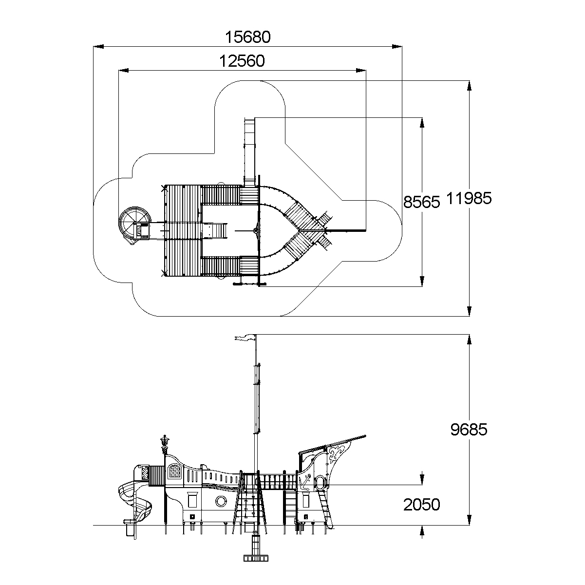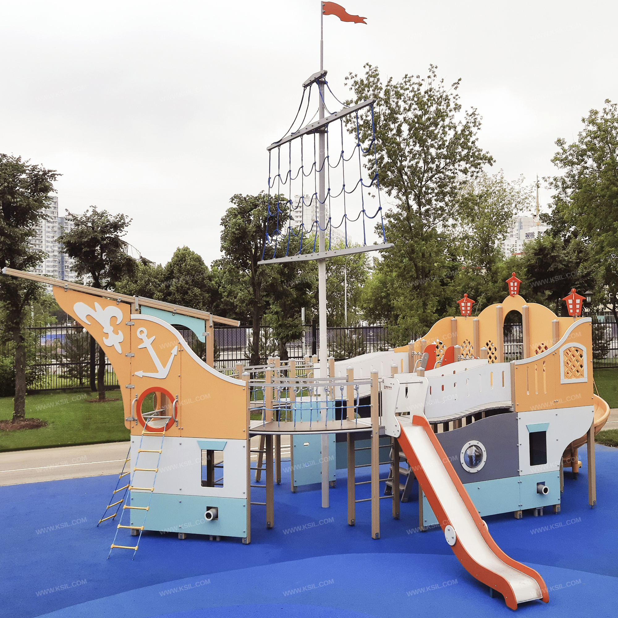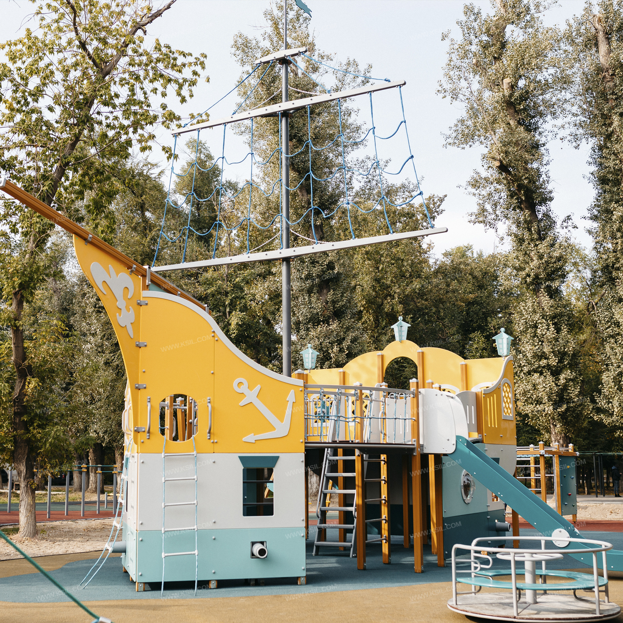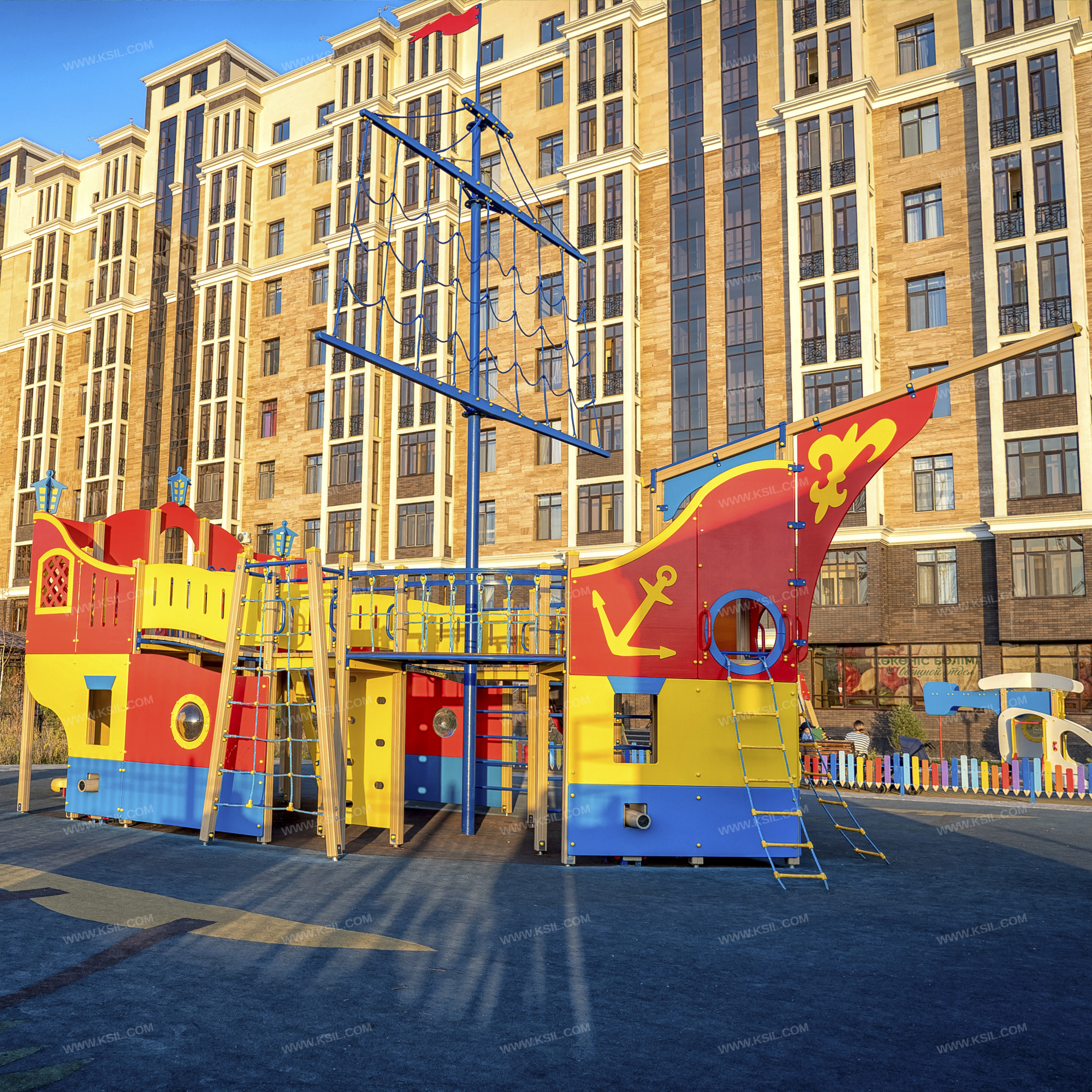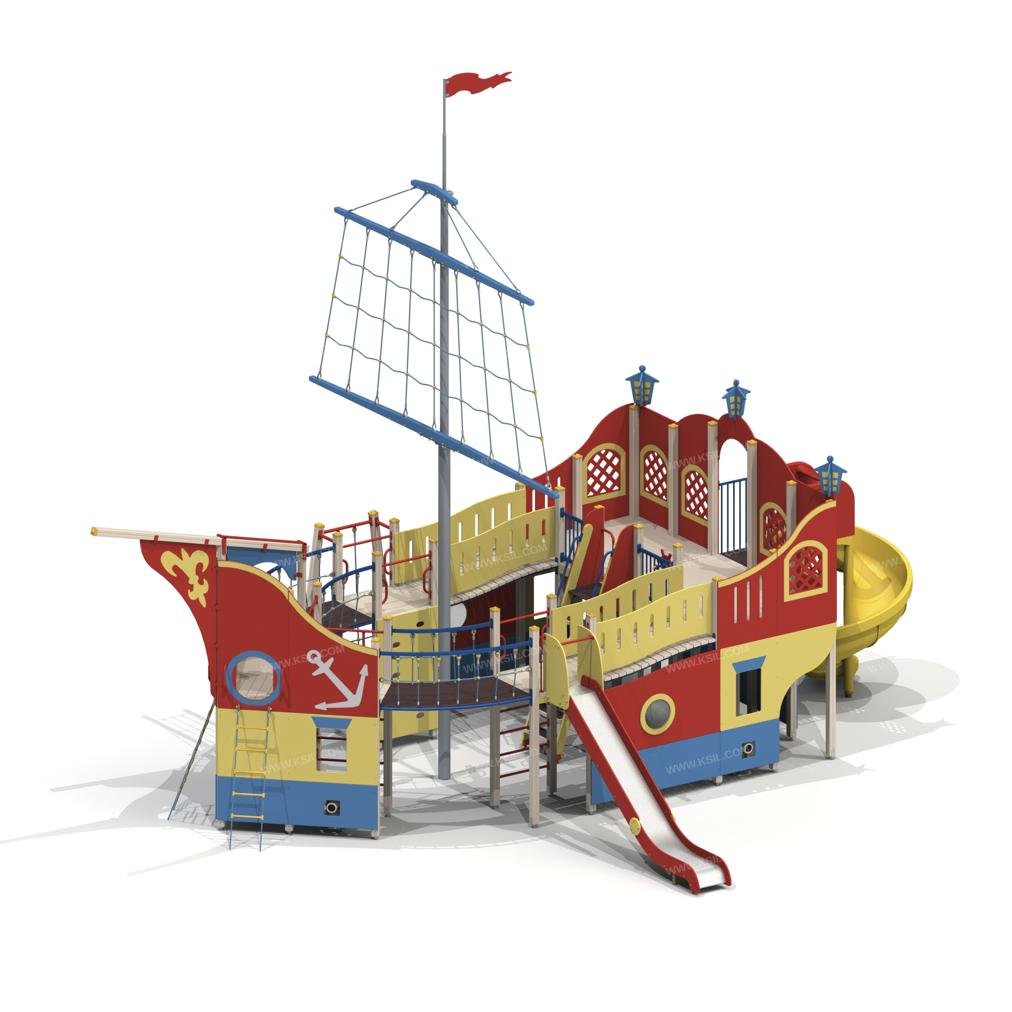 Детский игровой комплекс должен представлять собой модульную сборно-разборную конструкцию, стилизованную под шхуну с декоративными элементами. Комплекс с одной металлической мачтой должен состоять из 4-х башен, соединенных между собой 2-мя волнообразными мостами и 2-мя подвесными изогнутыми мостами.