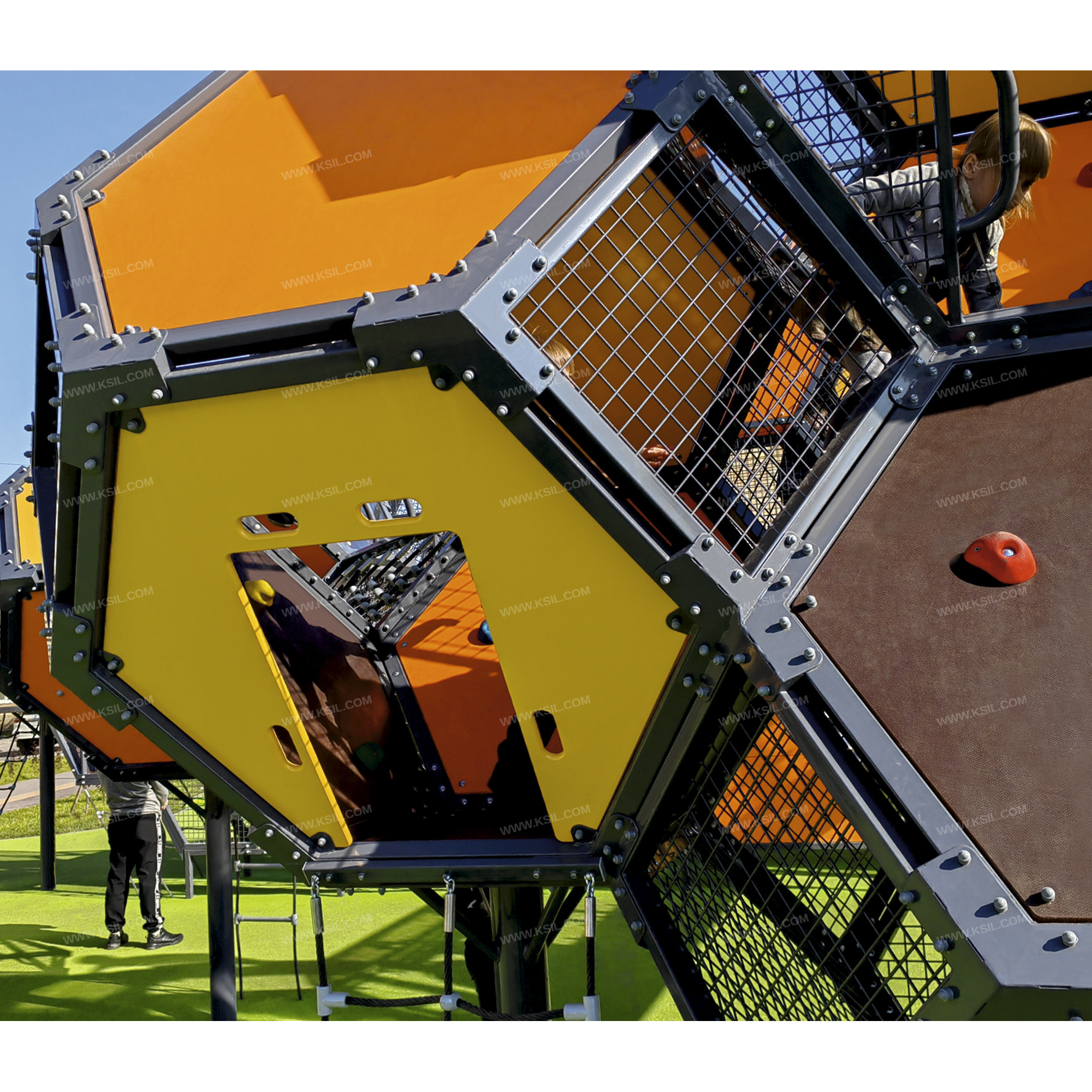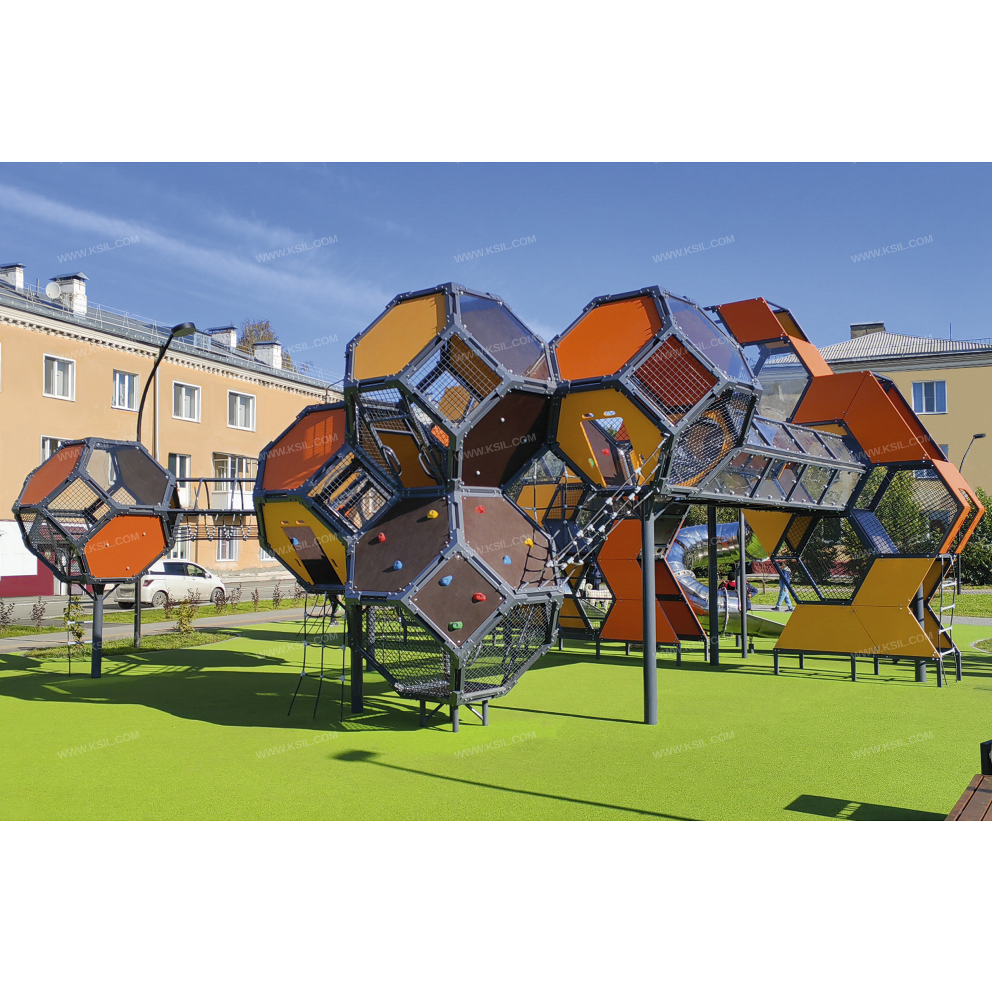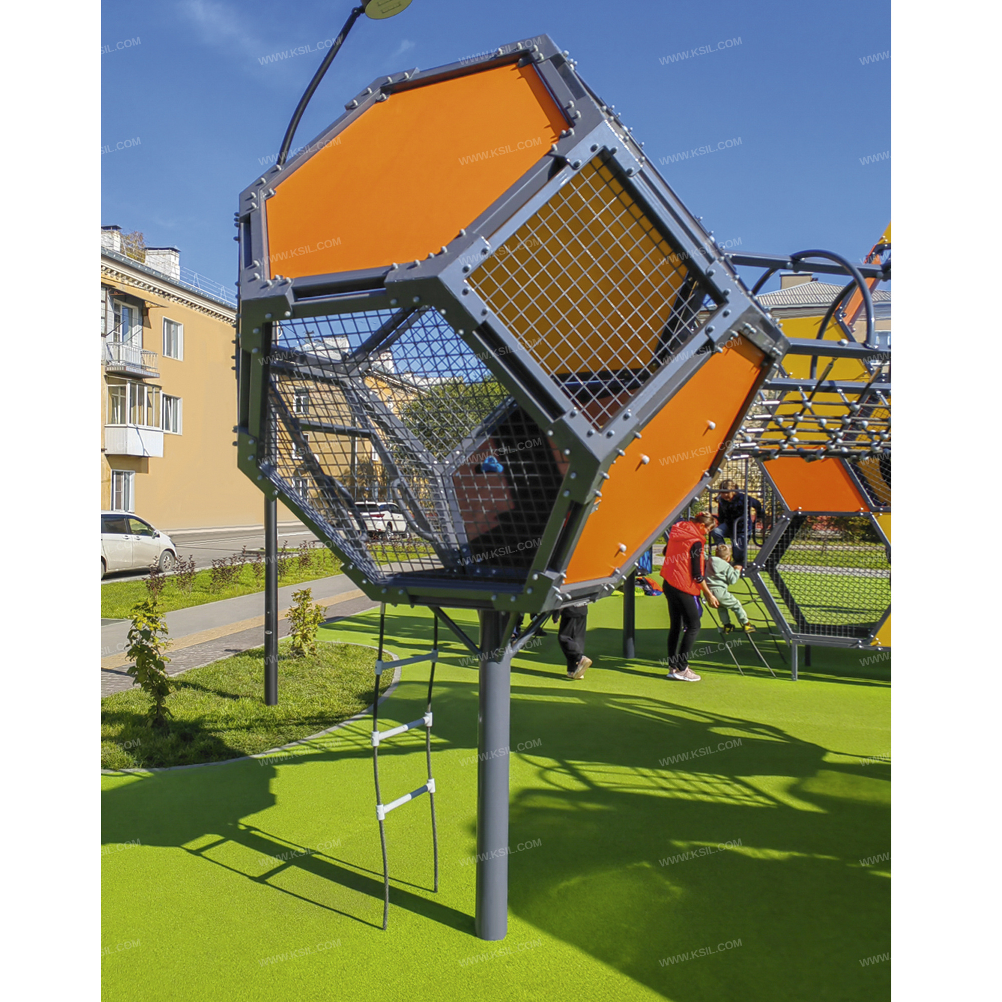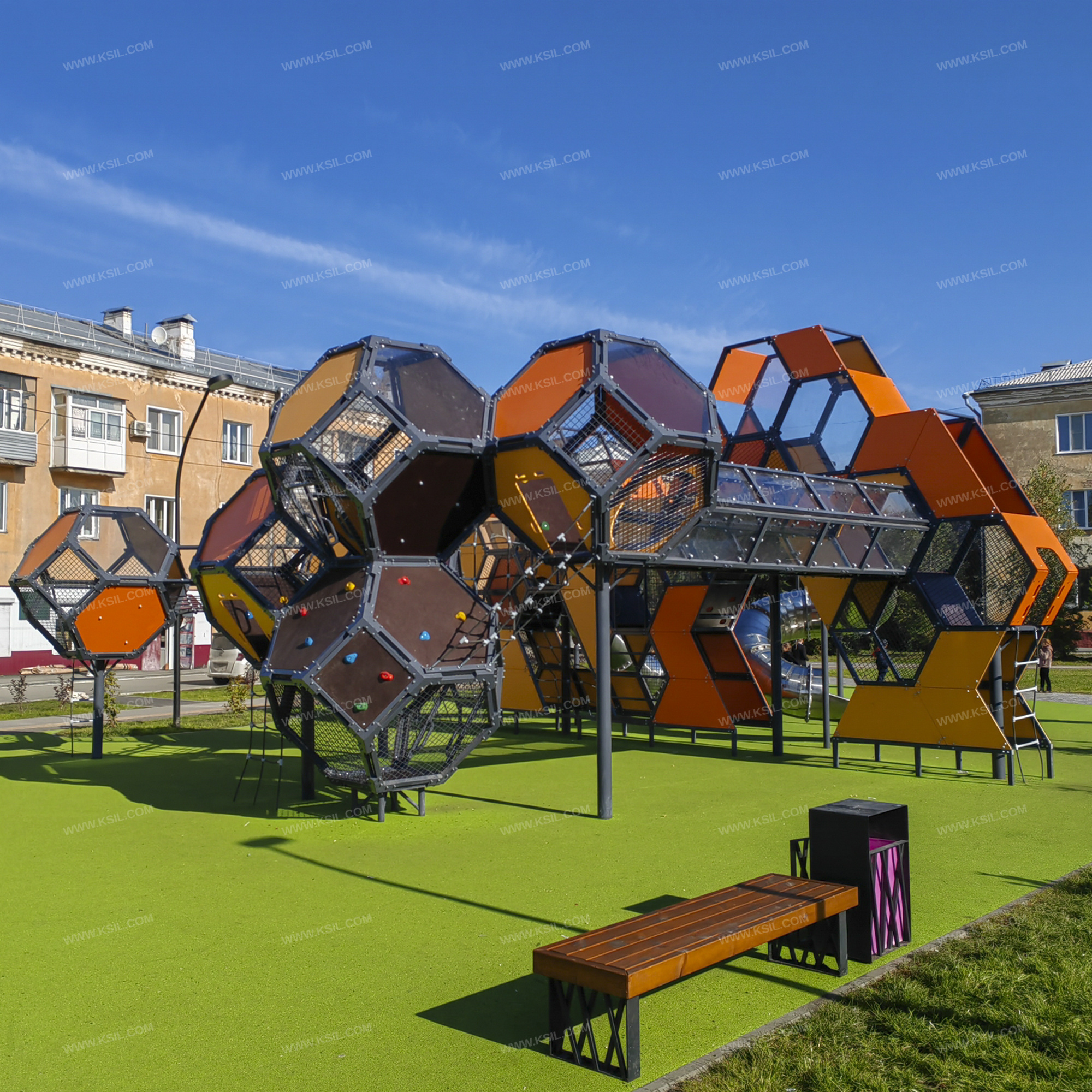 Детский игровой комплекс должен представлять собой сборно-разборную конструкцию и состоять из 4-х модулей присоединенных друг к другу и соединятся переходом с плоской частью и подвесными мостами с 2-я отдельно стоящими модулями.Модуль с высотой площадки 355 мм состоит из 1-й подвесной лестницы и сетки-лазалки на каркасе, 2-х альпинистских шестигранных ламинированных вставок с захватами-камнями, 1-й квадратной ламинированной вставки, 3-х квадратных сетчатых вставок, 1-й входной группы с сетчатыми вставками, 3-х шестигранных сетчатых вставок, 1-й шестигранной вставки из поликарбоната, пола, узлов крепления, опорного каркаса и присоединенных 2-х модулей. Модуль с высотой площадки 1375 мм состоит из 1-й сетки-лазалки прямой, 1-й входной группы из крашенной фанеры с отверстиями для захватов, 2-х альпинистских шестигранных ламинированных вставок с захватами-камнями, 1-й альпинистской шестигранной фанерной крашенной вставки с захватами-камнями, 2-х шестигранных фанерных крашенных вставок, 1-й квадратной сетчатой вставки, 2-х квадратных вставок из поликарбоната, 1-й шестигранной вставки из поликарбоната, пола, узлов крепления, опорной стойки и присоединенных 2-х модулей и подвесного канатного моста.Модуль с высотой площадки 1375 мм состоит из 1-й подвесной лестницы, 1-й входной группы с сетчатыми вставками, 1-й альпинистской шестигранной фанерной крашенной вставки с захватами-камнями, 1-й альпинистской шестигранной ламинированной вставки с захватами-камнями, 2-х квадратных сетчатых вставок, 1-й квадратной вставки из поликарбоната, 2-х шестигранных вставок из поликарбоната, 2-х шестигранных фанерных крашенных вставок, пола, узлов крепления, опорной стойки и присоединённых подвесных канатных мостов. Модуль с высотой площадки 1375 мм состоит из 1-й подвесной лестницы, 1-й входной группы с сетчатыми вставками, 1-й альпинистской шестигранной фанерной крашенной вставки с захватами-камнями, 1-й альпинистской шестигранной ламинированной вставки с захватами-камнями, 3-х квадратных сетчатых вставок, 2-х шестигранных вставок из поликарбоната, 1-й квадратной вставки из поликарбоната, пола, узлов крепления, опорной стойки и присоединённым подвесным канатным мостом. Модуль с высотой площадки 2400 мм состоит из сетки-лазалки на каркасе, 1-й входной группы с сетчатыми вставками, 2-х шестигранных вставок из поликарбоната, 2-х квадратных вставок из поликарбоната, 1-й альпинистской шестигранной ламинированной вставки с захватами-камнями, 1-й альпинистской шестигранной фанерной крашенной вставки с захватами-камнями, 2-х шестигранных фанерных крашенных вставок, 2-х квадратных сетчатых вставок, пола, узлов крепления и присоединенных 3-х модулей.Модуль с высотой площадки 2400 мм состоит из сетки-лазалки на каркасе, присоединённого переходного-моста с защитными экранами, 1-го шестигранного входа модуля переходного-моста с защитными экранами, 1-й входной группы из крашенной фанеры с отверстиями для захватов, 1-й квадратной вставки из поликарбоната, 2-х шестигранных вставок из поликарбоната, 1-й альпинистской шестигранной ламинированной вставки с захватами-камнями, 2-х шестигранных фанерных крашенных вставок, пола, узлов крепления, опорной стойки и присоединённого модуля. Плоский модуль состоит из 1-й тоннельной горки-трубы, 1-й тоннельной спиральной горки-трубы, 2-х шестигранны