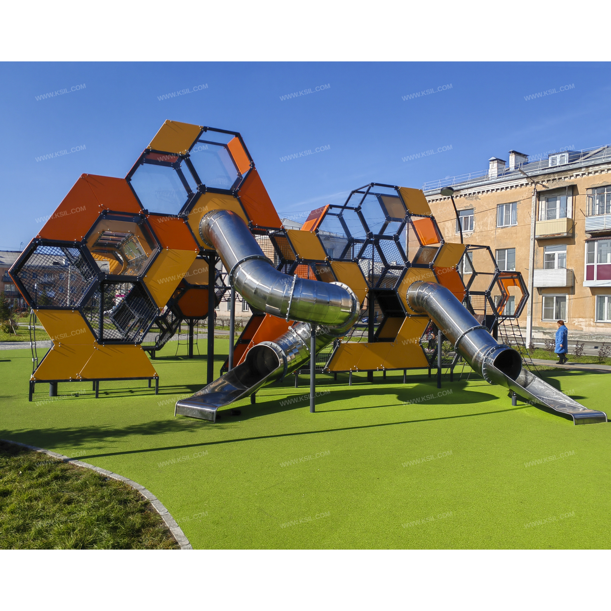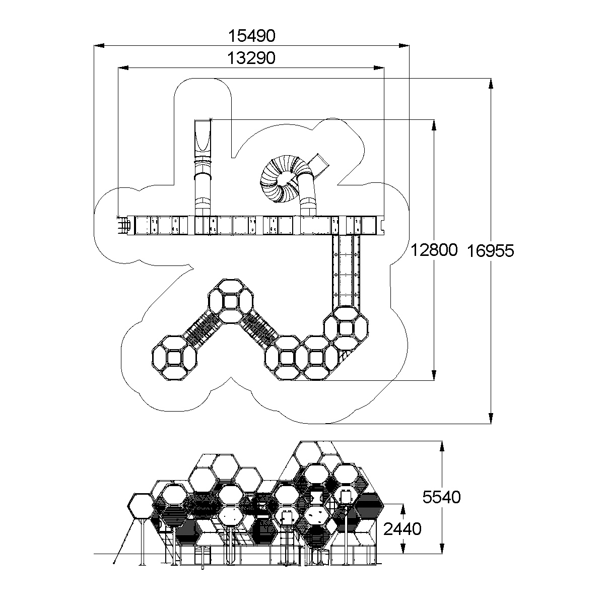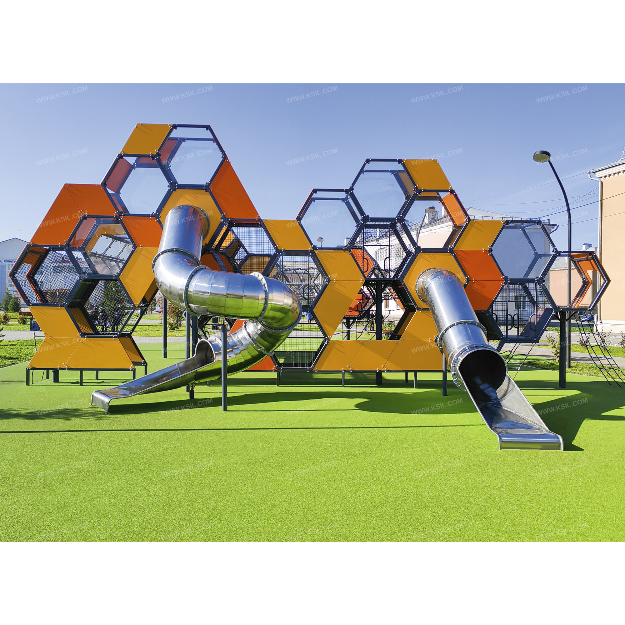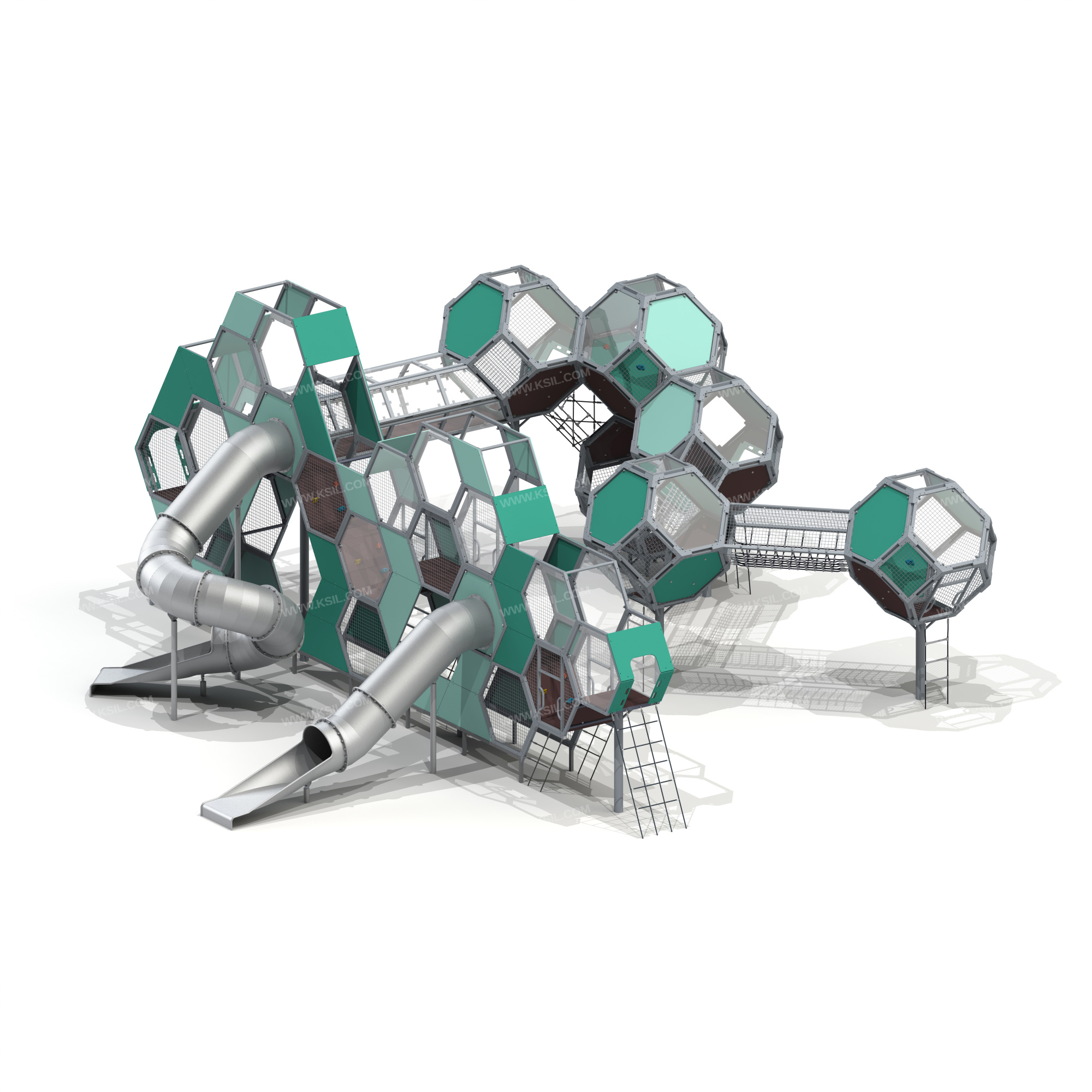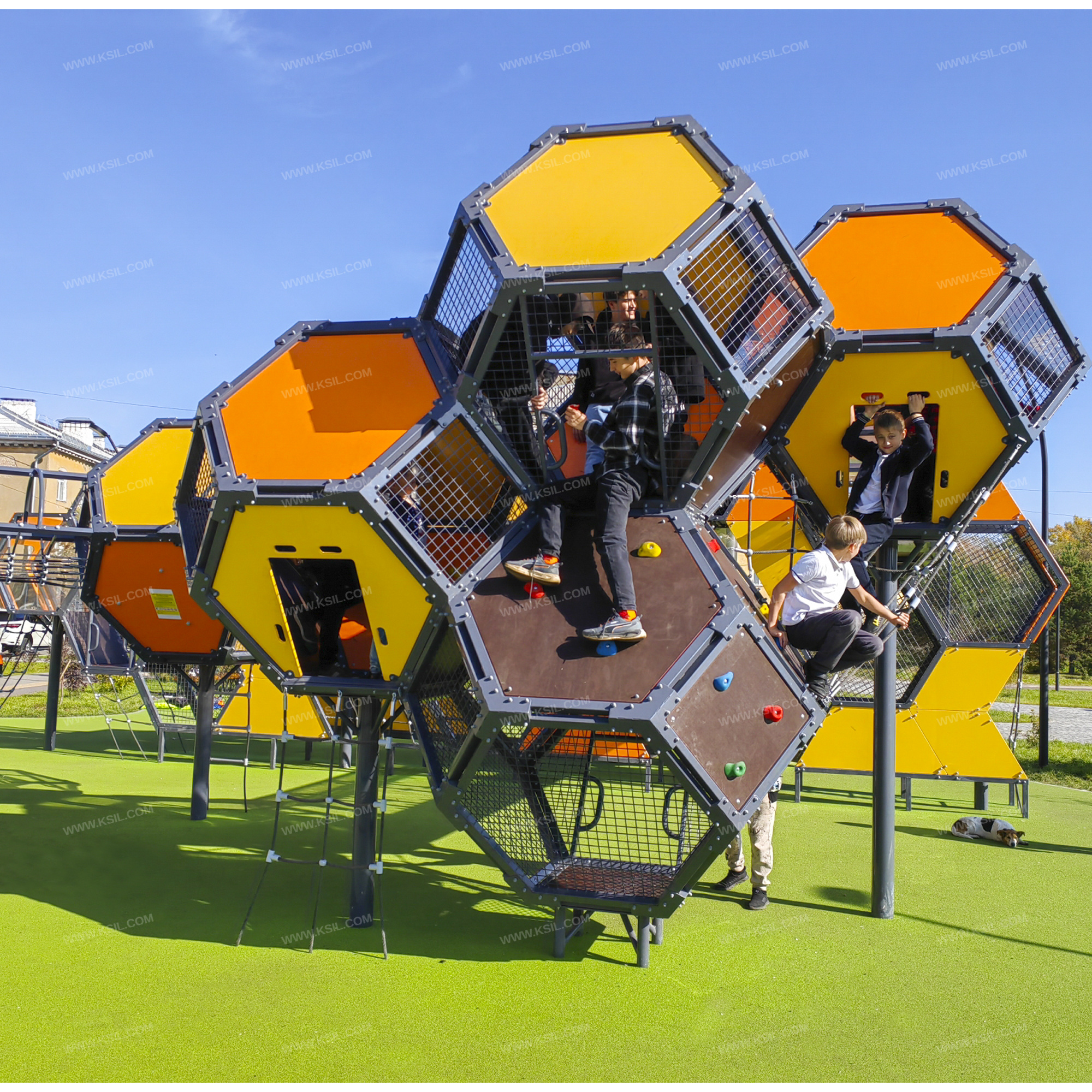 Детский игровой комплекс должен представлять собой сборно-разборную конструкцию и состоять из 4-х модулей присоединенных друг к другу и соединятся переходом с плоской частью и подвесными мостами с 2-я отдельно стоящими модулями.Модуль с высотой площадки 355 мм состоит из 1-й подвесной лестницы и сетки-лазалки на каркасе, 2-х альпинистских шестигранных ламинированных вставок с захватами-камнями, 1-й квадратной ламинированной вставки, 3-х квадратных сетчатых вставок, 1-й входной группы с сетчатыми вставками, 3-х шестигранных сетчатых вставок, 1-й шестигранной вставки из поликарбоната, пола, узлов крепления, опорного каркаса и присоединенных 2-х модулей. Модуль с высотой площадки 1375 мм состоит из 1-й сетки-лазалки прямой, 1-й входной группы из крашенной фанеры с отверстиями для захватов, 2-х альпинистских шестигранных ламинированных вставок с захватами-камнями, 1-й альпинистской шестигранной фанерной крашенной вставки с захватами-камнями, 2-х шестигранных фанерных крашенных вставок, 1-й квадратной сетчатой вставки, 2-х квадратных вставок из поликарбоната, 1-й шестигранной вставки из поликарбоната, пола, узлов крепления, опорной стойки и присоединенных 2-х модулей и подвесного канатного моста.Модуль с высотой площадки 1375 мм состоит из 1-й подвесной лестницы, 1-й входной группы с сетчатыми вставками, 1-й альпинистской шестигранной фанерной крашенной вставки с захватами-камнями, 1-й альпинистской шестигранной ламинированной вставки с захватами-камнями, 2-х квадратных сетчатых вставок, 1-й квадратной вставки из поликарбоната, 2-х шестигранных вставок из поликарбоната, 2-х шестигранных фанерных крашенных вставок, пола, узлов крепления, опорной стойки и присоединённых подвесных канатных мостов. Модуль с высотой площадки 1375 мм состоит из 1-й подвесной лестницы, 1-й входной группы с сетчатыми вставками, 1-й альпинистской шестигранной фанерной крашенной вставки с захватами-камнями, 1-й альпинистской шестигранной ламинированной вставки с захватами-камнями, 3-х квадратных сетчатых вставок, 2-х шестигранных вставок из поликарбоната, 1-й квадратной вставки из поликарбоната, пола, узлов крепления, опорной стойки и присоединённым подвесным канатным мостом. Модуль с высотой площадки 2400 мм состоит из сетки-лазалки на каркасе, 1-й входной группы с сетчатыми вставками, 2-х шестигранных вставок из поликарбоната, 2-х квадратных вставок из поликарбоната, 1-й альпинистской шестигранной ламинированной вставки с захватами-камнями, 1-й альпинистской шестигранной фанерной крашенной вставки с захватами-камнями, 2-х шестигранных фанерных крашенных вставок, 2-х квадратных сетчатых вставок, пола, узлов крепления и присоединенных 3-х модулей.Модуль с высотой площадки 2400 мм состоит из сетки-лазалки на каркасе, присоединённого переходного-моста с защитными экранами, 1-го шестигранного входа модуля переходного-моста с защитными экранами, 1-й входной группы из крашенной фанеры с отверстиями для захватов, 1-й квадратной вставки из поликарбоната, 2-х шестигранных вставок из поликарбоната, 1-й альпинистской шестигранной ламинированной вставки с захватами-камнями, 2-х шестигранных фанерных крашенных вставок, пола, узлов крепления, опорной стойки и присоединённого модуля. Плоский модуль состоит из 1-й тоннельной горки-трубы, 1-й тоннельной спиральной горки-трубы, 2-х шестигранны
