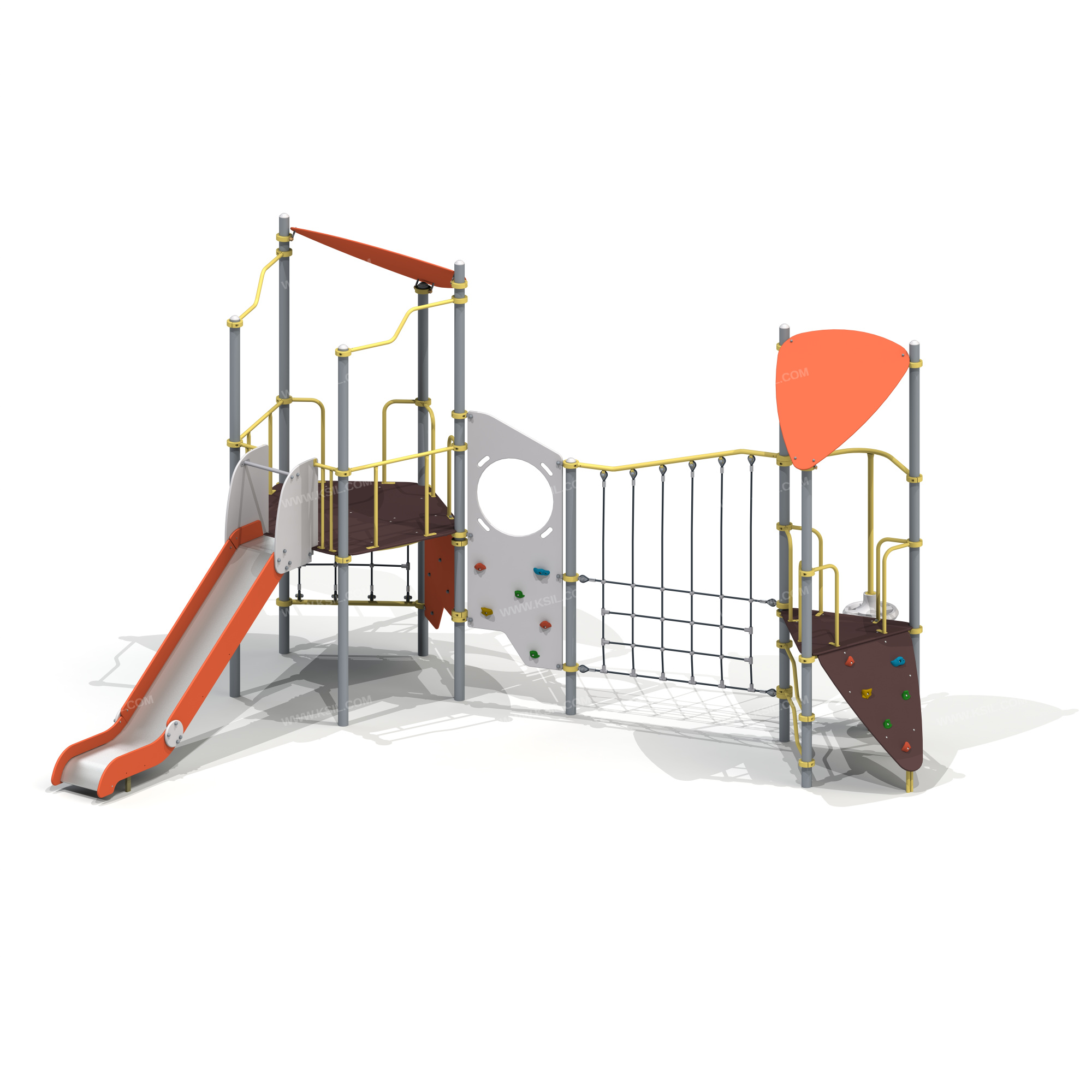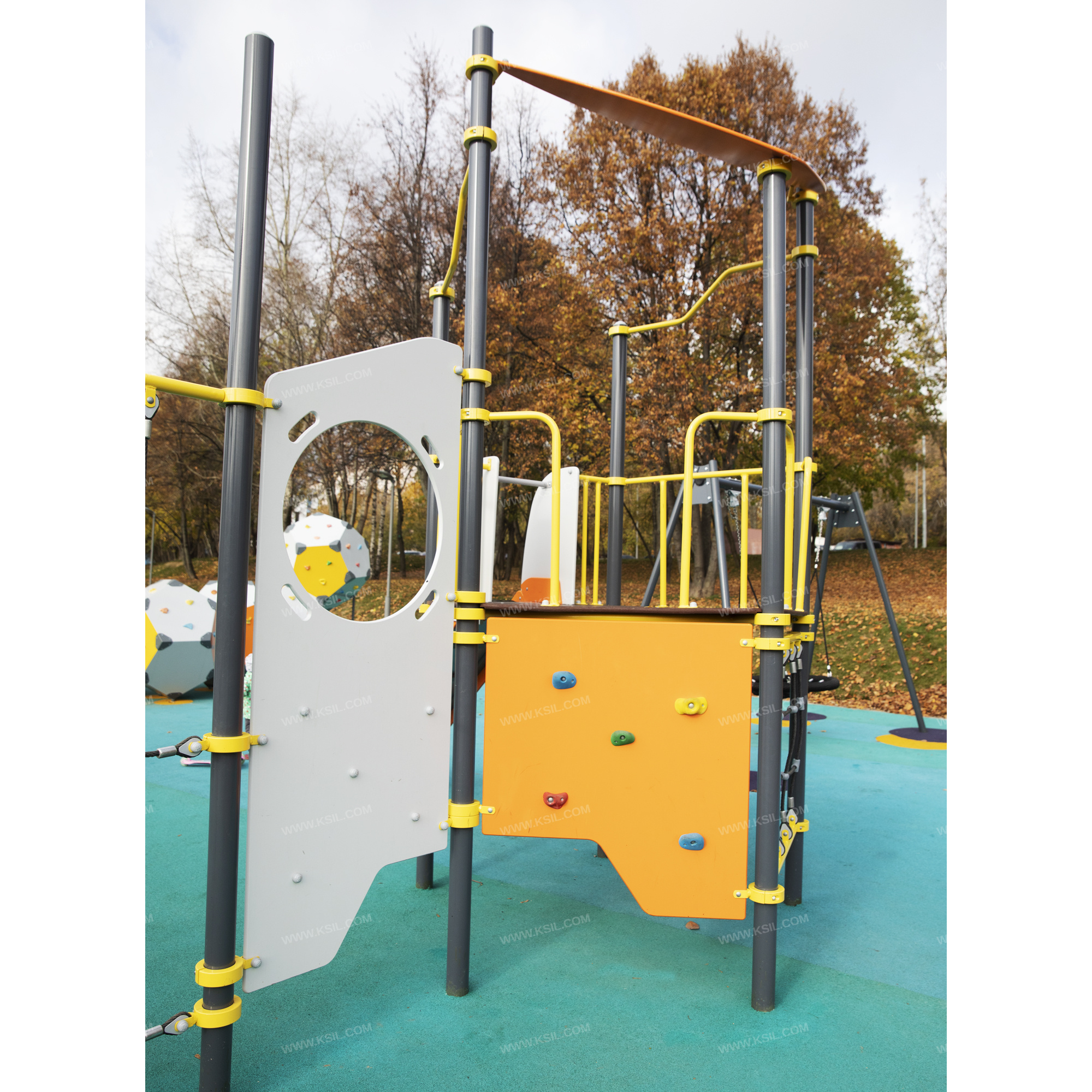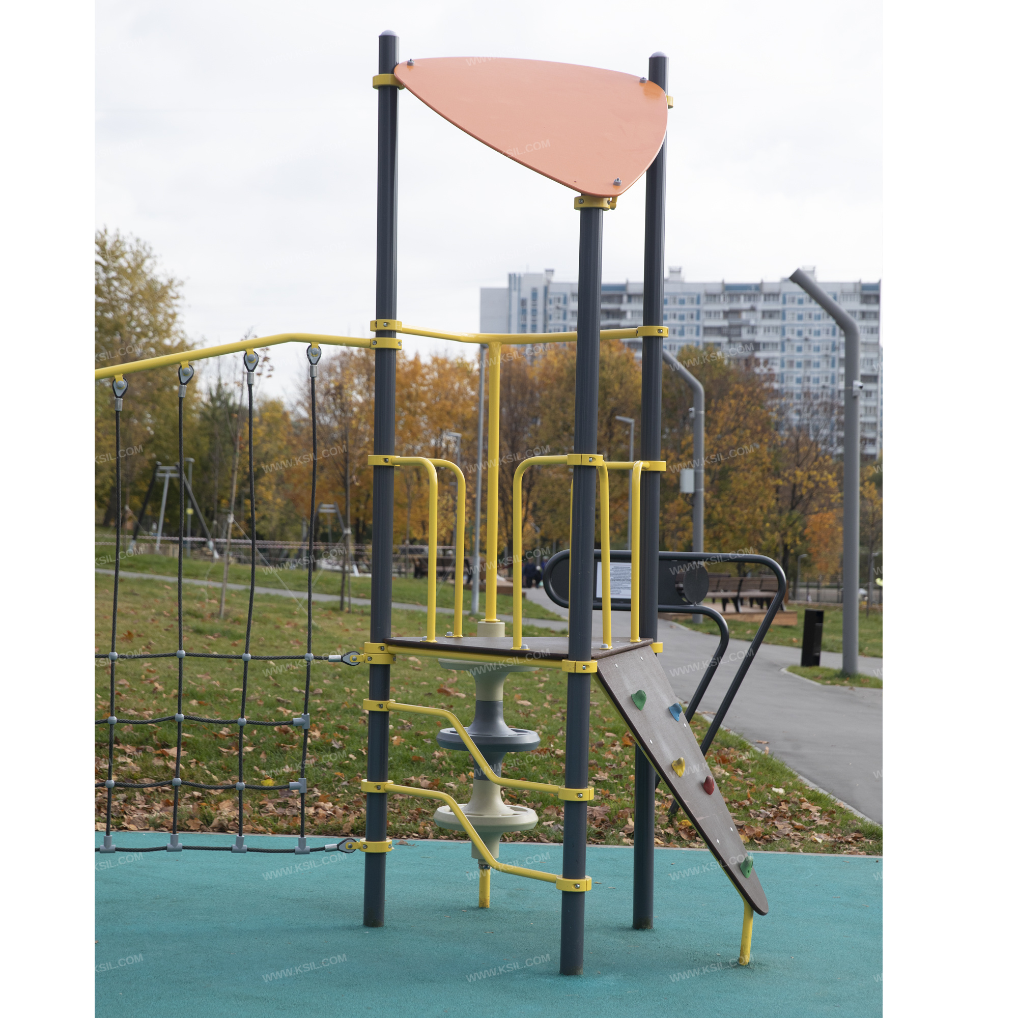 Несущие столбы комплекса должны быть выполнены из металлической трубы диаметром не менее 88 мм. Сверху столб должен заканчиваться заглушкой, снизу столб должен бетонироваться в землю.Пол башен должен быть выполнен из влагостойкой противоскользящей фанеры толщиной не менее 21 мм. Горка должна состоять из каркаса, ската, бортиков, защитной секции и защитной перекладины. Каркас горки должен быть выполнен из металлической трубы сечением не менее 50х25 мм. Горка должна иметь стартовый участок высотой не менее 1550 мм, участок скольжения и конечный участок. Скат должен быть изготовлен из единого листа нержавеющей стали толщиной 1,5 мм, утопленный в паз бортиков горки. Бортики горки должны быть высотой не менее 150 мм. Защитная перекладина должна быть выполнена из металлической трубы диаметром не менее 33 мм, побуждающая ребенка присесть и установлена на высоте не менее 600 мм от уровня поверхности стартового участка горки. Защитная секция горки должна быть выполнена из влагостойкой фанеры толщиной не менее 21 мм.Альпинистская стенка неправильной формы и трап должна быть выполнена из влагостойкой фанеры толщиной не менее 21 мм. с зацепами.Перекладины башни, ограждение виде «Г» образного поручня должны быть выполнены из металлической трубы диаметром не менее 33 мм. Сетка должна быть выполнена из полипропиленового 6-прядного армированного металлом каната тросовой свивки с резиновым сердечником, канат сетки должен быть диаметром не менее 16 мм и соединен между собой пластиковыми креплениями овальной формы. Шест с кольцами должен быть выполнен из металлической трубы диаметром не менее 48 мм. Кольца выполнены из пластика. Нижняя часть шеста бетонируется в землю. Навес над площадками выполнен из фанера толщиной 21 мм.