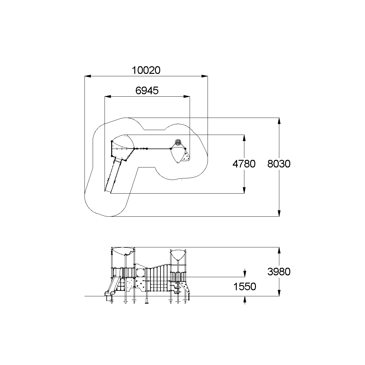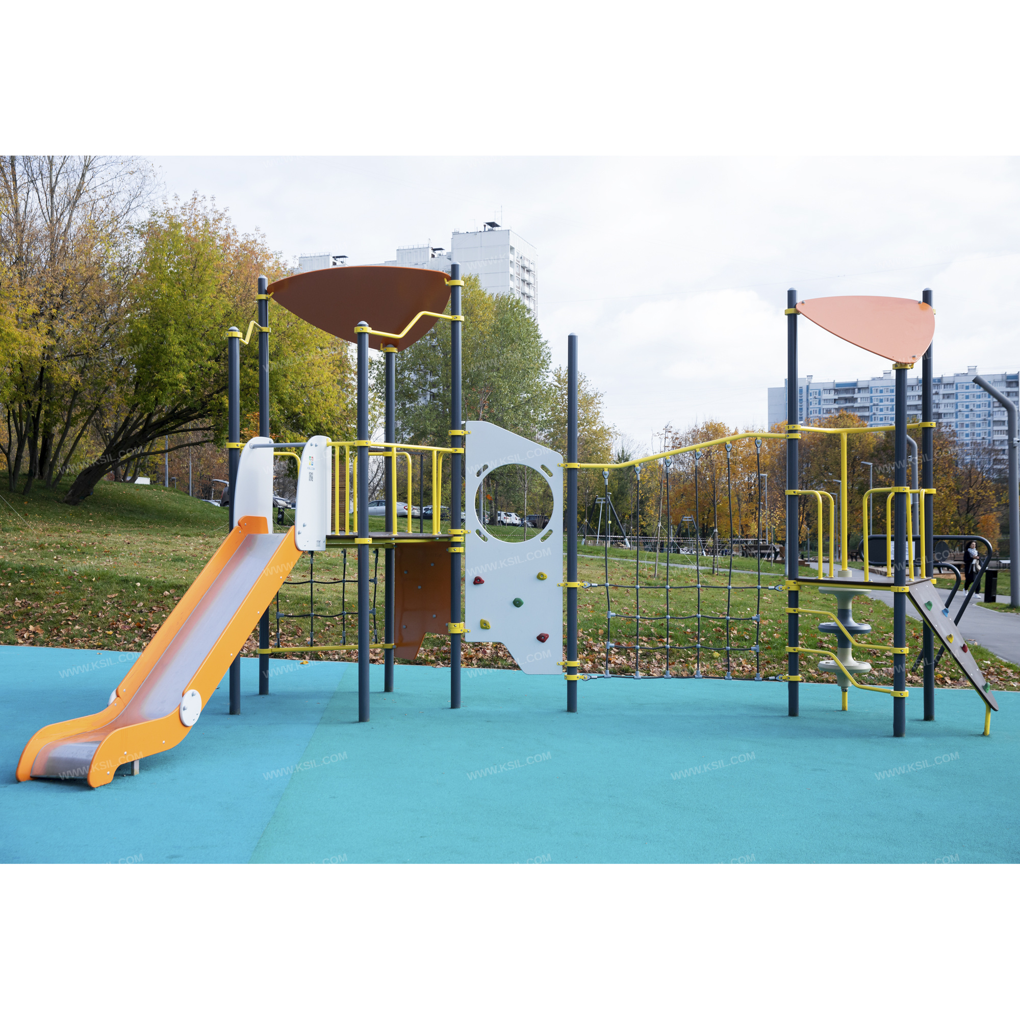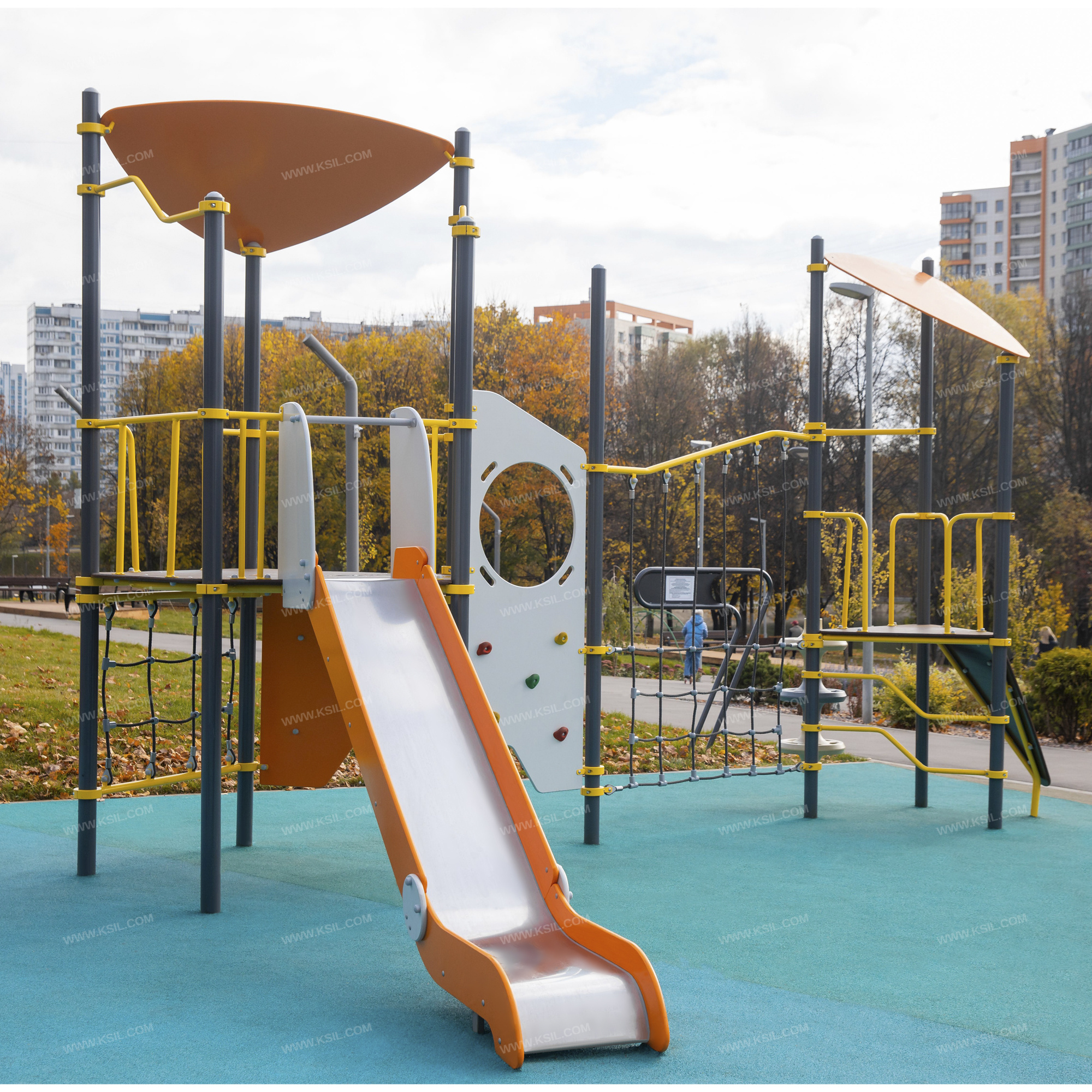 Несущие столбы комплекса должны быть выполнены из металлической трубы диаметром не менее 88 мм. Сверху столб должен заканчиваться заглушкой, снизу столб должен бетонироваться в землю.Пол башен должен быть выполнен из влагостойкой противоскользящей фанеры толщиной не менее 21 мм. Горка должна состоять из каркаса, ската, бортиков, защитной секции и защитной перекладины. Каркас горки должен быть выполнен из металлической трубы сечением не менее 50х25 мм. Горка должна иметь стартовый участок высотой не менее 1550 мм, участок скольжения и конечный участок. Скат должен быть изготовлен из единого листа нержавеющей стали толщиной 1,5 мм, утопленный в паз бортиков горки. Бортики горки должны быть высотой не менее 150 мм. Защитная перекладина должна быть выполнена из металлической трубы диаметром не менее 33 мм, побуждающая ребенка присесть и установлена на высоте не менее 600 мм от уровня поверхности стартового участка горки. Защитная секция горки должна быть выполнена из влагостойкой фанеры толщиной не менее 21 мм.Альпинистская стенка неправильной формы и трап должна быть выполнена из влагостойкой фанеры толщиной не менее 21 мм. с зацепами.Перекладины башни, ограждение виде «Г» образного поручня должны быть выполнены из металлической трубы диаметром не менее 33 мм. Сетка должна быть выполнена из полипропиленового 6-прядного армированного металлом каната тросовой свивки с резиновым сердечником, канат сетки должен быть диаметром не менее 16 мм и соединен между собой пластиковыми креплениями овальной формы. Шест с кольцами должен быть выполнен из металлической трубы диаметром не менее 48 мм. Кольца выполнены из пластика. Нижняя часть шеста бетонируется в землю. Навес над площадками выполнен из фанера толщиной 21 мм.