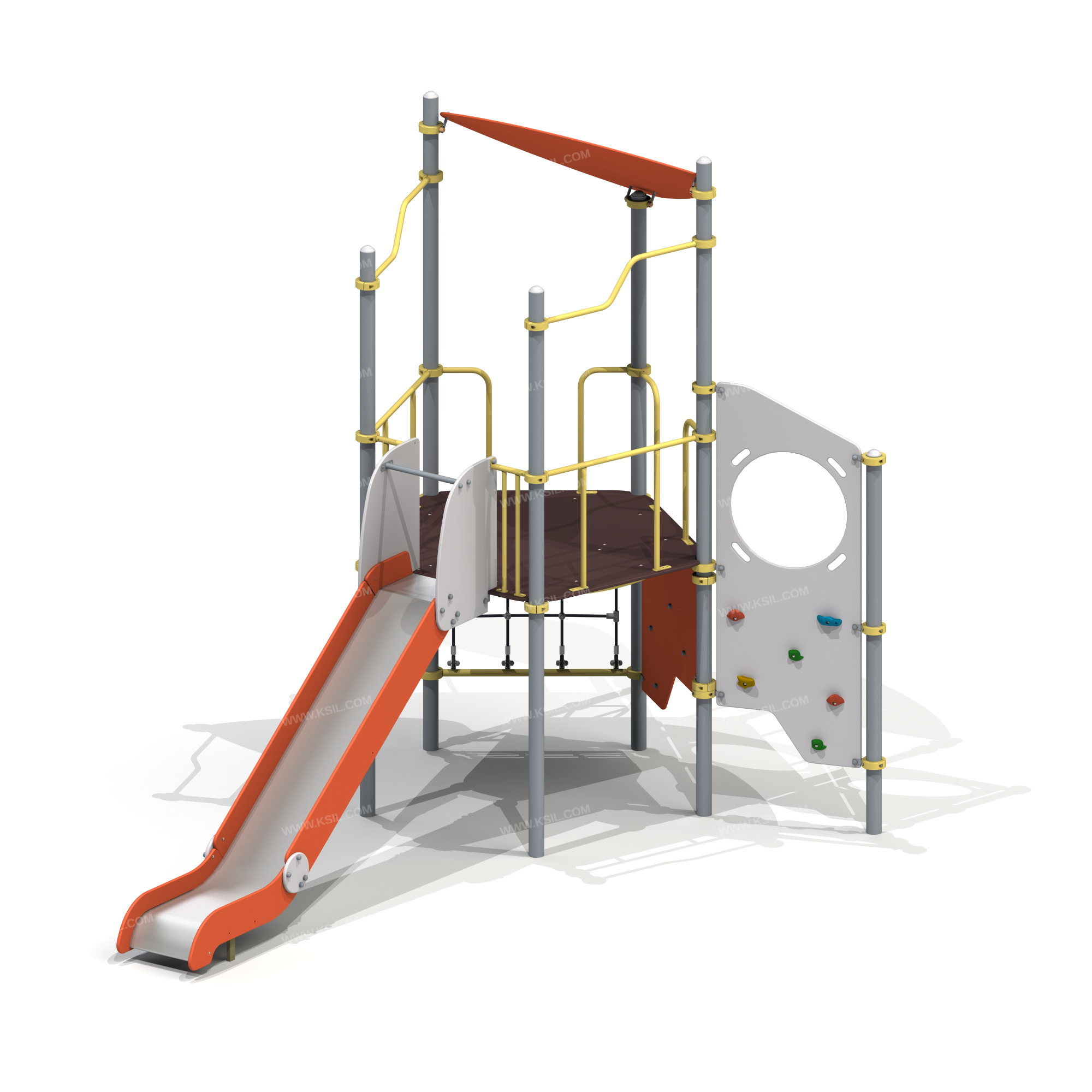 Игровой комплекс должен представлять собой модульную сборно-разборную конструкцию и состоять из башни с навесным оборудованием. Все навесное оборудование должно крепиться при помощи хомутов диаметром не менее 140 мм. Башня должна включать в себя: металлические ограждения в виде «Г» образного поручня, горку, перекладины с перепадом, полипропиленовую сетку, боковую стойку с альпинистской стенкой неправильной формы с захватами в виде камней и круговым отверстием.Несущие столбы комплекса должны быть выполнены из металлической трубы диаметром не менее 88 мм. Сверху столб должен заканчиваться заглушкой, снизу столб должен бетонироваться в землю.Пол башни должен быть выполнен из влагостойкой противоскользящей фанеры толщиной не менее 21 мм. Горка должна состоять из каркаса, ската, бортиков, защитной секции и защитной перекладины. Каркас горки должен быть выполнен из металлической трубы сечением не менее 50х25 мм. Горка должна иметь стартовый участок высотой не менее 1550 мм, участок скольжения и конечный участок. Скат должен быть изготовлен из единого листа нержавеющей стали толщиной 1,5 мм, утопленный в паз бортиков горки. Бортики горки должны быть высотой не менее 150 мм. Защитная перекладина должна быть выполнена из металлической трубы диаметром не менее 33 мм, побуждающая ребенка присесть и установлена на высоте не менее 600 мм от уровня поверхности стартового участка горки. Защитная секция горки должна быть выполнена из влагостойкой фанеры толщиной не менее 21 мм.Альпинистская стенка неправильной формы должна быть выполнена из влагостойкой фанеры толщиной не менее 21 мм. с зацепами.Перекладины башни, ограждение виде «Г» образного поручня должны быть выполнены из металлической трубы диаметром не менее 33 мм. Сетка должна быть выполнена из полипропиленового 6-прядного армированного металлом каната тросовой свивки с резиновым сердечником, канат сетки должен быть диаметром не менее 16 мм и соединен между собой пластиковыми креплениями овальной формы. Навес над площадкой выполнен из фанера толщиной 21 мм.