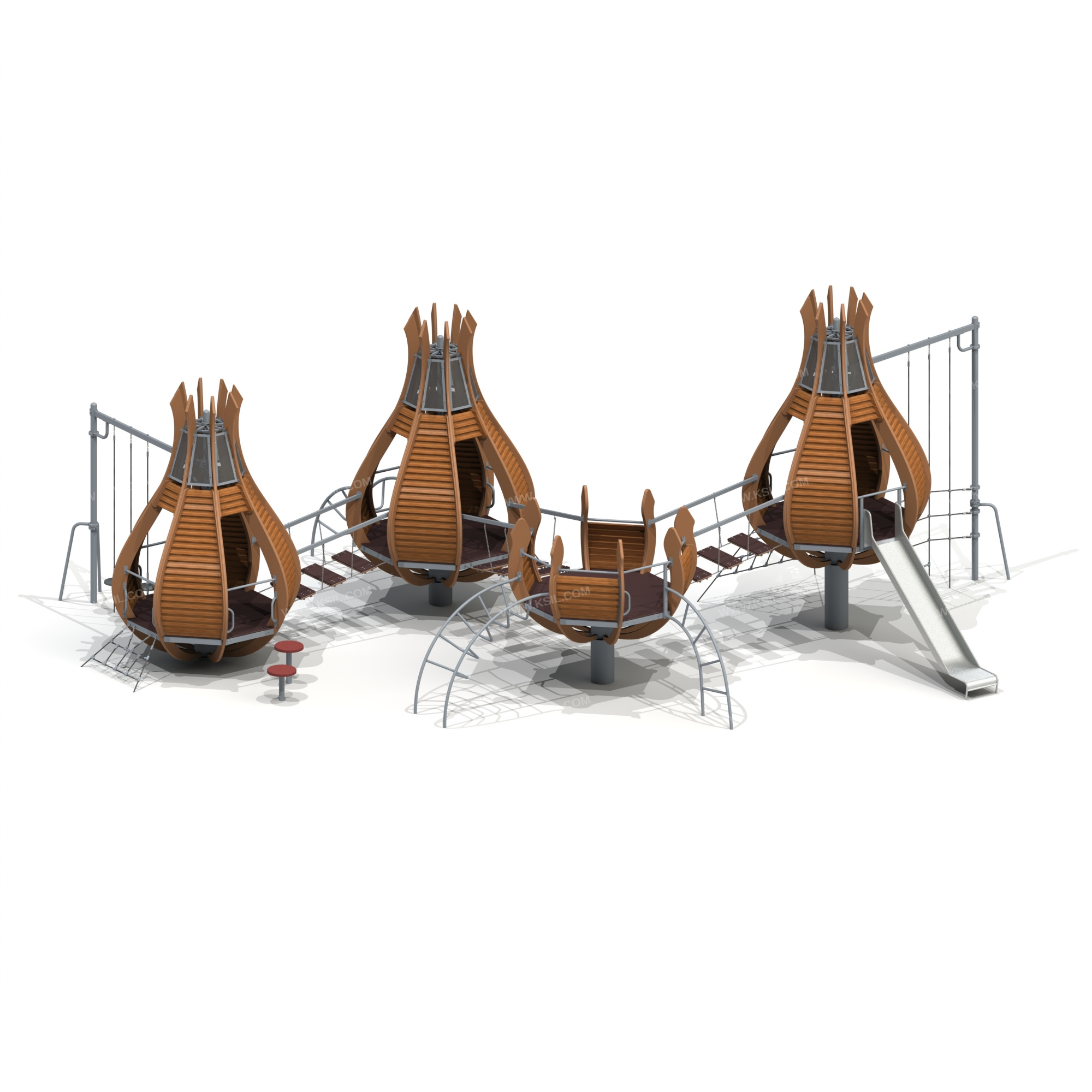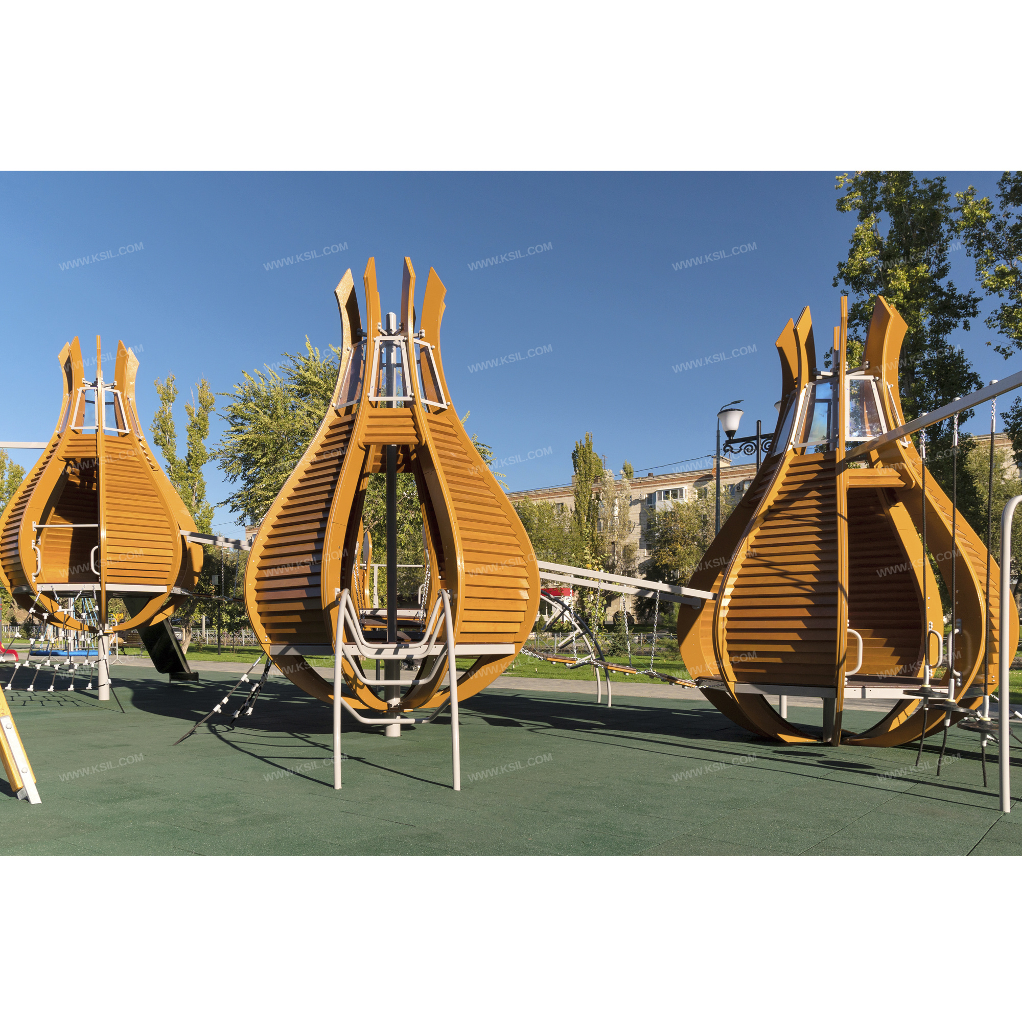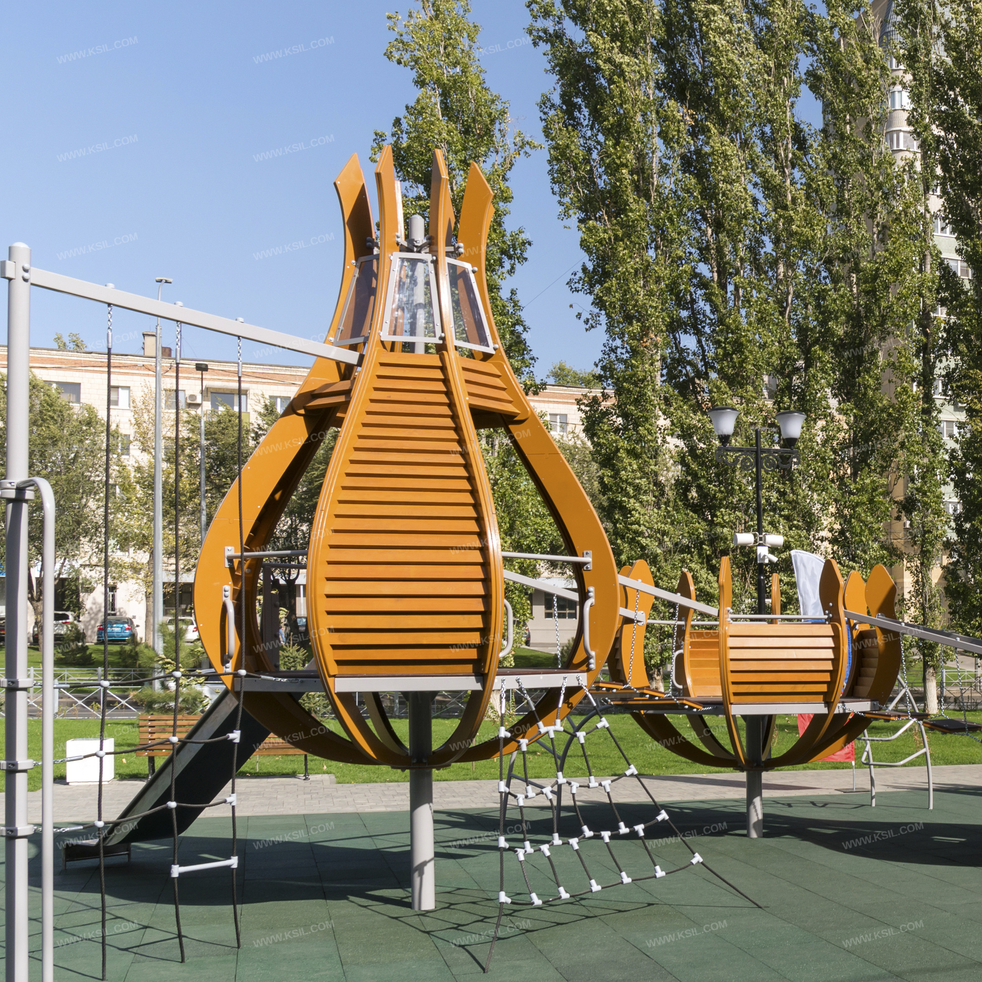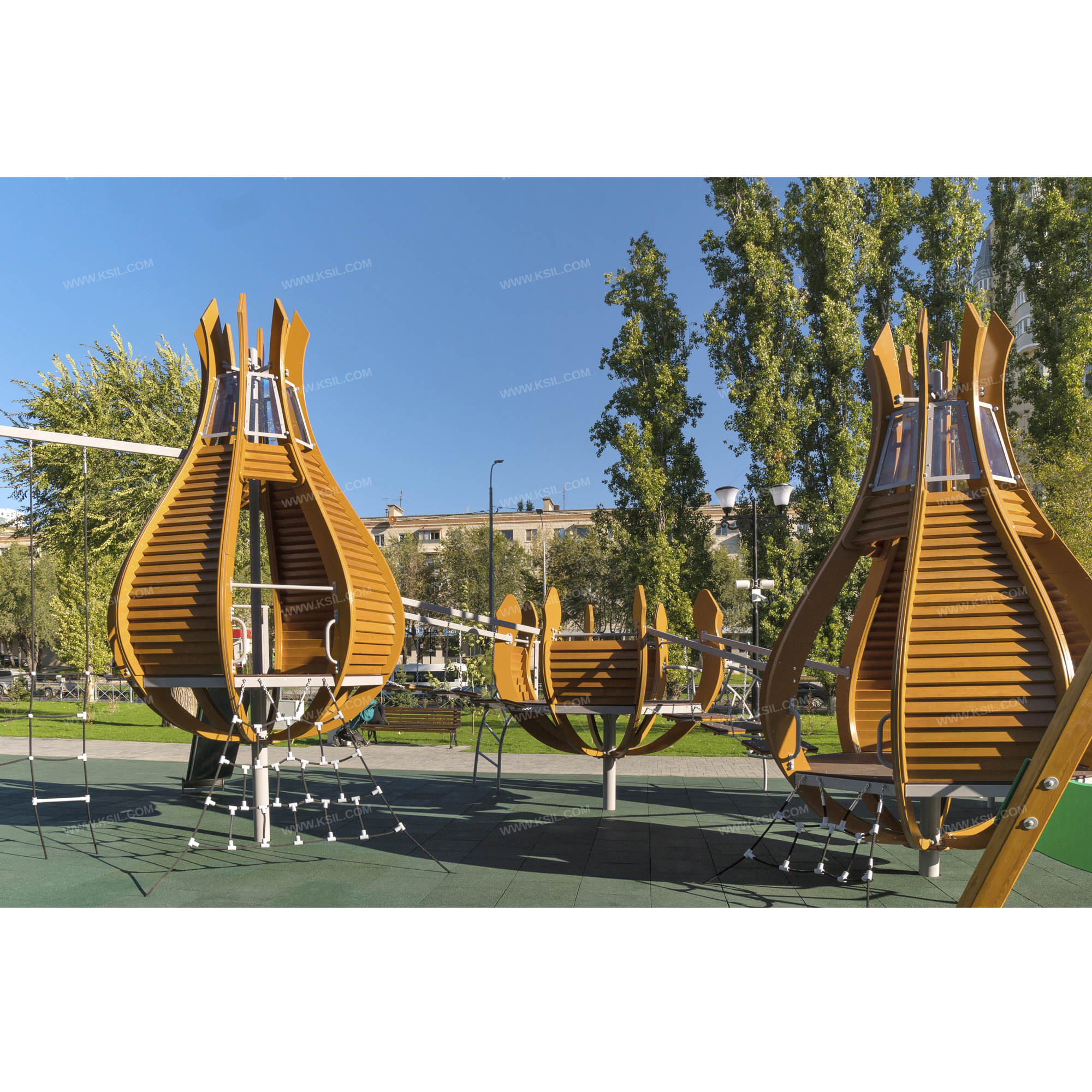 Детский игровой комплекс должен представлять собой модульную сборно-разборную конструкцию в виде 3-х башен закрытого тюльпана и 1-й башни открытого тюльпана соединенных между собой подвесными мостами. К башне, с высотой площадки не менее 650 мм, должны быть пристроены: переход с 3-мя подвесными круглыми ступенями на канате и двумя приставными шестами, сетка-трапеция, поручни, перекладины, подвесной мост разноуровневый. Рядом с комплексом располагается переход из 2-х круглых ступеней.К башне, с высотой площадки не менее 950 мм, должны быть пристроены: наклонная лиана, сетка-трапеция, поручни, перекладины, два подвесных моста разноуровневых.К башне, с высотой площадки не менее 1250 мм, должны быть пристроены: наклонная лиана, изогнутая металлическая лестница, вход к изогнутой металлической лестнице, перекладины, два подвесных моста разноуровневых.К башне, с высотой площадки не менее 1550 мм, должны быть пристроены: горка-скат, вход к горке-скату, переход с сеткой лазалкой и двумя приставными шестами, сетка-трапеция, поручни, перекладины, подвесной мост разноуровневый. Башня закрытого тюльпана состоит из ребер тюльпана, дощатого ограждения и накладок тюльпана, окон вершины тюльпана, стойки центральной, верхнего кронштейна, пола, стойки основания тюльпана.Башня открытого тюльпана состоит из ребер тюльпана, дощатого ограждения и накладок тюльпана, пола, стойки основания тюльпана и защитных перекладин. Горка-скат должна быть выполнена из нержавеющей стали толщиной не менее 2 мм с высотой стартового участка не менее 1550 мм. Горка должна состоять из каркаса из трубы диаметром не менее 27 мм, ската, бортиков высотой не менее 150 мм и защитной секции при выходе на горку. Скат горки должен быть изготовлен из единого листа нержавеющей стали. Поручни, перекладины, защитные перекладины выполнены из трубы диаметром 33,5 мм. Вход к изогнутой металлической лестницы состоит из трубы диаметром 33,5 мм с приваренной к ней трубы сечением не менее 25х50 мм. Вход к горке-скату состоит из трубы диаметром 33,5 мм с приваренными к ней трубами сечением не менее 25х50 мм и фанерных накладок, выполненных из влагостойкой фанеры толщиной не менее 15 мм.Наклонная сетка-трапеция должна быть выполнена из полипропиленового 6-прядного армированного металлом каната тросовой свивки с резиновым сердечником, канат сетки должен быть диаметром не менее 16 мм и соединен между собой пластиковыми креплениями Т-образной формы. Нижняя часть сетки с закладной деталью, выполненной из металлической трубы диаметром не менее 33,5 мм, бетонируется в землю. Сетка крепится к основанию тюльпана через откидные болты, которые крепятся через скобу к цепи, запрессованной к концу каната.Изогнутая металлическая лестница должна состоять из 2-х дуг, выполненных из металлической трубы диаметром не менее 42,3 мм и ступенек из трубы диаметром не менее 33,5 мм. Нижняя часть лестницы бетонируется в землю.Переход с сеткой лазалкой и двумя приставными шестами состоит из балки выполненной из металлической трубы сечением не менее 40х80 мм к которой крепится сетка лазалка выполненная из полипропиленового 6-прядного армированного металлом каната тросовой свивки с резиновым сердечником, канат сетки должен быть диаметром не менее 16 мм и соединен между собой пластиковыми креплениями овальной, Т-образной формами и дополняе