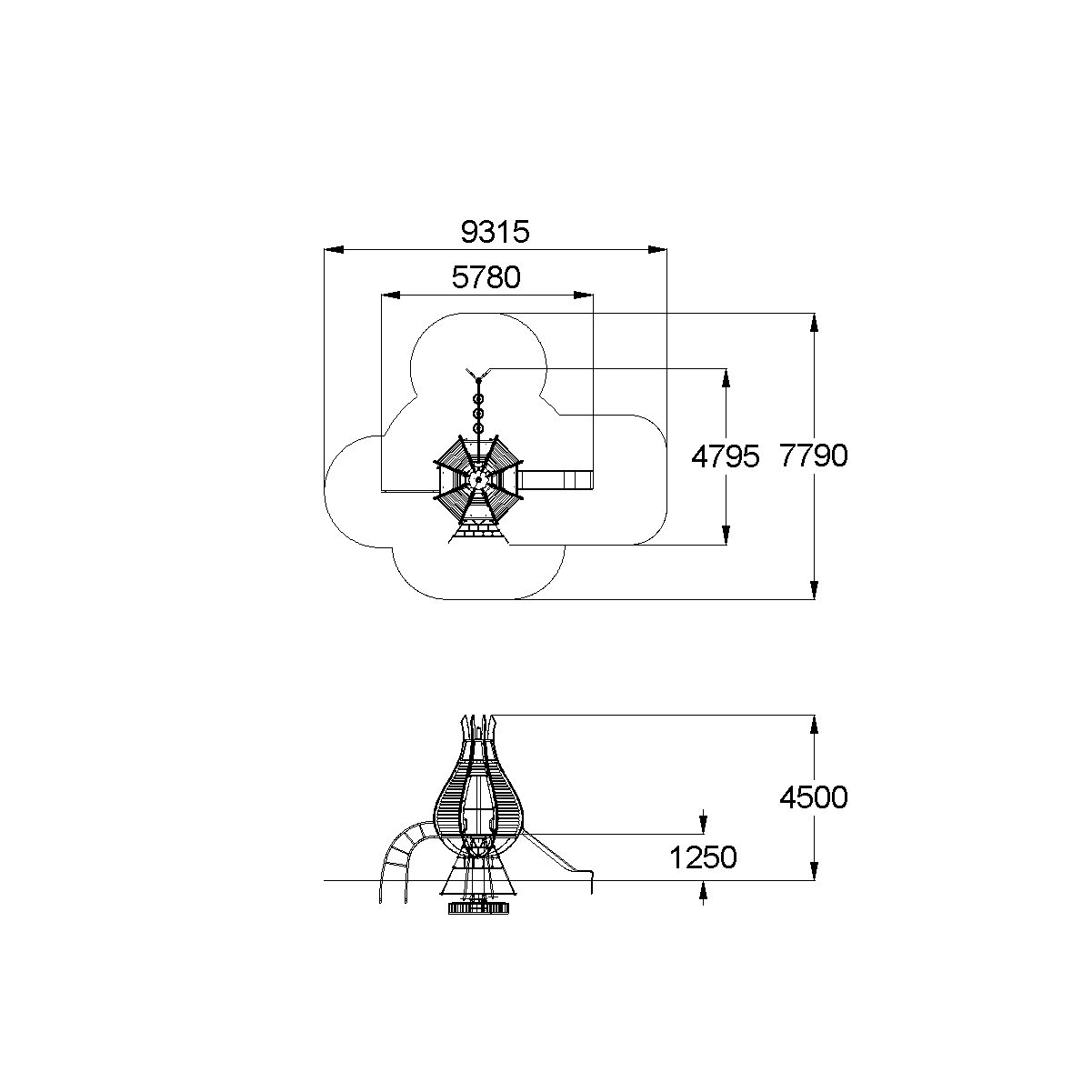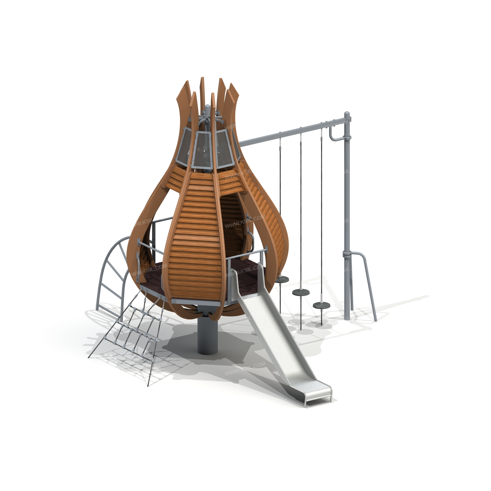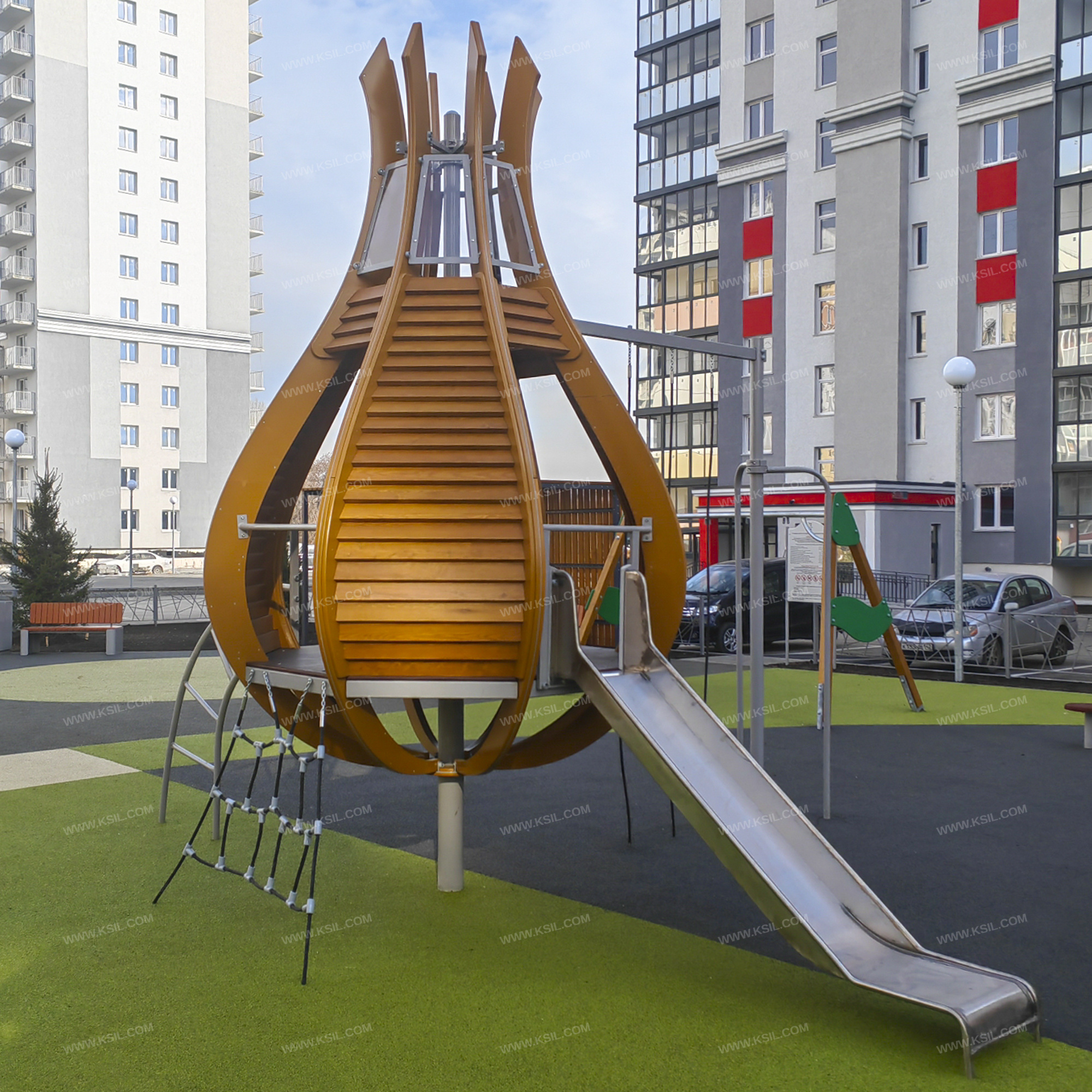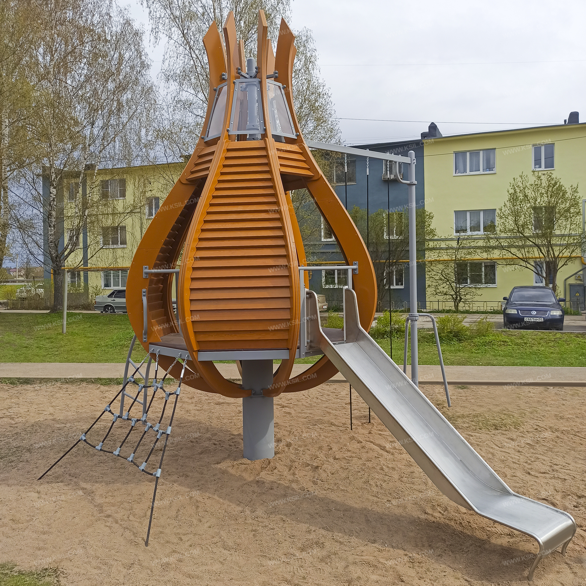 Детский игровой комплекс должен представлять собой модульную сборно-разборную конструкцию в виде закрытого тюльпана. К башне с высотой площадки не менее 1250 мм должны быть пристроены: горка-скат со входом, изогнутая металлическая лестница со входом, сетка-трапеция, поручни, перекладина, переход с 3-мя подвесными круглыми ступенями на канате и двумя приставными шестами. Башня тюльпана состоит из ребер тюльпана, дощатого ограждения и накладок тюльпана, окон вершины тюльпана, стойки центральной, верхнего кронштейна, пола, стойки основания тюльпана.Горка-скат должна быть выполнена из нержавеющей стали толщиной не менее 2 мм с высотой стартового участка не менее 1250 мм. Горка должна состоять из каркаса, выполненного из трубы диаметром не менее 27 мм, ската с бортиками высотой не менее 150 мм и защитной секции при выходе на горку. Скат горки должен быть изготовлен из единого листа нержавеющей стали. Поручни, перекладины выполнены из трубы диаметром не менее 33,5 мм. Вход к изогнутой металлической лестнице состоит из перекладины, выполненной из трубы диаметром не менее 33,5 мм, с приваренной к ней трубой сечением не менее 25х50 мм. Вход к горке-скату состоит из перекладины, выполненной из трубы диаметром 33,5 мм, с приваренными к ней трубами сечением не менее 25х50 мм и фанерных накладок, выполненных из влагостойкой фанеры толщиной не менее 15 мм.Наклонная сетка-трапеция должна быть выполнена из полипропиленового 6-прядного армированного металлом каната тросовой свивки с резиновым сердечником, канат сетки должен быть диаметром не менее 16 мм и соединен между собой пластиковыми креплениями Т-образной формы. Нижняя часть сетки с закладной деталью, выполненной из металлической трубы диаметром не менее 33,5 мм, бетонируется в землю. Сетка крепится к основанию тюльпана через откидные болты, которые крепятся через скобу к цепи, запрессованной к концу каната.Изогнутая металлическая лестница должна состоять из двух дуг, выполненных из металлической трубы диаметром не менее 42,3 мм и ступенек из трубы диаметром не менее 33,5 мм. Нижняя часть лестницы бетонируется в землю.Переход с 3-мя подвесными круглыми ступенями на канатах и двумя приставными шестами состоит из балки, выполненной из металлической трубы сечением не менее 40х80 мм, к которой крепятся ступени на канате, выполненные из резинового диска Ø280мм, закрепленного на полипропиленовом канате на разных высотных отметках. Низ канатов бетонируется в землю с помощью закладной трубы диаметром не менее 33,5 мм и арматуры диаметром не менее 10 мм. Балка крепится на встречную стойку, выполненную из металлической трубы диаметром не менее 89 мм. К стойке приставлены два Г-образных шеста, выполненные из металлической трубы диаметром не менее 42,3 мм. Ребра тюльпана состоят из двух фанерных накладок, выполненных из влагостойкой фанеры толщиной не менее 21 мм, и сердцевиной межу ними, выполненной из металлического листа толщиной не менее 3 мм. Дощатое ограждение выполнено из лиственницы сечением не менее 30х100 ммНакладки тюльпана выполнены из влагостойкой фанеры толщиной не менее 21 ммОкна вершины тюльпана выполнены из металлического листа толщиной не менее 3 мм и дополнены вставкой из поликарбоната толщиной не менее 8 мм.Стойка центральная должна быть выполнена из металлической трубы диаметром не менее 89 мм. Сверху ст