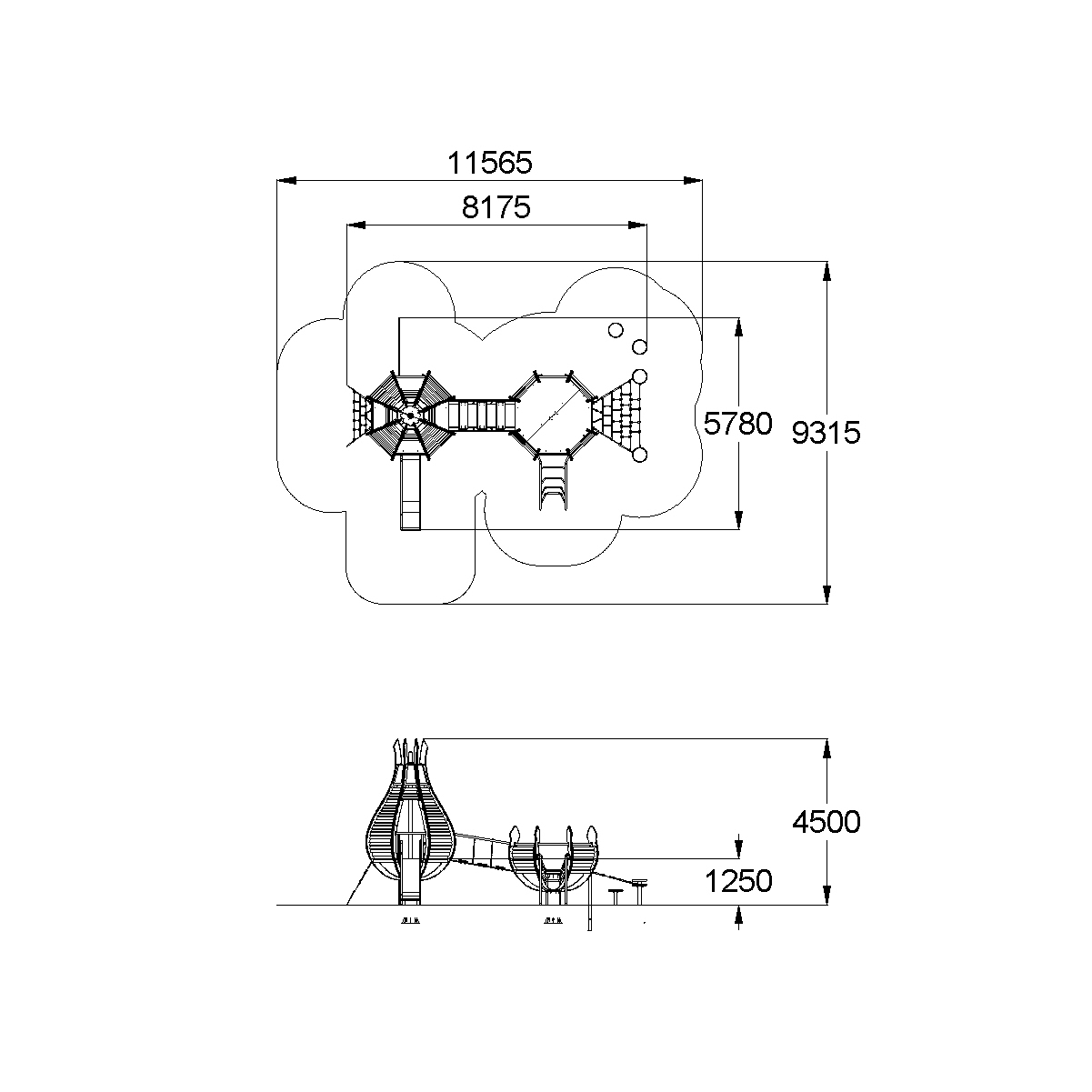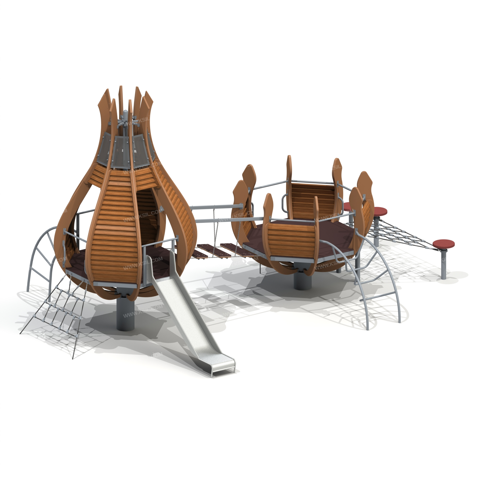 Детский игровой комплекс должен представлять собой модульную сборно-разборную конструкцию в виде закрытого тюльпана и башне открытого тюльпана соединенных между собой подвесными мостами. К башне с высотой площадки не менее 1250 мм должны быть пристроены: горка-скат со входом, изогнутая металлическая лестница со входом, сетка-трапеция, поручни, перекладина, подвесной мост разноуровневый. К башне с высотой площадки не менее 950 мм должны быть пристроены: наклонная лиана, гибкая канатная лестница, поручни, перекладины, сетка трапеция с круглыми резиновыми ступенями, подвесной мост разноуровневый. Башня закрытого тюльпана состоит из ребер тюльпана, дощатого ограждения и накладок тюльпана, окон вершины тюльпана, стойки центральной, верхнего кронштейна, пола, стойки основания тюльпана.Башня открытого тюльпана состоит из ребер тюльпана, дощатого ограждения и накладок тюльпана, пола, стойки основания тюльпана и защитных перекладин.Горка-скат должна быть выполнена из нержавеющей стали толщиной не менее 2 мм с высотой стартового участка не менее 1250 мм. Горка должна состоять из каркаса, выполненного из трубы диаметром не менее 27 мм, ската с бортиками высотой не менее 150 мм и защитной секции при выходе на горку. Скат горки должен быть изготовлен из единого листа нержавеющей стали. Поручни, перекладины выполнены из трубы диаметром не менее 33,5 мм. Вход к изогнутой металлической лестнице состоит из перекладины, выполненной из трубы диаметром не менее 33,5 мм, с приваренной к ней трубой сечением не менее 25х50 мм. Вход к горке-скату состоит из перекладины, выполненной из трубы диаметром 33,5 мм, с приваренными к ней трубами сечением не менее 25х50 мм и фанерных накладок, выполненных из влагостойкой фанеры толщиной не менее 15 мм.Наклонная сетка-трапеция должна быть выполнена из полипропиленового 6-прядного армированного металлом каната тросовой свивки с резиновым сердечником, канат сетки должен быть диаметром не менее 16 мм и соединен между собой пластиковыми креплениями Т-образной формы. Нижняя часть сетки с закладной деталью, выполненной из металлической трубы диаметром не менее 33,5 мм, бетонируется в землю. Сетка крепится к основанию тюльпана через откидные болты, которые крепятся через скобу к цепи, запрессованной к концу каната.Изогнутая металлическая лестница должна состоять из двух дуг, выполненных из металлической трубы диаметром не менее 42,3 мм и ступенек из трубы диаметром не менее 33,5 мм. Нижняя часть лестницы бетонируется в землю.Наклонная лиана должна состоять из 2-х наклонных дуг, выполненных из металлической трубы диаметром не менее 42,3 мм и П-образных ступенек из трубы диаметром не менее 33,5 мм. Нижняя часть лианы бетонируется в землю.Ребра тюльпана состоят из двух фанерных накладок, выполненных из влагостойкой фанеры толщиной не менее 21 мм, и сердцевиной межу ними, выполненной из металлического листа толщиной не менее 3 мм. Дощатое ограждение выполнено из лиственницы сечением не менее 30х100 ммНакладки тюльпана выполнены из влагостойкой фанеры толщиной не менее 21 ммОкна вершины тюльпана выполнены из металлического листа толщиной не менее 3 мм и дополнены вставкой из поликарбоната толщиной не менее 8 мм.Стойка центральная должна быть выполнена из металлической трубы диаметром не менее 89 мм. Сверху столб должен заканчиваться заглу