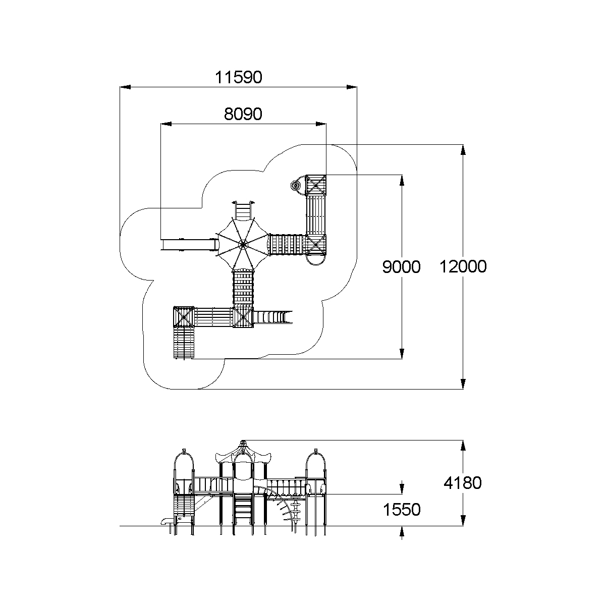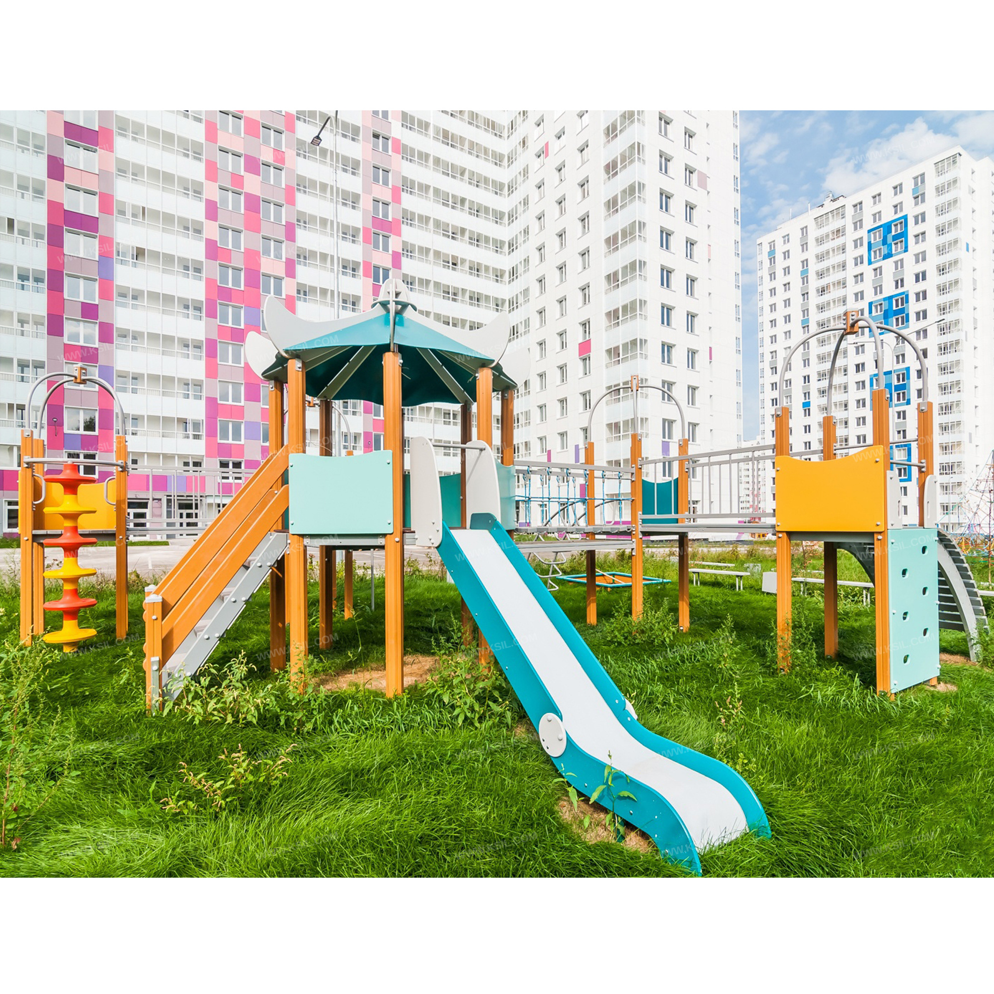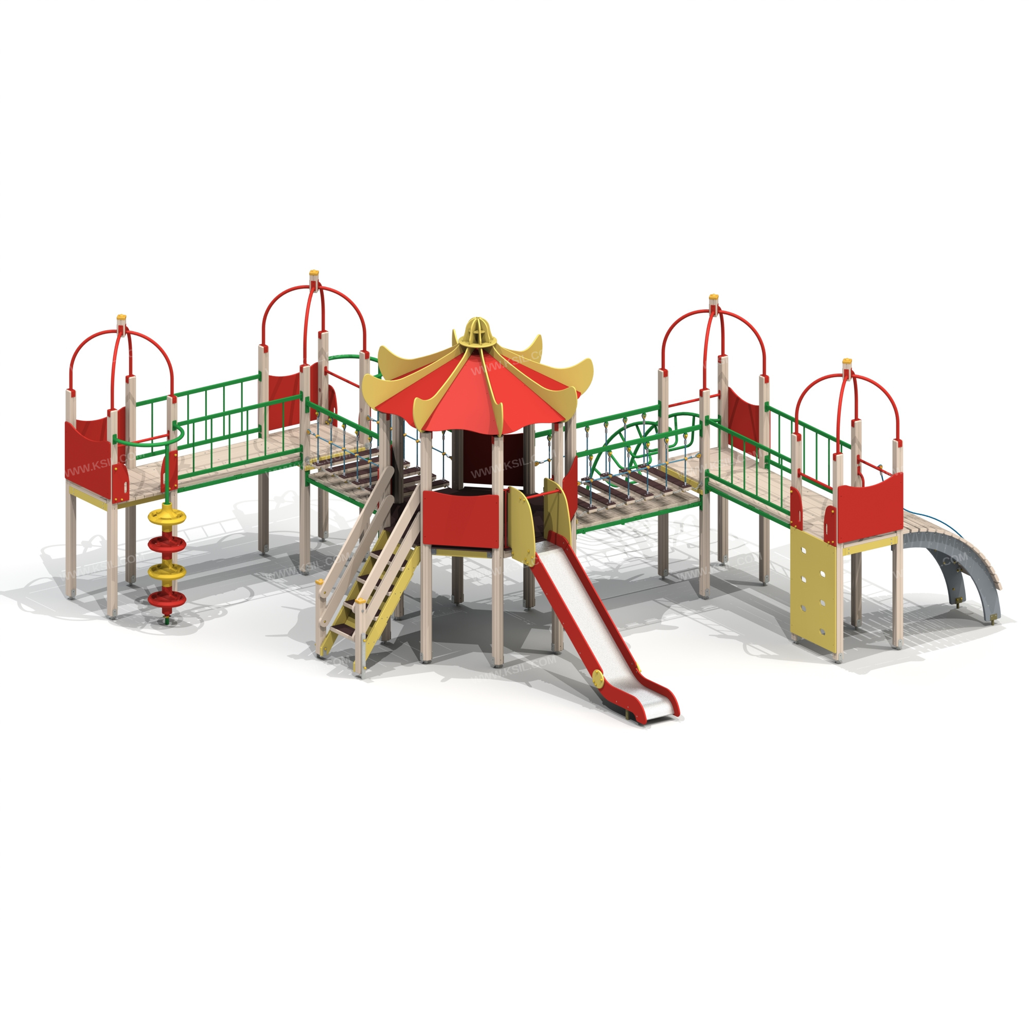 Детский игровой комплекс должен представлять собой модульную сборно-разборную конструкцию и состоять из 5-ти башен, одна из которых восьмигранная, соединенных между собой 2-мя прямыми и 2-мя подвесным мостами. К башне 1 с каркасом крыши, с высотой площадки не менее 1550 мм, должны быть пристроены: вертикальный шест с кольцами, перекладина, фанерные поручни и ограждения.К башне 2 с каркасом крыши, высотой площадки не менее 1550 мм, должны быть пристроены: фанерные поручни и ограждение, вертикальный шест с креплением в виде дуги, перекладина, поручни.К башне 3 с восьмигранной крышей, с высотой площадки не менее 1550 мм, должны быть пристроены: горка, фанерные ограждения, лестница.К башне 4 с каркасом крыши, высотой площадки не менее 1550 мм, должны быть пристроены: фанерное ограждение, перекладина, лиана.К башне 5 с каркасом крыши, высотой площадки не менее 1550 мм, должны быть пристроены: альпинистская стенка, перекладина, фанерные поручни и ограждение, трап-барабан, поручни.Несущие столбы комплекса должны быть выполнены из клееного деревянного бруса сечением не менее 100х100 мм и иметь скругленный профиль с канавкой посередине. Снизу столб должен заканчиваться металлическим оцинкованным подпятником диаметром не менее 42 мм, который бетонируется в землю.Пол башен с каркасом крыши должен быть выполнен из деревянной доски толщиной не менее 40 мм. Пол башни восьмигранной должен быть выполнен из противоскользящей влагостойкой фанеры толщиной не менее 21 мм.Крыша восьмигранная должна состоять из 8-ми скатов, из влагостойкой фанеры толщиной не менее 9 мм и 8-ми фронтонов из влагостойкой фанеры толщиной не менее 21 мм.Металлический каркас крыши башен должен быть выполнен из совокупности металлических труб диаметром не менее 33 мм, соединенных между собой в верхней части пикой, выполненной из деревянного бруса сечением не менее 100х100 мм. Вертикальный шест с дугой должен быть выполнен из металлической трубы диаметром не менее 42 мм. Нижняя часть шеста бетонируется в землю. Вертикальный шест с кольцами и креплением в виде дуги должен быть выполнен из металлической трубы диаметром не менее 48 мм, кольца должны быть выполнены из пластика. Нижняя часть шеста бетонируется в землю.Альпинистская стенка с отверстиями для рук и ног должна быть выполнена из влагостойкой фанеры толщиной не менее 21 мм.Трап- барабан должен состоять из направляющих опор, состоящих из сдвоенных фанерных частей, толщина фанеры не менее 21 мм, и наборных частей, равномерно распределенных по опорам и выполненных из деревянной доски толщиной 40 мм. Снизу трап-барабан опирается на окрашенный подпятник из металлической трубы диаметром не менее 33 мм, который бетонируется в землю.Лиана должна состоять их 2-х наклонных дуг, выполненных из металлической трубы диаметром не менее 42 мм и П-образных ступенек из трубы диаметром не менее 33 мм. Горка, с высотой стартового участка не менее 1550 мм должна состоять из каркаса, ската, бортиков высотой не менее 150 мм, защитной секции и защитной перекладины. Каркас горки должен быть выполнен из металлической трубы сечением не менее 50х25 мм. Горка должна иметь стартовый участок, участок скольжения и конечный участок. Скат должен быть изготовлен из единого листа нержавеющей стали толщиной 1,5 мм, утопленный в паз бортиков горки. Защитная перекладина должна быть выполне