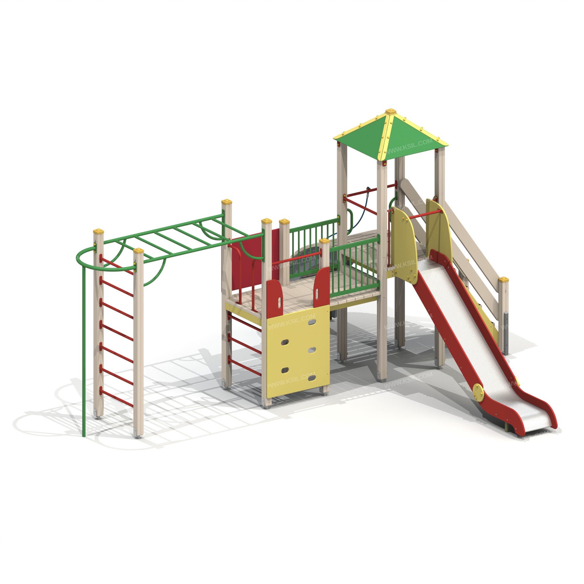 Детский игровой комплекс должен представлять собой модульную сборно-разборную конструкцию и состоять из башни с крышей и полубашни с вынесенным гимнастическим комплексом. К башне с крышей, с высотой площадки не менее 1550 мм должны быть пристроены: лестница, горка, ограждение металлическое, перекладина. К полубашне, с высотой площадки не менее 1250 мм должны быть пристроены: альпинистская стенка, перекладины, вертикальная лестница, поручни Г-образные, фанерные поручни, наклонная лиана.Вынесенный гимнастический комплекс должен состоять из рукохода, шведской стенки, вертикального шеста-спирали и креплением в виде дуги.Несущие столбы комплекса должны быть выполнены из клееного деревянного бруса сечением не менее 100х100 мм и иметь скругленный профиль с канавкой посередине. Сверху открытый столб должен заканчиваться пластиковой заглушкой, снизу столб должен заканчиваться металлическим оцинкованным подпятником диаметром не менее 42 мм, который бетонируется в землю.Пол башни и полубашни должен быть выполнен из деревянной доски толщиной не менее 40 мм. Лестница высотой не менее 1550 мм должна быть оснащены перилами, выполненные из деревянной доски толщиной не менее 40 мм. Перила должны быть установлены от первой ступени. Ступени лестниц должны быть выполнены из ламинированной противоскользящей влагостойкой фанеры толщиной не менее 15 мм и деревянной доски толщиной 40 мм, склеенных между собой. Расстояние между ступенями должно быть одинаковым. Горка должна состоять из каркаса, ската, бортиков, защитной секции и защитной перекладины. Каркас горки должен быть выполнен из металлической трубы сечением не менее 50х25 мм. Горка должна иметь стартовый участок высотой не менее 1550 мм, участок скольжения и конечный участок. Скат должен быть изготовлен из единого листа нержавеющей стали толщиной 1,5 мм, утопленный в паз бортиков горки. Бортики горки, выполненные из влагостойкой фанеры толщиной не менее 21 мм должны быть высотой не менее 150 мм. Защитная перекладина должна быть выполнена из металлической трубы диаметром не менее 33 мм, побуждающая ребенка присесть и установлена на высоте не менее 600 мм от уровня поверхности стартового участка горки. Защитная секция горки должна быть выполнена из влагостойкой фанеры толщиной не менее 21 мм. Ограждение металлическое должно состоять из горизонтальных труб сечением не менее 50х25 мм и вертикальных труб диаметром не менее 21,3 мм, к поручням привариваются фланцы, выполненные из листового металла толщиной не менее 4мм.Наклонная лиана должна состоять из 2-х наклонных дуг выполненных из металлической трубы диаметром не менее 42 мм и П-образных ступенек из трубы диаметром не менее 33 мм. Альпинистская стенка с отверстиями для рук и ног, фанерные поручни должна быть изготовлена из влагостойкой окрашенной фанеры толщиной не менее 21 мм. Рукоход должен состоять из 2-х балок, выполненных из металлической трубы диаметром не менее 42 мм, перекладин и 4-х раскосов из металлической трубы диаметром не менее 33 мм.Вертикальная лестница, перекладины, перекладины шведской стенки, поручни должны быть выполнены из металлической трубы диаметром не менее 33 мм. Вертикальный шест-спираль должен быть выполнен из металлической трубы диаметром не менее 42 мм, спираль – из трубы диаметром не менее 33 мм. Расстояние между витками спирали 