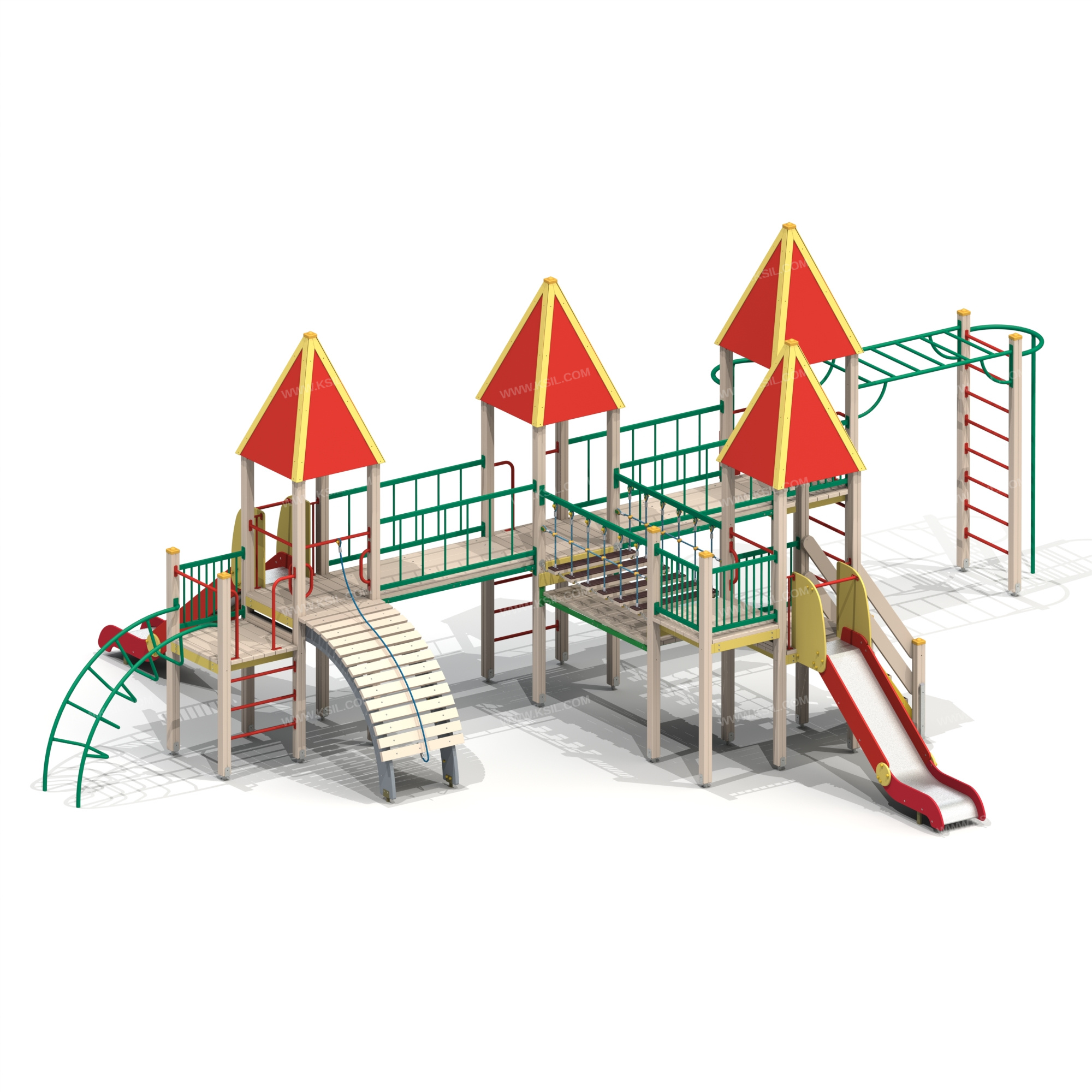 Детский игровой комплекс представляет собой модульную сборно-разборную конструкцию и состоит из четырех башен с крышей, двух полубашен и вынесенного гимнастического комплекса.