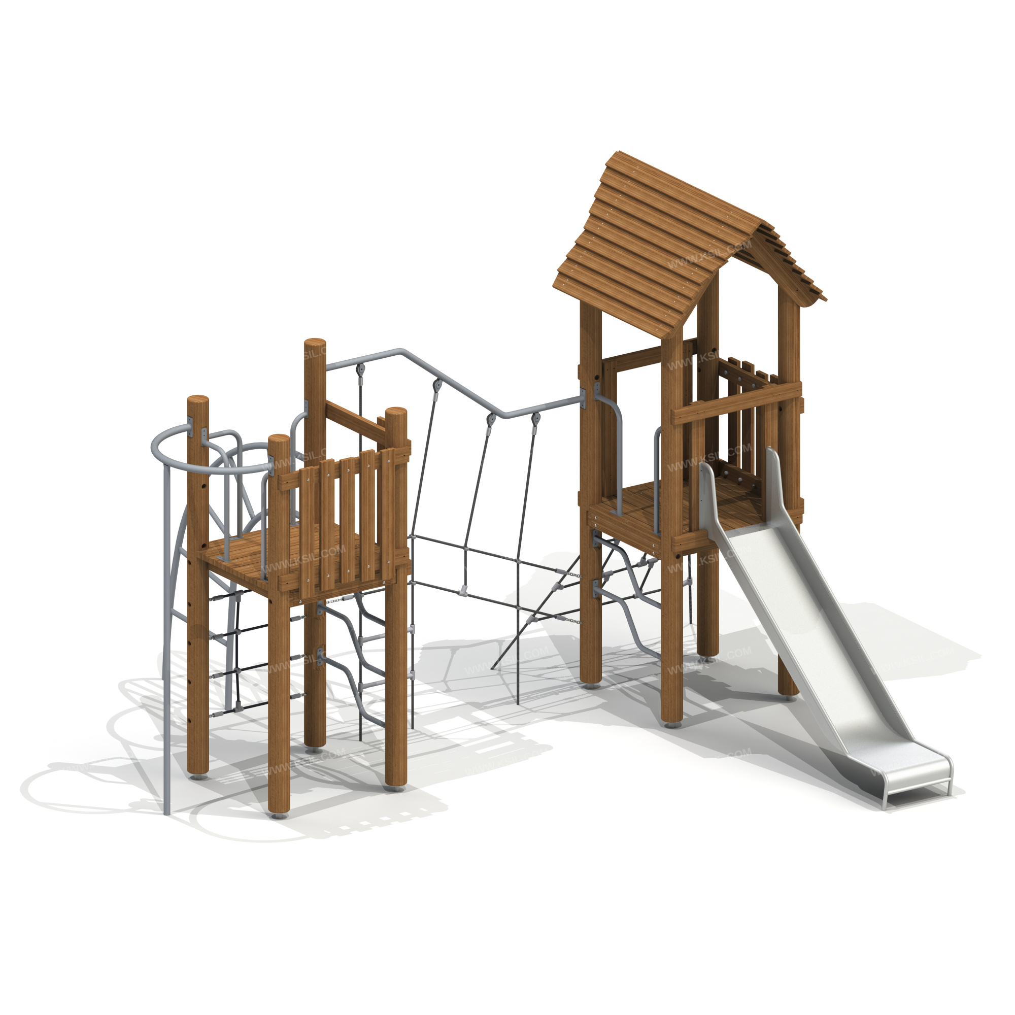 Детский игровой комплекс должен представлять собой модульную сборно-разборную конструкцию и состоять из 2-х башен. Башни должны быть соединены между собой сеткой на балке.