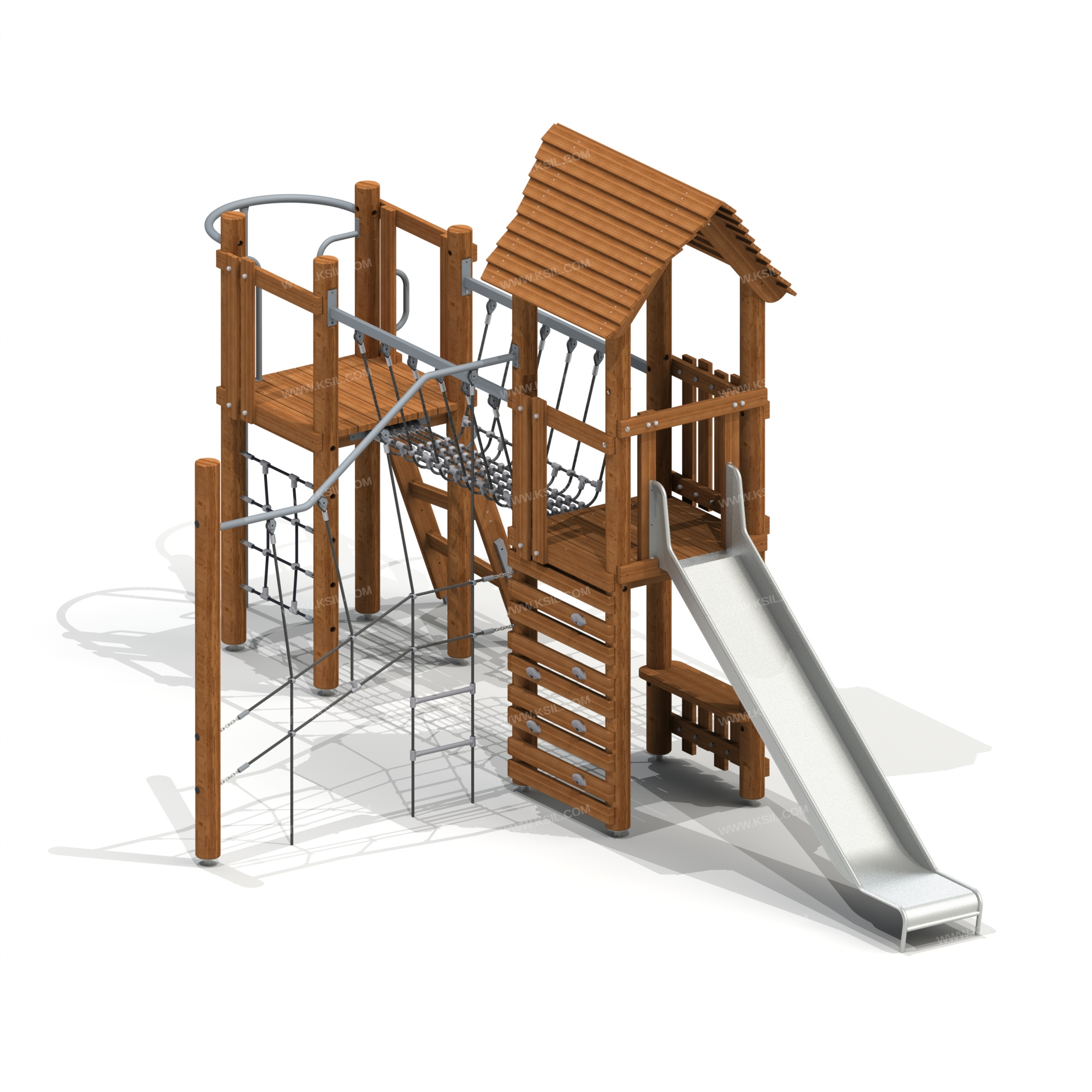 Детский игровой комплекс должен представлять собой модульную сборно-разборную конструкцию и состоять из 2-х башен. Башни должны быть соединены между собой канатным переходом.