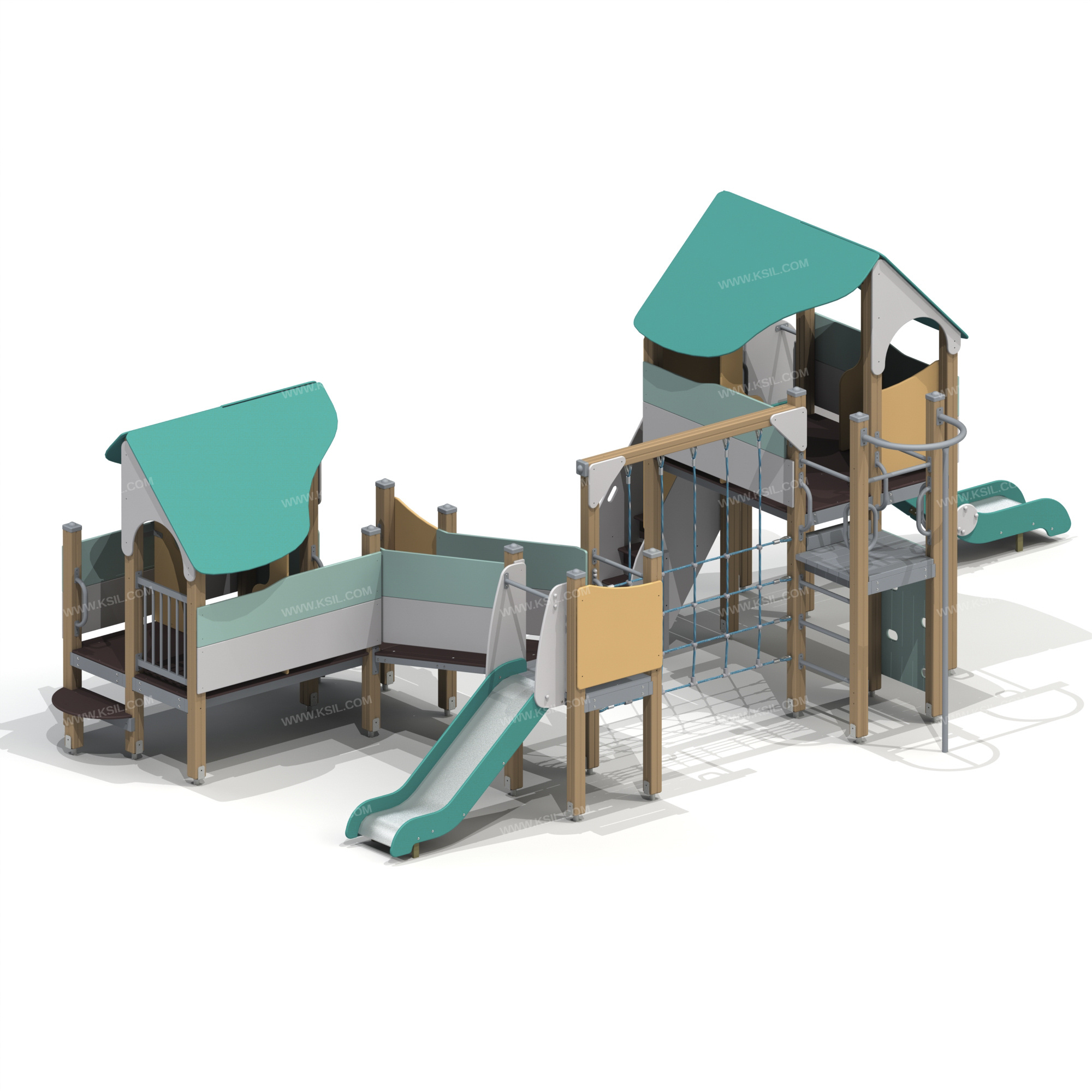 Детский игровой комплекс должен представлять собой модульную сборно-разборную конструкцию, состоящую из одной башни с крышей с полубашней, одной башни без крыши и одной башни с 2-мя полубашнями. Башни должны быть соединены друг с другом наклонным мостом и вертикальной полипропиленовой сеткой для лазанья. К башне 1 с крышей, с высотой площадки не менее 635 мм должны быть пристроены: фанерные ограждения, перегородки.К полубашне 1 с высотой площадки не менее 635 мм должны быть пристроены: фанерные ограждения и металлическое ограждение.К башне 2 без крыши с высотой площадки не менее 950 мм должны быть пристроены: горка, ограждение фанерное, перекладины, поручни. К башне 3 с крышей, с высотой площадки не менее 1550 мм должны быть пристроены: ограждение фанерные, поручни, перегородки.К полубашне 2 с высотой площадки не менее 1250 мм должны быть пристроены: горка, фанерное ограждение, лестница.К полубашне 3 с высотой площадки не менее 1250 мм должны быть пристроены: поручни, перекладины, альпинистская стенка с отверстиями для рук и ног, шест без спирали. Несущие столбы комплекса должны быть выполнены из клееного деревянного бруса сечением не менее 100х100 мм и иметь скругленный профиль с канавкой посередине. Сверху открытый столб должен заканчиваться пластиковой заглушкой, снизу столб должен заканчиваться металлическим оцинкованным подпятником диаметром не менее 42 мм, который бетонируется в землю.Пол полубашни 2 и полубашни 3, башни 2 должен быть выполнен из деревянной доски толщиной не менее 40 мм.Пол башни 1, башни 3 и полубашни 1 должен быть выполнен из влагостойкой противоскользящей фанеры толщиной не менее 21 мм. Крыша башен должна быть двускатной, не сплошной, частично закрывающая площадь пола. Скаты и фронтоны крыши должны быть изготовлены из влагостойкой фанеры толщиной не менее 21 мм.Горка, с высотой стартового участка не менее 950 мм должна состоять из ската, бортиков высотой не менее 100 мм, защитной секции и защитной перекладины.Горка, с высотой стартового участка не менее 1250 мм должна состоять из каркаса, ската, бортиков высотой не менее 150 мм, защитной секции и защитной перекладины.Каркас горки должен быть выполнен из металлической трубы сечением не менее 50х25 мм. Горка должна иметь стартовый участок, участок скольжения и конечный участок. Скат должен быть изготовлен из единого листа нержавеющей стали толщиной 1,5 мм, утопленный в паз бортиков горки. Защитная перекладина должна быть выполнена из металлической трубы диаметром не менее 33 мм, побуждающая ребенка присесть и установлена на высоте не менее 600 мм от уровня поверхности стартового участка горки. Защитная секция и бортики горок, должны быть выполнены из влагостойкой фанеры толщиной не менее 21 мм.Ограждение металлическое должно состоять из горизонтальных труб сечением не менее 50х25 мм и вертикальных труб диаметром не менее 21,3 мм, к горизонтальным трубам привариваются фланцы, выполненные из листового металла толщиной не менее 4мм.Ограждение башен и полубашен, альпинистская стенка перегородки, должны быть выполнены из влагостойкой фанеры толщиной не менее 21 мм. Перекладины, поручни должны быть выполнены из металлической трубы диаметром не менее 33 мм. Вертикальный шест без спирали с креплением в виде дуги должен быть выполнен из металлической трубы диаметром не менее 42 мм. Нижняя часть 