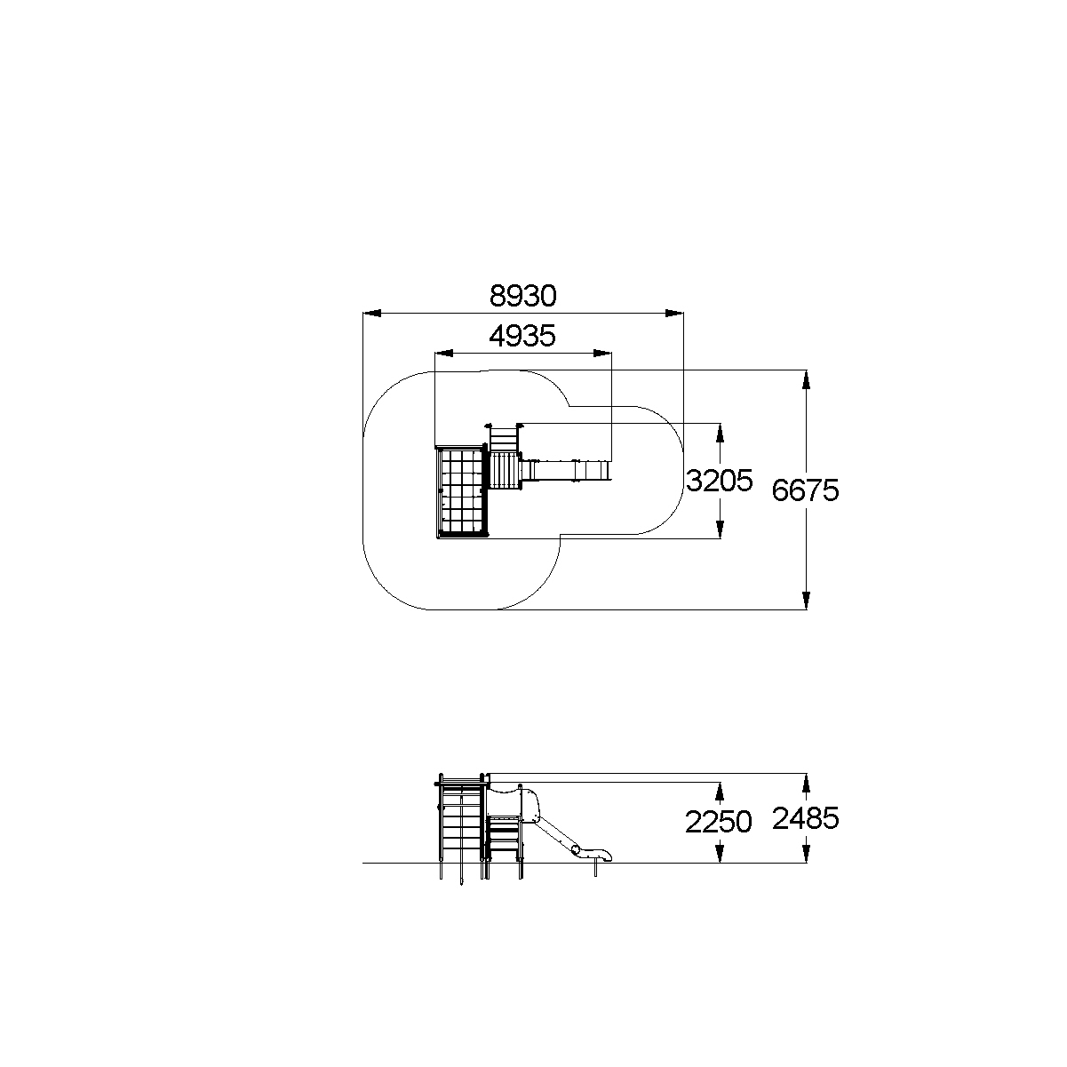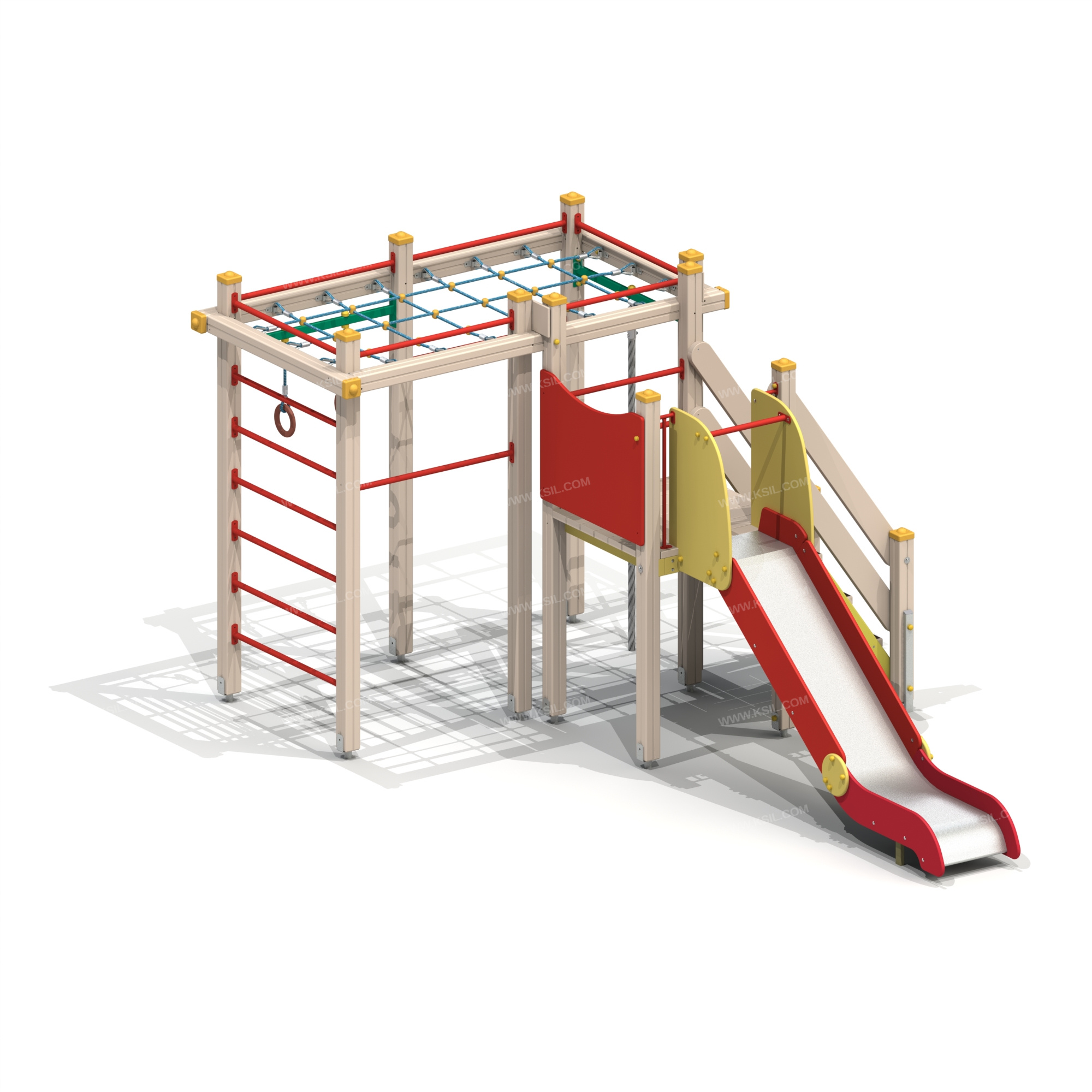 Детский игровой комплекс должен состоять из башни треугольной формы с вынесенным гимнастическим комплексом. К башне, с высотой площадки не менее 1245 мм, должны быть пристроены: лестница, горка, фанерное ограждение, перекладины. Вынесенный гимнастический комплекс должен представлять собой конструкцию, состоящую из несущих столбов, установленных в два ряда, параллельно друг другу. В каждом ряду несущие стойки в верхней части должны быть соединены балками и горизонтальными столбами. В верхней части должна быть расположена полипропиленовая сетка, боковые проемы гимнастического комплекса должны быть оснащены: шведской стенкой, гимнастическими кольцами, усиленными перекладинами канатом.Несущие вертикальные и горизонтальные столбы комплекса должны быть выполнены из клееного деревянного бруса сечением не менее 100х100 мм и иметь скругленный профиль с канавкой посередине. Сверху вертикальный столб должен заканчиваться пластиковой заглушкой, снизу столб должен заканчиваться металлическим оцинкованным подпятником диаметром не менее 42 мм, который бетонируется в землю. Пол башни должен быть изготовлен из влагостойкой ламинированной нескользящей фанеры толщиной не менее 21 мм. Фанерное ограждение должно быть выполнено из влагостойкой окрашенной фанеры толщиной не менее 21 мм. Лестница высотой не менее 1245 мм должна быть оснащена перилами, выполненными из деревянной доски толщиной не менее 40 мм. Перила должны быть установлены от первой ступени. Ступени лестниц должны быть выполнены из ламинированной противоскользящей влагостойкой фанеры толщиной не менее 15 мм и деревянной доски толщиной 40 мм, склеенных между собой. Расстояние между ступенями должно быть одинаковым. Горка должна состоять из каркаса, ската, бортиков, защитной секции и защитной перекладины. Каркас горки должен быть выполнен из металлической трубы сечением не менее 50х25 мм. Горка должна иметь стартовый участок высотой не менее 1245 мм, участок скольжения и конечный участок. Скат должен быть изготовлен из единого листа нержавеющей стали толщиной 1,5 мм, утопленный в паз бортиков горки. Бортики горки, выполненные из влагостойкой фанеры толщиной не менее 21 мм должны быть высотой не менее 150 мм. Защитная перекладина должна быть выполнена из металлической трубы диаметром не менее 33 мм, побуждающая ребенка присесть и установлена на высоте не менее 600 мм от уровня поверхности стартового участка горки. Защитная секция горки должна быть выполнена из влагостойкой фанеры толщиной не менее 21 мм. Перекладины шведской стенки, перекладины усиленные, балки должны быть выполнены из металлической трубы диаметром не менее 33 мм. Канат должен быть полиамидный или полипропиленовый диаметром не менее 40 мм и подвешен на перекладине выполненной из профильной трубы сечением не менее 50х25 мм с раскосами из трубы диаметром не менее 26 мм.Перекладина с гимнастическими кольцами должна быть выполнена из металлической профильной трубы сечением не менее 50х25 мм, гибкой подвески и колец из влагостойкой фанеры или пластика.