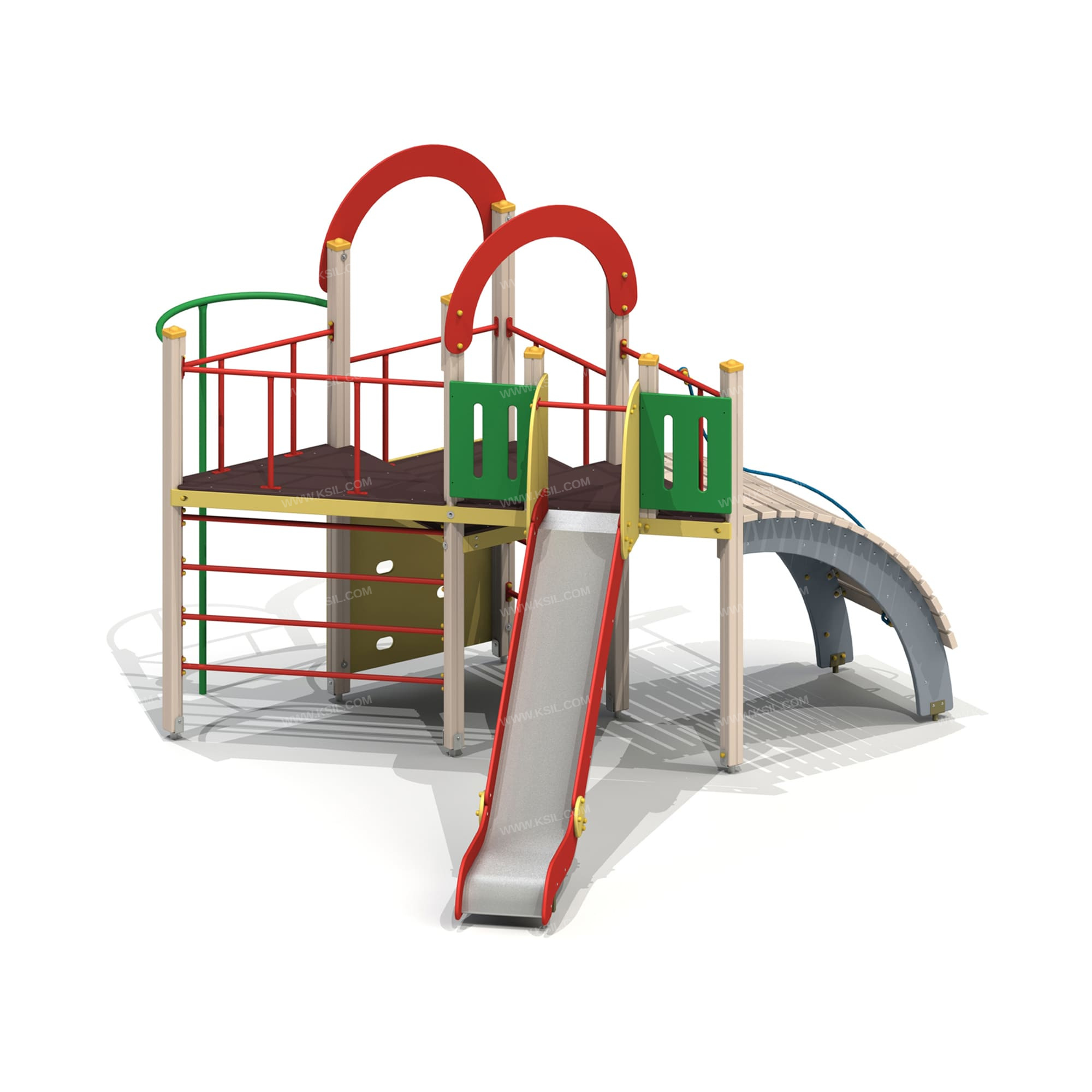 Металлические элементы должны быть покрыты порошковыми красками или подвергнуты гальванизации. Сварные швы должны быть гладкими и исключать возможность травмирования пользователей при контакте. Металлические элементы конструкции не должны состоять из нескольких частей, соединенных между собой.Весь крепеж должен быть оцинкован, все углы закруглены радиусом не менее 3 мм. Концы труб должны быть закрыты.Деревянный брус должен быть склеен под прессом из нескольких отборных сосновых досок, подвергнутых специальной обработке и сушке до мебельной влажности 7-10% для придания особой прочности несущим конструкциям.Деревянные доски хвойных пород дерева должны быть подвергнуты специальной обработке и сушке до мебельной влажности 7-10% для придания особой прочности несущим конструкциямФанера влагостойкая не ниже I сорта изготовленная из шлифованного березового шпона повышенной водостойкости, склеенного клеем класса эмиссии Е1 с предварительной заделкой (замазкой или вставками) естественных дефектов древесины.Материалы из древесины не должны иметь на поверхности дефектов обработки. Концы труб должны быть закрыты. Заглушки пластиковые на места резьбовых соединений и крышки на верхние основания несущих столбов.Промежутки и стыки между элементами оборудования не должны допускать застревания частей тела и одежды пользователей. В конструкции должна быть предусмотрена возможность доступа взрослого при обстоятельствах, требующих посторонней помощи пользователю.C целью повышения качества и безопасности продукции, в документацию на изделие могут вноситься изменения (изображение, размеры, и т.п.).