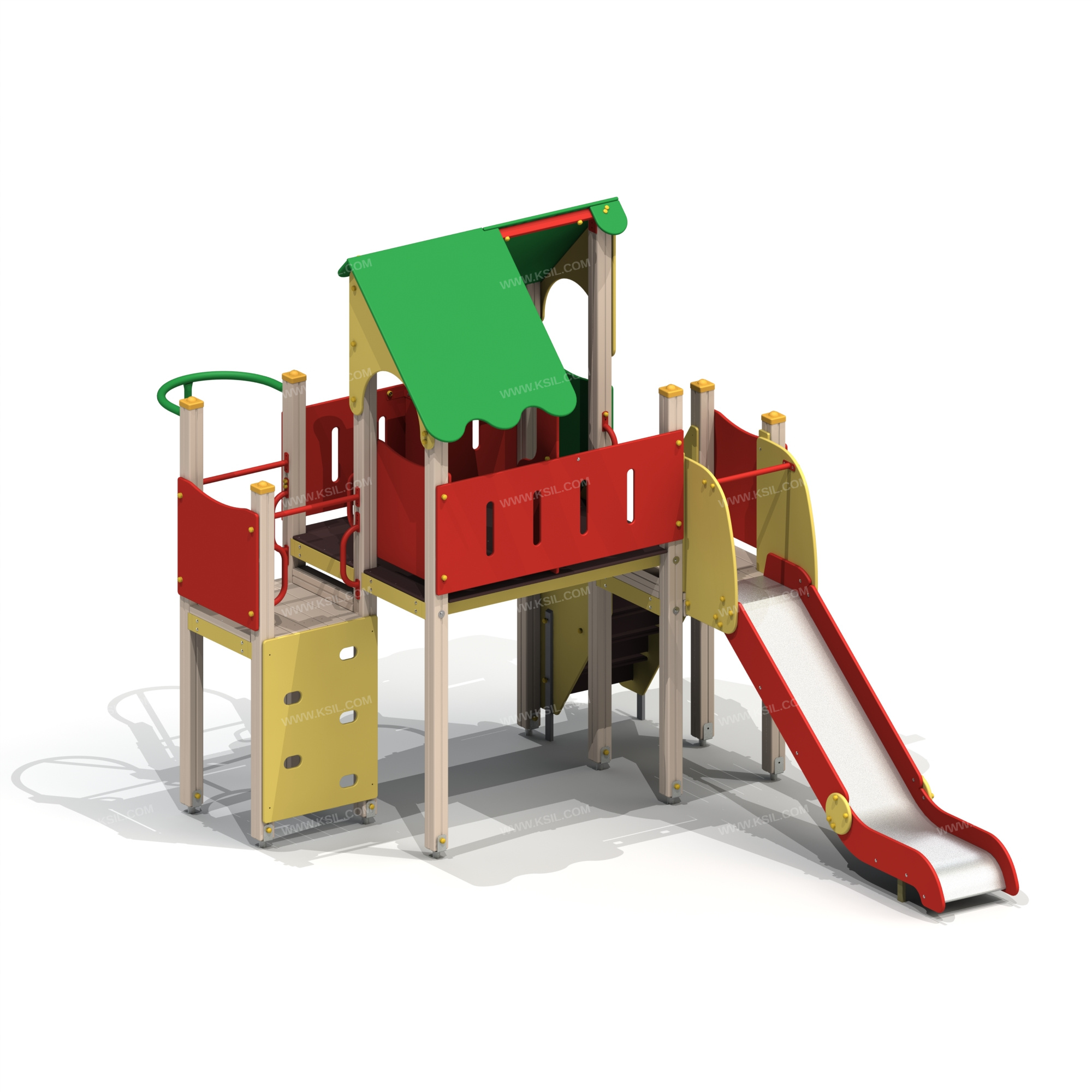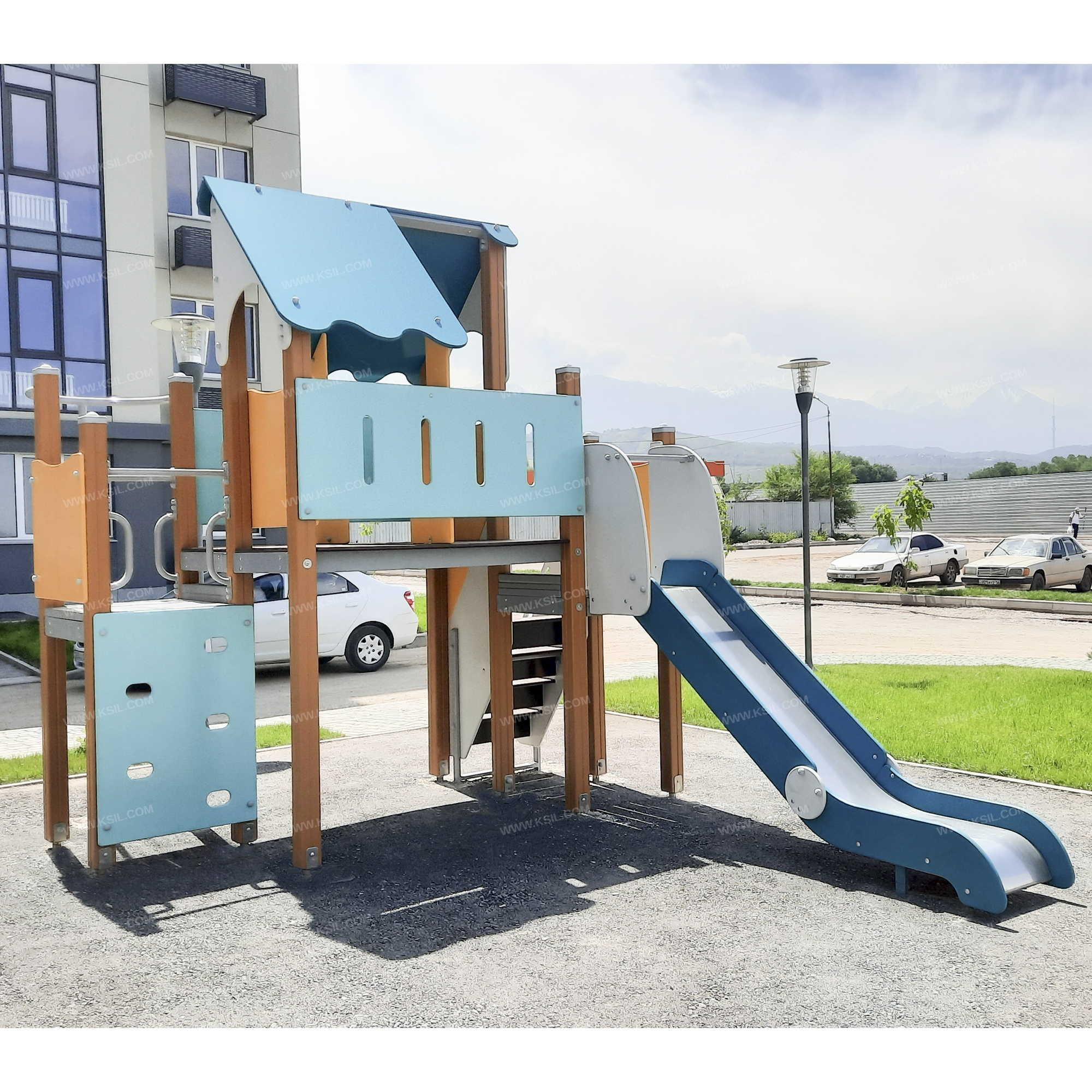 Детский игровой комплекс должен представлять собой модульную сборно-разборную конструкцию, состоящую из одной башни с 2-мя полубашнями. К башне с крышей, с высотой площадки не менее 1530 мм должны быть пристроены: ограждение фанерное, поручни, перегородки.К полубашне 1 с высотой площадки не менее 1250 мм должны быть пристроены: горка, фанерное ограждение, лестница.К полубашне 2 с высотой площадки не менее 1250 мм должны быть пристроены: вертикальный шест без спирали и креплением в виде дуги, поручни, перекладины, альпинистская стенка. Несущие столбы комплекса должны быть выполнены из клееного деревянного бруса сечением не менее 100х100 мм и иметь скругленный профиль с канавкой посередине. Сверху столб должен заканчиваться пластиковой заглушкой, снизу столб должен заканчиваться металлическим оцинкованным подпятником диаметром не менее 42 мм, который бетонируется в землю. Пол полубашен должен быть выполнен из деревянной доски толщиной не менее 40 мм.Крыша башни должна быть двускатной, не сплошной, частично закрывающая площадь пола, визуально деля его на две части. Скаты и фронтоны крыши должны быть изготовлены из влагостойкой фанеры толщиной не менее 21 мм.Горка должна состоять из каркаса, ската, бортиков, защитной секции и защитной перекладины. Каркас горки должен быть выполнен из металлической трубы сечением не менее 50х25 мм. Горка должна иметь стартовый участок высотой не менее 1250 мм, участок скольжения и конечный участок. Скат должен быть изготовлен из единого листа нержавеющей стали толщиной 1,5 мм, утопленный в паз бортиков горки. Бортики горки, выполненные из влагостойкой фанеры толщиной не менее 21 мм должны быть высотой не менее 150 мм. Защитная перекладина должна быть выполнена из металлической трубы диаметром не менее 33 мм, побуждающая ребенка присесть и установлена на высоте не менее 600 мм от уровня поверхности стартового участка горки. Защитная секция горки должна быть выполнена из влагостойкой фанеры толщиной не менее 21 мм. Ограждение башни, ограждение полубашни, перегородки должны быть выполнены из влагостойкой фанеры толщиной не менее 21 мм. Лестница с высотой не менее 1250мм должна быть оснащена 2-я бортами, выполненными из влагостойкой фанеры толщиной не менее 21 мм и поручнем. Один борт имеет отверстия для рук, а на другом борте крепится поручень из трубы не менее 26мм. Борта должны быть установлены от первой ступени. Ступени лестниц, выполнены из ламинированной противоскользящей влагостойкой фанеры толщиной не менее 21 мм. Расстояние между ступенями должно быть одинаковым.Альпинистская стенка с отверстиями для рук и ног должна быть выполнена из влагостойкой фанеры толщиной не менее 21 мм.Вертикальный шест без спирали с креплением в виде дуги должен быть выполнен из металлической трубы диаметром не менее 42 мм. Нижняя часть шеста бетонируется в землю.Поручни должны быть выполнены из металлической трубы диаметром не менее 33 мм.