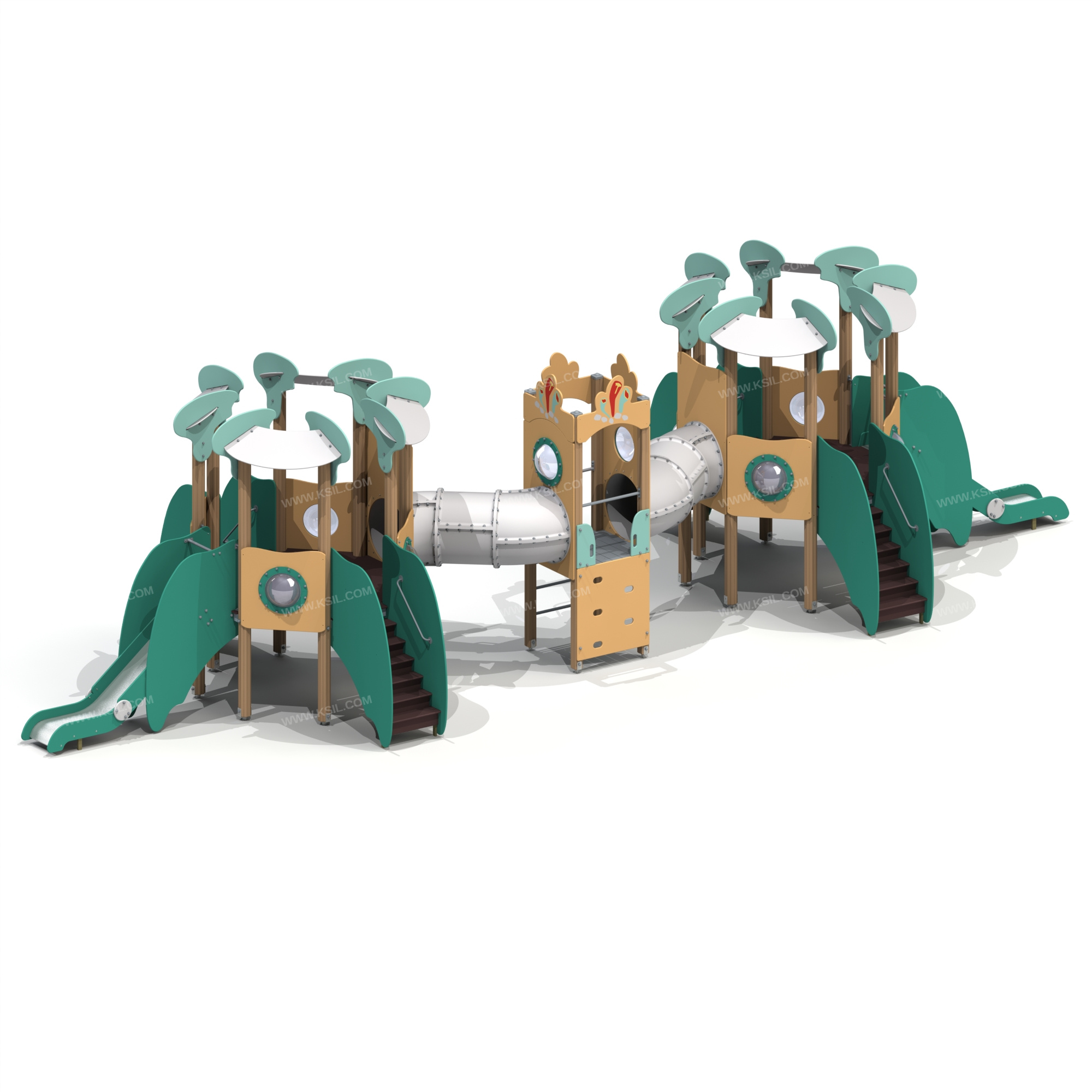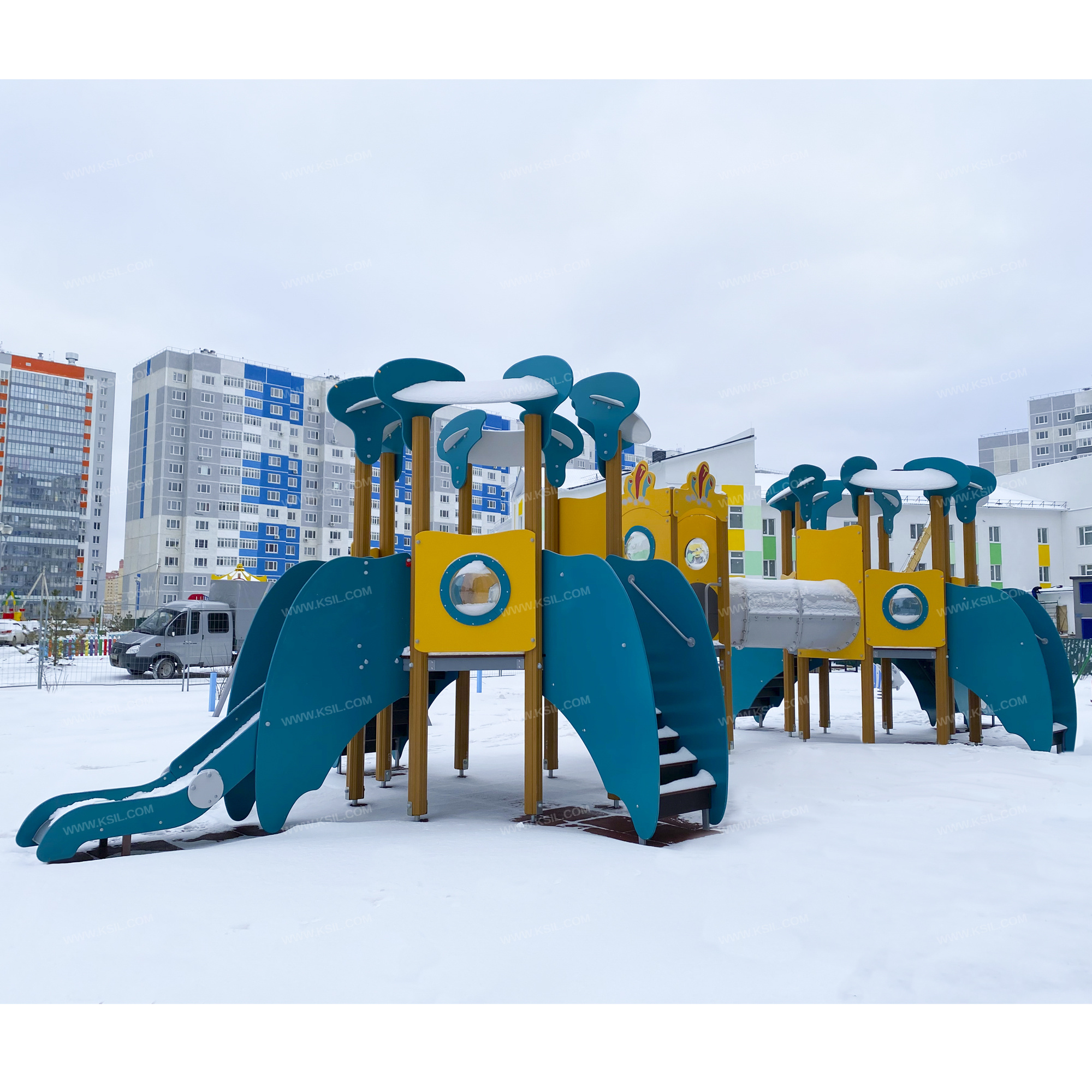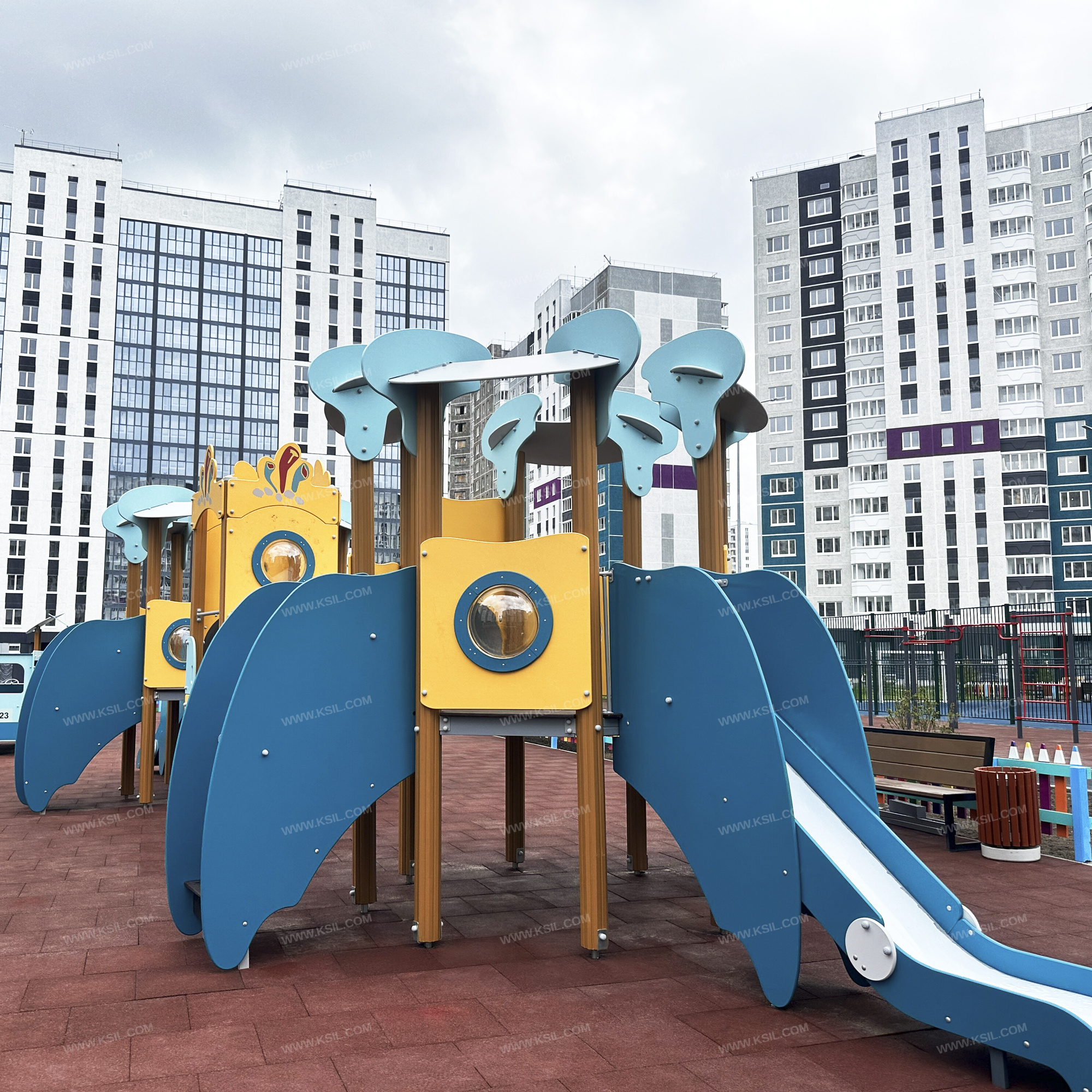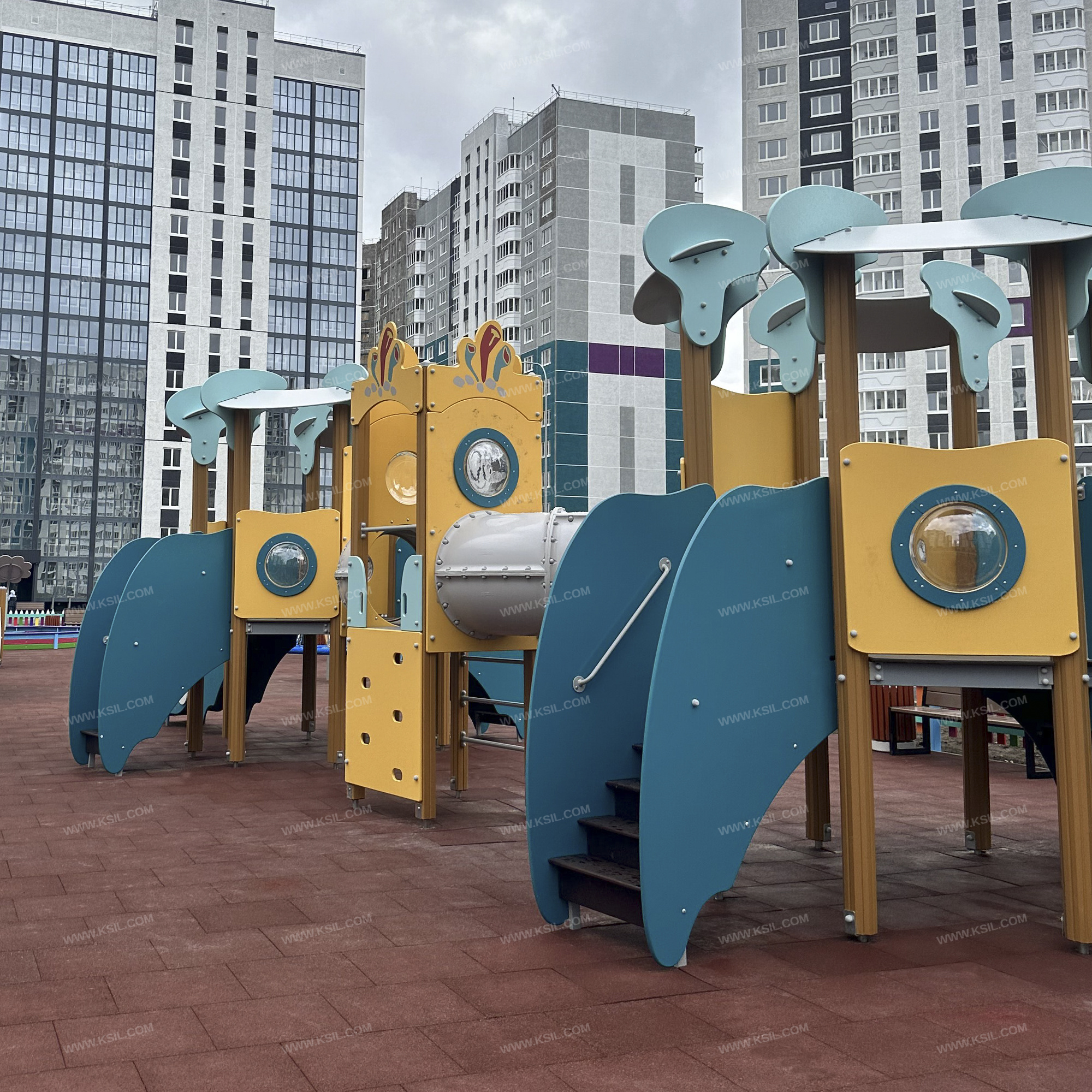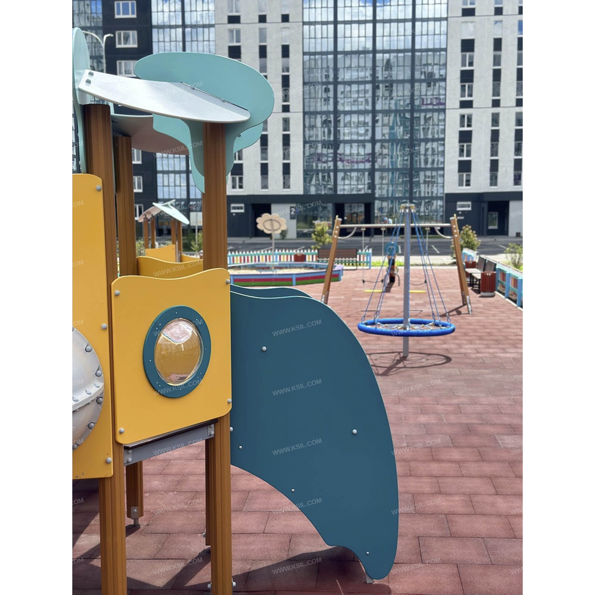 Детский игровой комплекс в морской тематике должен представлять собой модульную сборно-разборную конструкцию в морской тематике. Комплекс должен состоять из 3-х башен, 2 из которых восьмигранные. Башни должны быть соединены между собой двумя тоннельными переходами. К башне 1 восьмигранной, с имитацией крыши первого типа, с высотой площадки не менее 1250 мм должны быть пристроены: горка, две лестницы, фанерные ограждения с иллюминатором К башне 2, с имитацией крыши второго типа, с высотой площадки не менее 1250 мм должны быть пристроены: фанерные поручни, перекладины, фанерные ограждения с иллюминатором, альпинистская стенка с отверстиями для рук и ног.К башне 3 восьмигранной, с имитацией крыши первого типа, с высотой площадки не менее 1250 мм должны быть пристроены: фанерные ограждения с иллюминатором, горка, две лестницы.Несущие столбы комплекса должны быть выполнены из клееного деревянного бруса сечением не менее 100х100 мм и иметь скругленный профиль с канавкой посередине. Сверху открытый столб должен заканчиваться пластиковой заглушкой, снизу столб должен заканчиваться металлическим оцинкованным подпятником диаметром не менее 42 мм, который бетонируется в землю.Пол башен восьмигранной должен быть выполнен из влагостойкой фанеры толщиной не менее 21 мм. Пол башни 2 должен быть выполнен из деревянной доски толщиной не менее 40 мм. Горка должна состоять из каркаса, ската, бортиков, защитной секции и защитной перекладины. Каркас горки должен быть выполнен из металлической трубы сечением не менее 50х25 мм. Горка должна иметь стартовый участок высотой не менее 1250 мм, участок скольжения и конечный участок. Скат должен быть изготовлен из единого листа нержавеющей стали толщиной 1,5 мм, утопленный в паз бортиков горки. Бортики горки должны быть высотой не менее 150 мм. Защитная перекладина должна быть выполнена из металлической трубы диаметром не менее 33 мм, побуждающая ребенка присесть и установлена на высоте не менее 600 мм от уровня поверхности стартового участка горки. Защитная секция горки должна быть выполнена из влагостойкой фанеры толщиной не менее 21 мм. Лестница высотой не менее 1250 мм должна быть оснащена перилами, выполненные из влагостойкой фанеры толщиной 21 мм с поручнем, выполненным из металлической трубы Ø26 мм. Ступени лестниц должны быть выполнены из ламинированной противоскользящей влагостойкой фанеры толщиной не менее 21 мм. Расстояние между ступенями должно быть одинаковым. Перекладины, поручни должны быть выполнены из металлической трубы диаметром не менее 33 мм. Альпинистская стенка, ограждения, ограждения с иллюминаторами, фанерные поручни должны быть выполнены из влагостойкой фанеры толщиной не менее 21 мм.Тоннельный переход должен состоять из пластиковых сегментов и двух стенок-входов с круглым отверстием, равным внутреннему диаметру тоннеля. Стенки должны быть выполнены из влагостойкой фанеры толщиной не менее 21 мм. Сегменты должны быть соединены между собой оцинкованным крепежом с внешней стороны трубы вдоль конструкции. Применяемый пластик не должен быть легковоспламеняющейся.Имитация крыши первого типа должна состоять из 4-х скатов, выполненных из влагостойкой фанеры толщиной не менее 15 мм и 8-ми фигурных фронтонов из влагостойкой фанеры толщиной не менее 21 мм.Имитация крыши второго типа должна состоять из