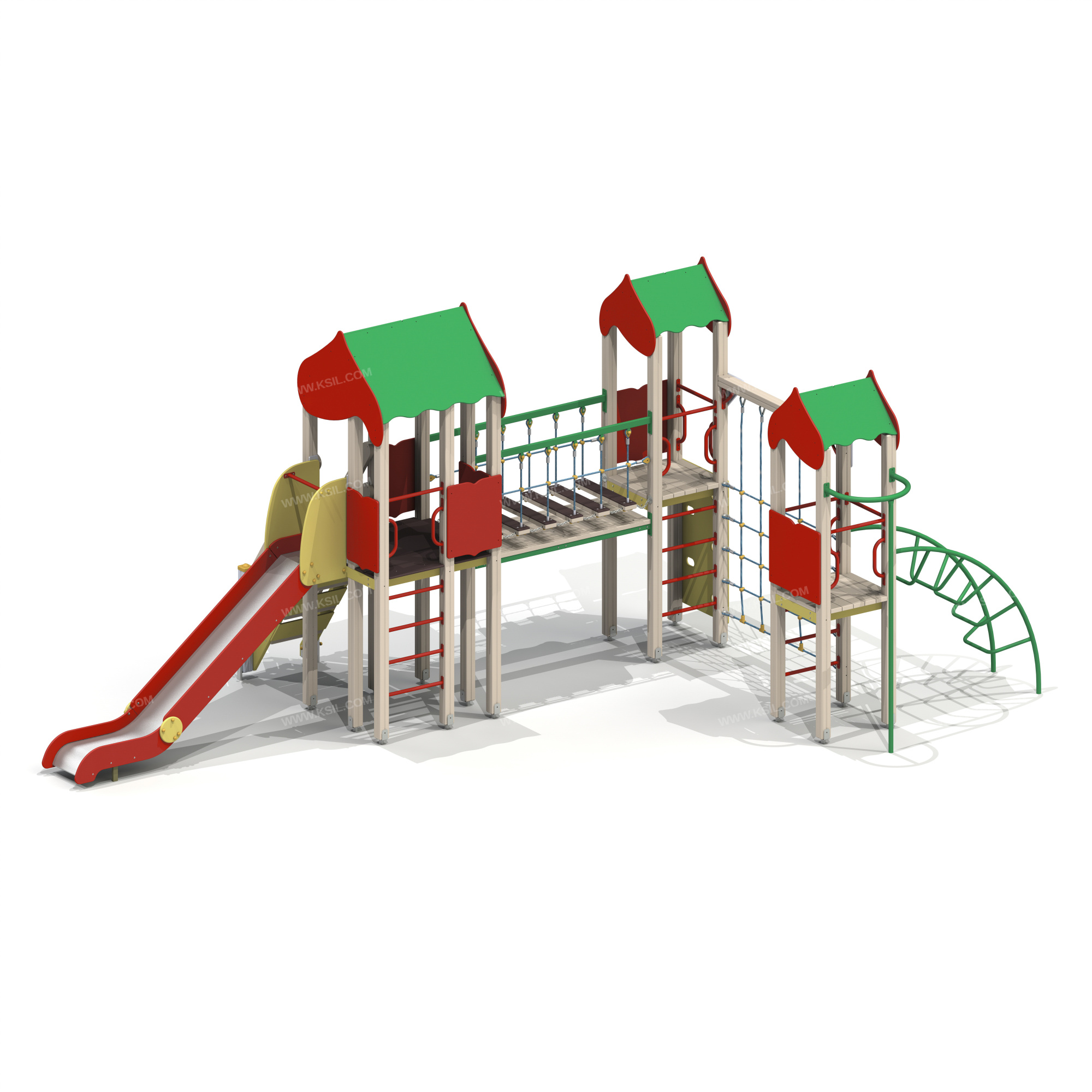 Детский игровой комплекс должен представлять собой модульную сборно-разборную конструкцию, состоящую из трех башен с крышами и соединенных между собой подвесным мостом и вертикальной полипропиленовой сеткой для лазания.К башне 1, с крышей первого типа, с высотой площадки не менее 1550 мм, должны быть пристроены: лестница, горка, фанерные ограждения, ограждение в виде перекладин и вертикальная лестницаК башне 2, с крышей второго типа, с высотой площадки не менее 1550 мм, должны быть пристроены: фанерное ограждение, перекладина, поручни, ограждение в виде перекладин, поручни, альпинистская стенка с отверстиями для рук и ног.К башне 3, с крышей второго типа, с высотой площадки не менее 1250 мм, должны быть пристроены: лиана, вертикальный шест без спирали с креплением в виде дуги, перекладина, поручни, вертикальная лестница, ограждение в виде перекладин, фанерное ограждение. Несущие столбы комплекса должны быть выполнены из клееного деревянного бруса сечением не менее 100х100 мм и иметь скругленный профиль с канавкой посередине. Снизу столб должен заканчиваться металлическим оцинкованным подпятником диаметром не менее 42 мм, который бетонируется в землю.Пол башни 2 и башни 3 должен быть выполнен из деревянной доски толщиной не менее 40 мм.Пол башни 1 должен быть выполнен из противоскользящей влагостойкой фанеры толщиной не менее 21.Крыши башен первого и второго типа должны состоять из 2-х скатов с волнообразной нижней гранью и 2-х фигурных фронтонов выполненных из влагостойкой фанеры толщиной не менее 15 мм.Горка должна состоять из каркаса, ската, бортиков, защитной секции и защитной перекладины. Каркас горки должен быть выполнен из металлической трубы сечением не менее 50х25 мм. Горка должна иметь стартовый участок высотой не менее 1550 мм, участок скольжения и конечный участок. Скат должен быть изготовлен из единого листа нержавеющей стали толщиной 1,5 мм, утопленный в паз бортиков горки. Бортики горки, выполненные из влагостойкой фанеры толщиной не менее 21 мм должны быть высотой не менее 150 мм. Защитная перекладина должна быть выполнена из металлической трубы диаметром не менее 33 мм, побуждающая ребенка присесть и установлена на высоте не менее 600 мм от уровня поверхности стартового участка горки. Защитная секция горки должна быть выполнена из влагостойкой фанеры толщиной не менее 21 мм. Лестница высотой не менее 1550 мм должна быть оснащена перилами, выполненными из деревянной доски толщиной не менее 40 мм. Перила должны быть установлены от первой ступени. Ступени лестниц должны быть выполнены из ламинированной противоскользящей влагостойкой фанеры толщиной не менее 15 мм и деревянной доски толщиной 40 мм, склеенных между собой. Расстояние между ступенями должно быть одинаковым. Лиана должна состоять их 2-х наклонных дуг выполненных из металлической трубы диаметром не менее 42 мм и П-образных ступенек из трубы диаметром не менее 33 мм. Вертикальный шест без дуги должен быть выполнен из металлической трубы диаметром не менее 42 мм. Нижняя часть шеста бетонируется в землю. Альпинистская стенка должна быть выполнена из влагостойкой фанеры толщиной не менее 21 мм.Ограждения башен должны быть выполнены из влагостойкой фанеры толщиной не менее 21 мм.Перекладины вертикальной лестницы, перекладины, поручни, ограждение в виде перекладин должны быть выполн