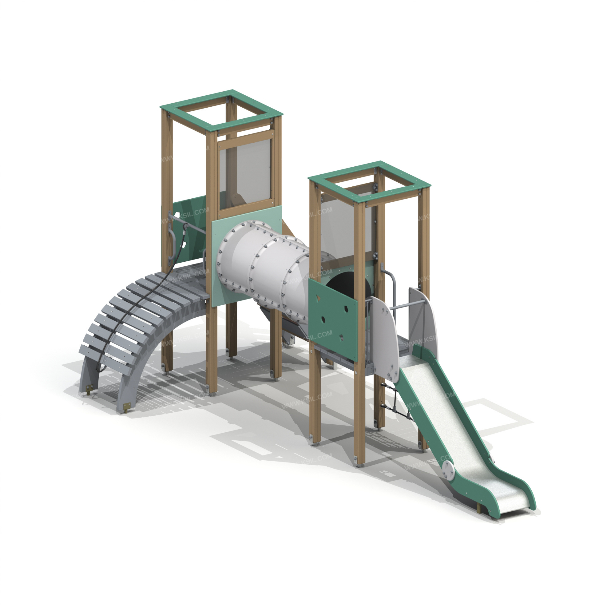 Детский игровой комплекс должен представлять собой модульную сборно-разборную конструкцию. Детский комплекс должен состоять из 2-х башен с открытыми крышами, соединенных между собой тоннельным переходом.К башне 1 с высотой площадки 1250 мм, должны быть пристроены: лестница, фанерное ограждение, ограждение из поликарбоната, трап-барабан с поручнями.К башне 2 с высотой площадки 1250 мм, должны быть пристроены: фанерное ограждение, ограждение из поликарбоната, горка-скат, сетка для лазания с поручнями.Несущие столбы комплекса должны быть выполнены из клееного деревянного бруса сечением не менее 100х100 мм и иметь скругленный профиль с канавкой посередине. Снизу столб должен заканчиваться металлическим оцинкованным подпятником диаметром не менее 42 мм, который бетонируется в землю.Пол башен должен быть выполнен из деревянной доски толщиной не менее 40 мм.Открытые крыши должны состоять из деревянных прогонов, выполненных из доски сечением не менее 100х40, закрепленных к столбам с помощью уголков, выполненных из металлического листа толщиной не менее 3 мм. Сверху на прогоны крепятся декоративные накладные элементы, выполненные из влагостойкой фанеры толщиной не менее 21 мм, Горка должна состоять из каркаса, ската, бортиков, защитной секции и защитной перекладины. Каркас горки должен быть выполнен из металлической трубы сечением не менее 50х25 мм. Горка должна иметь стартовый участок высотой не менее 1250 мм, участок скольжения и конечный участок. Скат должен быть изготовлен из единого листа нержавеющей стали толщиной 1,5 мм, утопленный в паз бортиков горки. Бортики горки, выполненные из влагостойкой фанеры толщиной не менее 21 мм, должны быть высотой не менее 150 мм. Защитная перекладина должна быть выполнена из металлической трубы диаметром не менее 33 мм, побуждающая ребенка присесть и установлена на высоте не менее 600 мм от уровня поверхности стартового участка горки. Защитная секция горки должна быть выполнена из влагостойкой фанеры толщиной не менее 21 мм. Лестница высотой не менее 1250 мм должна быть оснащена перилами, выполненными из деревянной доски толщиной не менее 40 мм. Перила должны быть установлены от первой ступени. Ступени лестниц должны быть выполнены из ламинированной противоскользящей влагостойкой фанеры толщиной не менее 15 мм и деревянной доски толщиной 40 мм, склеенных между собой. Расстояние между ступенями должно быть одинаковым. Ограждения башен должны быть выполнены из влагостойкой фанеры толщиной не менее 21 мм, с декоративными вырезами, не допускающими застреваний тела ребенка. Ограждения башен из поликарбоната должны быть выполнены из прозрачного литого поликарбоната толщиной не менее 10 мм, которые крепятся к деревянным накладкам, выполненным из доски сечением не менее 40х100 мм. Дополнительно ограждения усилены брусками из доски сечением не менее 30х40 мм.К башням ограждения крепятся при помощи уголков, выполненных из металлического листа толщиной не менее 3 мм.Перекладины и поручни должны быть выполнены из металлической трубы диаметром не менее 33 мм. Тоннельный переход должен состоять из пластиковых сегментов и двух стенок-входов с круглым отверстием, равным внутреннему диаметру тоннеля. Стенки должны быть выполнены из влагостойкой фанеры толщиной не менее 21 мм. Сегменты должны быть соединены между собой оцинков