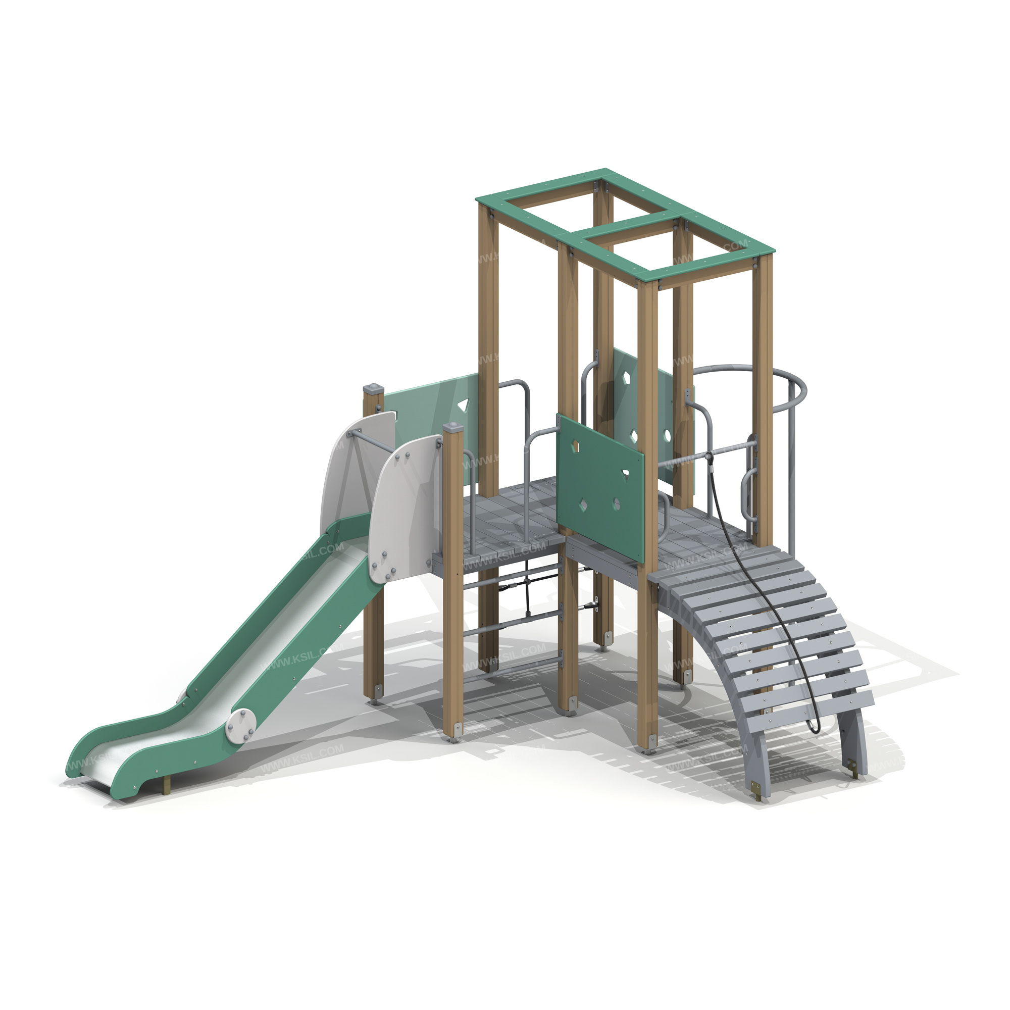 Детский игровой комплекс должен представлять собой модульную сборно-разборную конструкцию. Детский комплекс должен состоять из башни (двойной) с открытыми крышами.К башне с высотой площадки 1250 мм, должны быть пристроены: шведская стенка с поручнями, фанерное ограждение, горка-скат, сетка для лазания с поручнями, трап-барабан с поручнями, вертикальный шест без спирали и с креплением в виде дуги.Несущие столбы комплекса должны быть выполнены из клееного деревянного бруса сечением не менее 100х100 мм и иметь скругленный профиль с канавкой посередине. Снизу столб должен заканчиваться металлическим оцинкованным подпятником диаметром не менее 42,3 мм, который бетонируется в землю.Пол башен должен быть выполнен из деревянной доски толщиной не менее 40 мм.Открытые крыши должны состоять из деревянных прогонов, выполненных из доски сечением не менее 100х40, закрепленных к столбам с помощью уголков, выполненных из металлического листа толщиной не менее 3 мм. Сверху на прогоны крепятся декоративные накладные элементы, выполненные из влагостойкой фанеры толщиной не менее 21 мм, Горка должна состоять из каркаса, ската, бортиков, защитной секции и защитной перекладины. Каркас горки должен быть выполнен из металлической трубы сечением не менее 50х25 мм. Горка должна иметь стартовый участок высотой не менее 1250 мм, участок скольжения и конечный участок. Скат должен быть изготовлен из единого листа нержавеющей стали толщиной 1,5 мм, утопленный в паз бортиков горки. Бортики горки, выполненные из влагостойкой фанеры толщиной не менее 21 мм, должны быть высотой не менее 150 мм. Защитная перекладина должна быть выполнена из металлической трубы диаметром не менее 33,5 мм, побуждающая ребенка присесть и установлена на высоте не менее 600 мм от уровня поверхности стартового участка горки. Защитная секция горки должна быть выполнена из влагостойкой фанеры толщиной не менее 21 мм. Ограждения башен должны быть выполнены из влагостойкой фанеры толщиной не менее 21 мм, с декоративными вырезами, не допускающими застреваний тела ребенка. Перекладины и поручни должны быть выполнены из металлической трубы диаметром не менее 33 мм. Трап-барабан должен состоять из направляющих опор, выполненных из сдвоенных фанерных частей, толщина каждой не менее 21 мм, и наборных частей, равномерно распределенных по опорам и выполненных из деревянной доски толщиной 40 мм. Снизу трап-барабан опирается на окрашенный подпятник из металлической трубы диаметром не менее 33,5 мм, который бетонируется в землю. Трап-барабан должен быть оснащен перекладиной, выполненной из металлической трубы диаметром не менее 33,5 мм с полипропиленовым канатом диаметром не менее 16 мм.Сетка для лазания должна быть выполнена из полипропиленового 6-прядного армированного металлом каната тросовой свивки с резиновым сердечником, канат сетки должен быть диаметром не менее 16 мм и соединен между собой пластиковыми креплениями овальной формы.Вертикальный шест без спирали и с креплением в виде дуги должен быть выполнен из металлической трубы диаметром не менее 42,3 мм. Нижняя часть шеста бетонируется в землю.