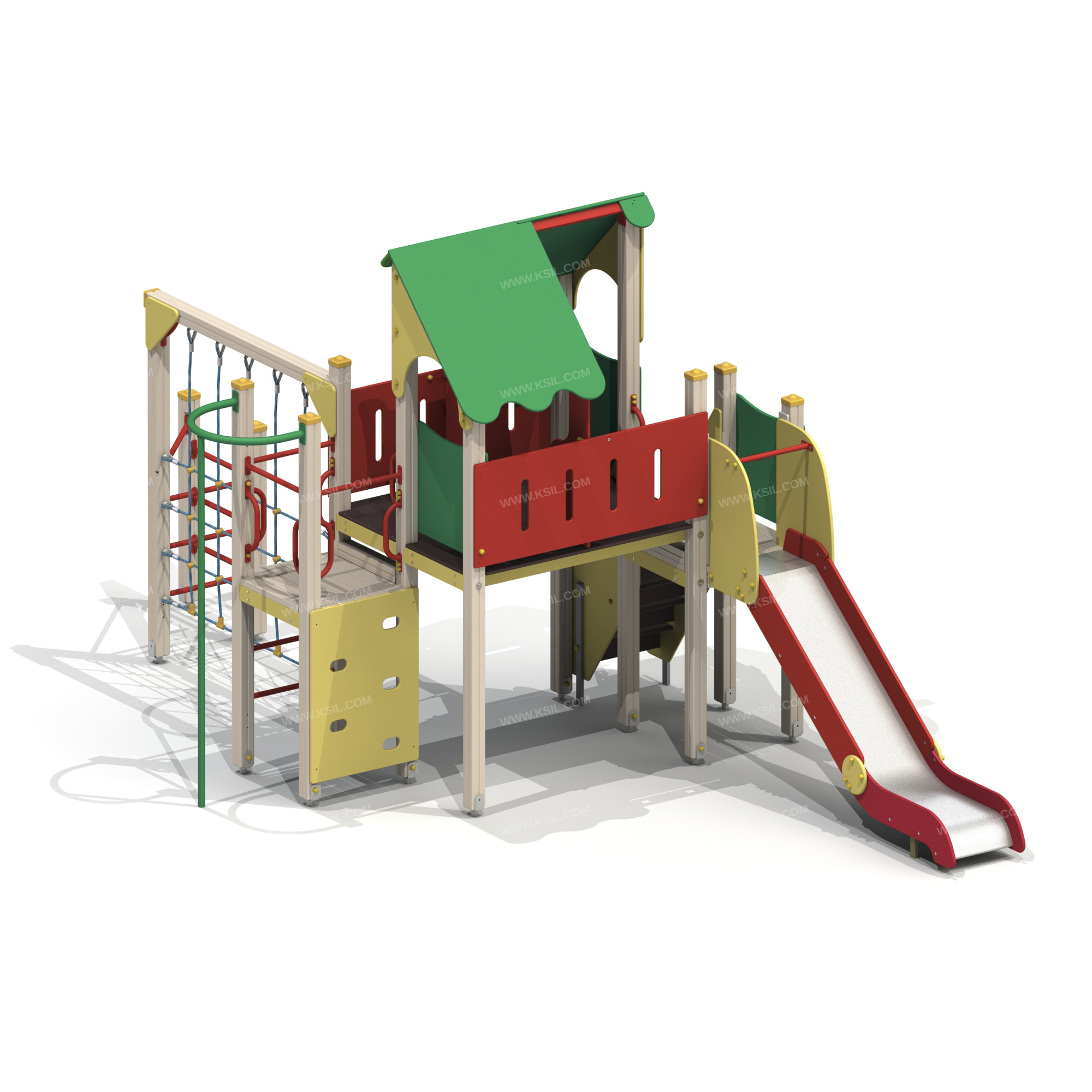 Детский игровой комплекс должен представлять собой модульную сборно-разборную конструкцию, состоящую из одной башни с 2-мя полубашнями с лестницей и горкой, вынесенным гимнастическим комплексом. К башне с крышей, с высотой площадки не менее 1530 мм должны быть пристроены: ограждение фанерное, перегородки.К полубашне 1 с высотой площадки не менее 1250 мм пристроены: горка, фанерное ограждение, лестница.К полубашне 2 с высотой площадки не менее 1250 мм пристроены: вертикальный шест без спирали с креплением в виде дуги, поручни, перекладина. Вынесенный гимнастический комплекс должен состоять из полипропиленовой сетки для лазанья, шведских стенок и перекладины. Несущие столбы комплекса должны быть выполнены из клееного деревянного бруса сечением не менее 100х100 мм и иметь скругленный профиль с канавкой посередине. Сверху столб должен заканчиваться пластиковой заглушкой, снизу столб должен заканчиваться металлическим оцинкованным подпятником диаметром не менее 42 мм, который бетонируется в землю.Пол полубашен должен быть выполнен из деревянной доски толщиной не менее 40 мм.Пол башни должен быть выполнен из влагостойкой противоскользящей фанеры толщиной не менее 21 мм. Крыша башни должна быть двускатной, не сплошной, частично закрывающая площадь пола, визуально деля его на две части. Скаты и фронтоны крыши должны быть изготовлены из влагостойкой фанеры толщиной не менее 21 мм.Горка должна состоять из каркаса, ската, бортиков, защитной секции и защитной перекладины. Каркас горки должен быть выполнен из металлической трубы сечением не менее 50х25 мм. Горка должна иметь стартовый участок высотой не менее 1250 мм, участок скольжения и конечный участок. Скат должен быть изготовлен из единого листа нержавеющей стали толщиной 1,5 мм, утопленный в паз бортиков горки. Бортики горки, выполненные из влагостойкой фанеры толщиной не менее 21 мм должны быть высотой не менее 150 мм. Защитная перекладина должна быть выполнена из металлической трубы диаметром не менее 33 мм, побуждающая ребенка присесть, и установлена на высоте не менее 600 мм от уровня поверхности стартового участка горки. Защитная секция горки должна быть выполнена из влагостойкой фанеры толщиной не менее 21 мм. Ограждение башни, перегородки, ограждения полубашни должны быть выполнены из влагостойкой фанеры толщиной не менее 21 мм. Лестница с высотой не менее 1250мм должна быть оснащена 2-я бортами, выполненных из влагостойкой фанеры толщиной не менее 21мм и поручнем. Один борт имеет отверстия для рук, а на другом борте крепится поручень. Борта должны быть установлены от первой ступени. Ступени лестниц, выполнены из ламинированной противоскользящей влагостойкой фанеры толщиной не менее 21 мм. Расстояние между ступенями должно быть одинаковым.Вертикальный шест без спирали должен быть выполнен из металлической трубы диаметром не менее 42 мм. Нижняя часть шеста бетонируется в землю.Перекладины детского комплекса, перекладины шведской стенки, поручни должны быть выполнены из металлической трубы диаметром не менее 33 мм. Вертикальная сетка должна быть выполнена из полипропиленового 6-прядного армированного металлом каната тросовой свивки с резиновым сердечником, канат сетки должен быть диаметром не менее 16 мм и соединен между собой пластиковыми креплениями овальной формы на деревянном каркас