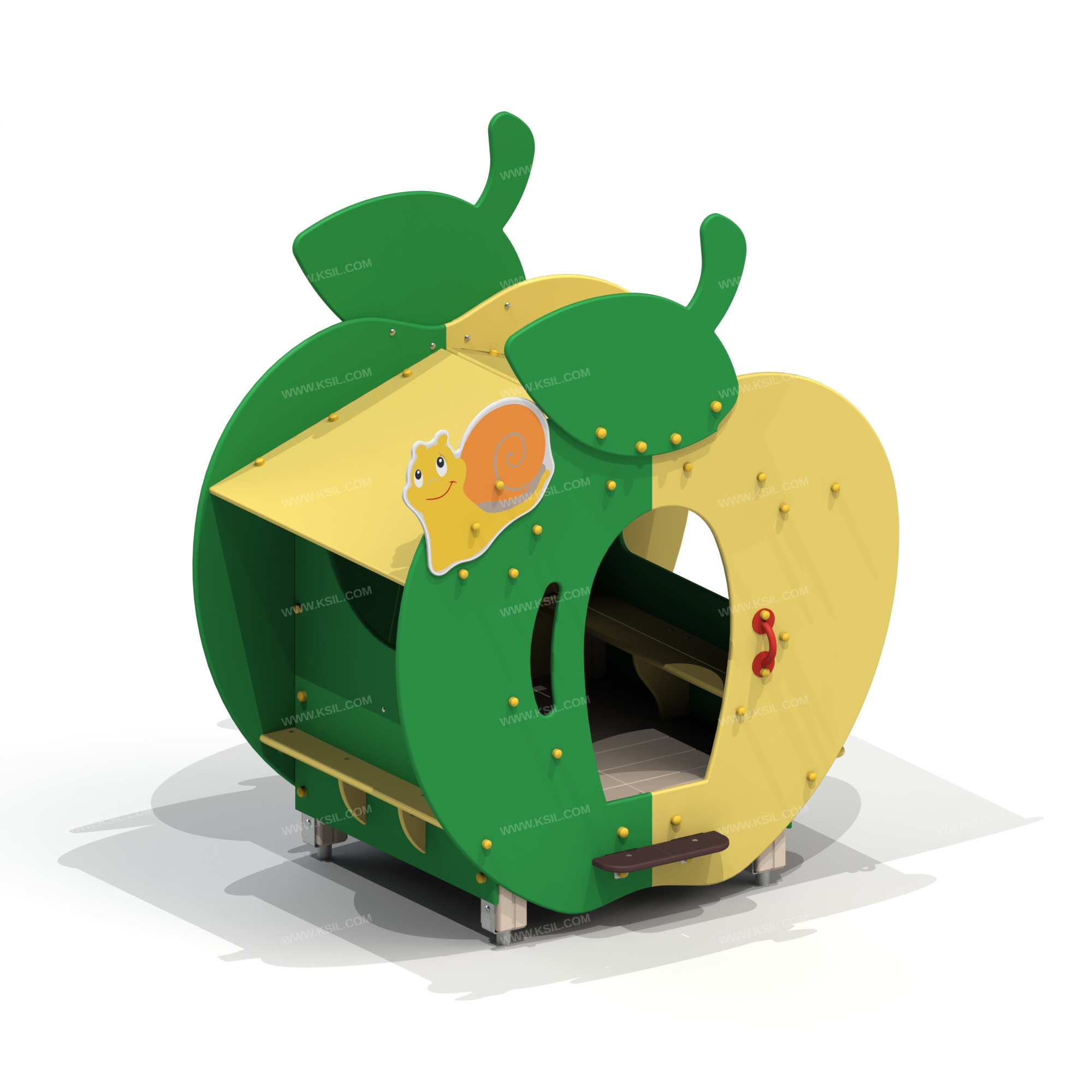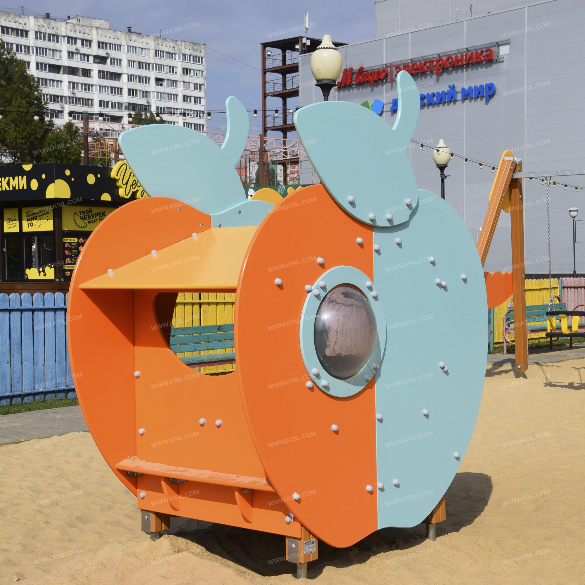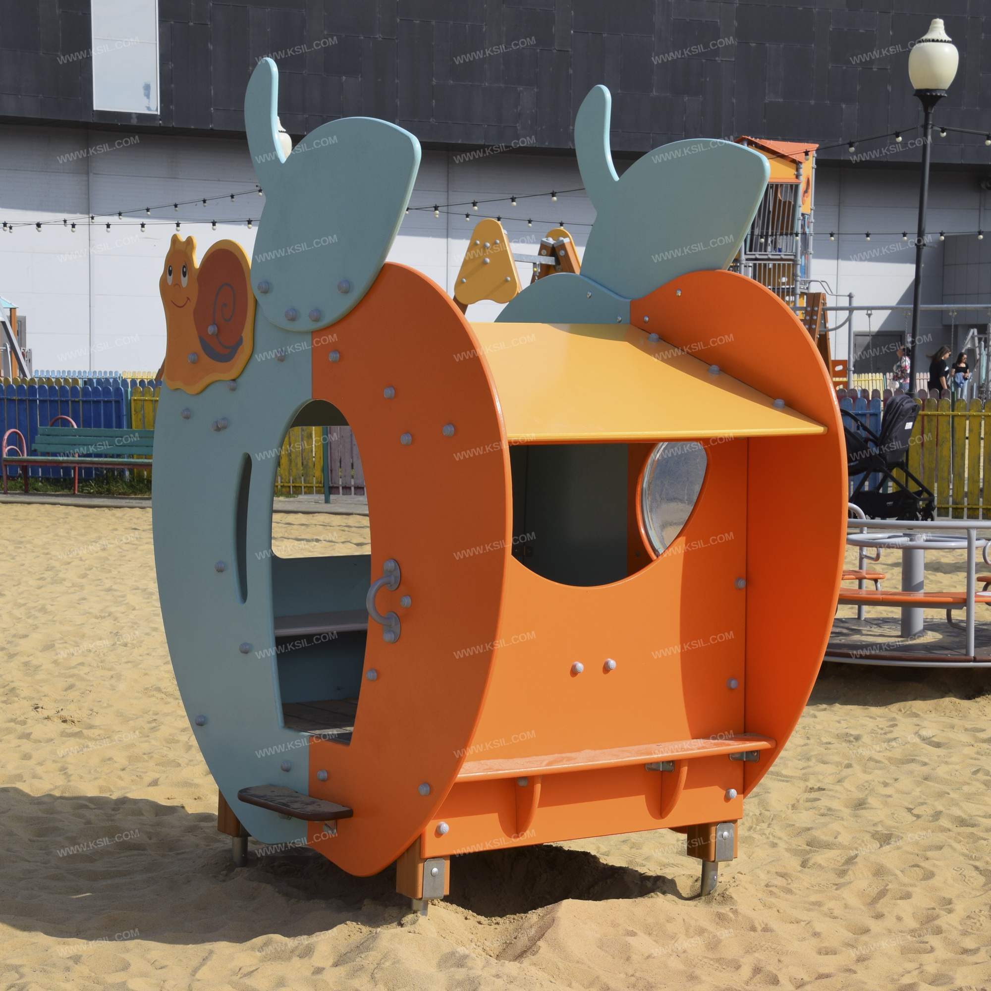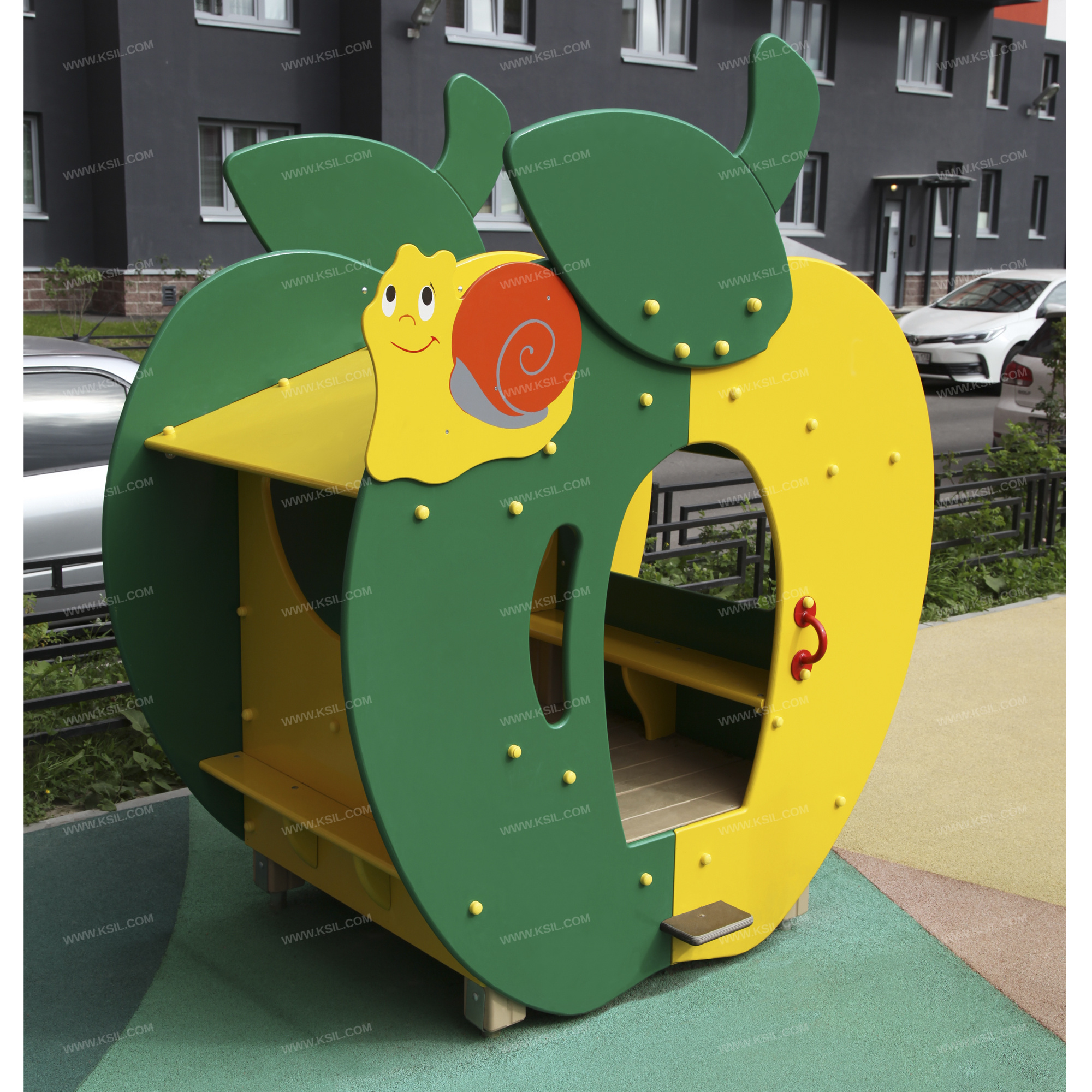 Домик – беседка должен представлять собой устойчивую модульную конструкцию обеспечивающая ребенку комфортные условия для игры на открытом воздухе.Конструкция должна быть в виде яблока с двухскатной крышей, имеющая пол, боковые стенки, одна их которых с входом, окошком и с декоративными накладными элементами, другая – с иллюминатором, переднюю и зданию стенки с фигурными вырезами и скамейками, ступеньки, поручни. Внутри конструкции должны быть установлены 2 скамейки.Несущие столбы должны быть выполнены из клееного деревянного бруса сечением не менее 100х100 мм и иметь скругленный профиль с канавкой посередине. Снизу столб должен заканчиваться металлическим оцинкованным подпятником диаметром не менее 42 мм, который бетонируется в землю.Пол должен быть выполнен из деревянной доски толщиной не менее 40 мм.Скаты крыши, стенки, скамейки, должны быть изготовлены из влагостойкой фанеры толщиной не менее 21 мм. Декоративные накладные элементы в виде улитки должны быть выполнены из влагостойкой фанеры толщиной не менее 9 мм. Поручни должны быть выполнены из металлической трубы диаметром не менее 21 мм. Ступеньки должны быть выполнены из влагостойкой противоскользящей фанеры толщиной не менее 21 мм.