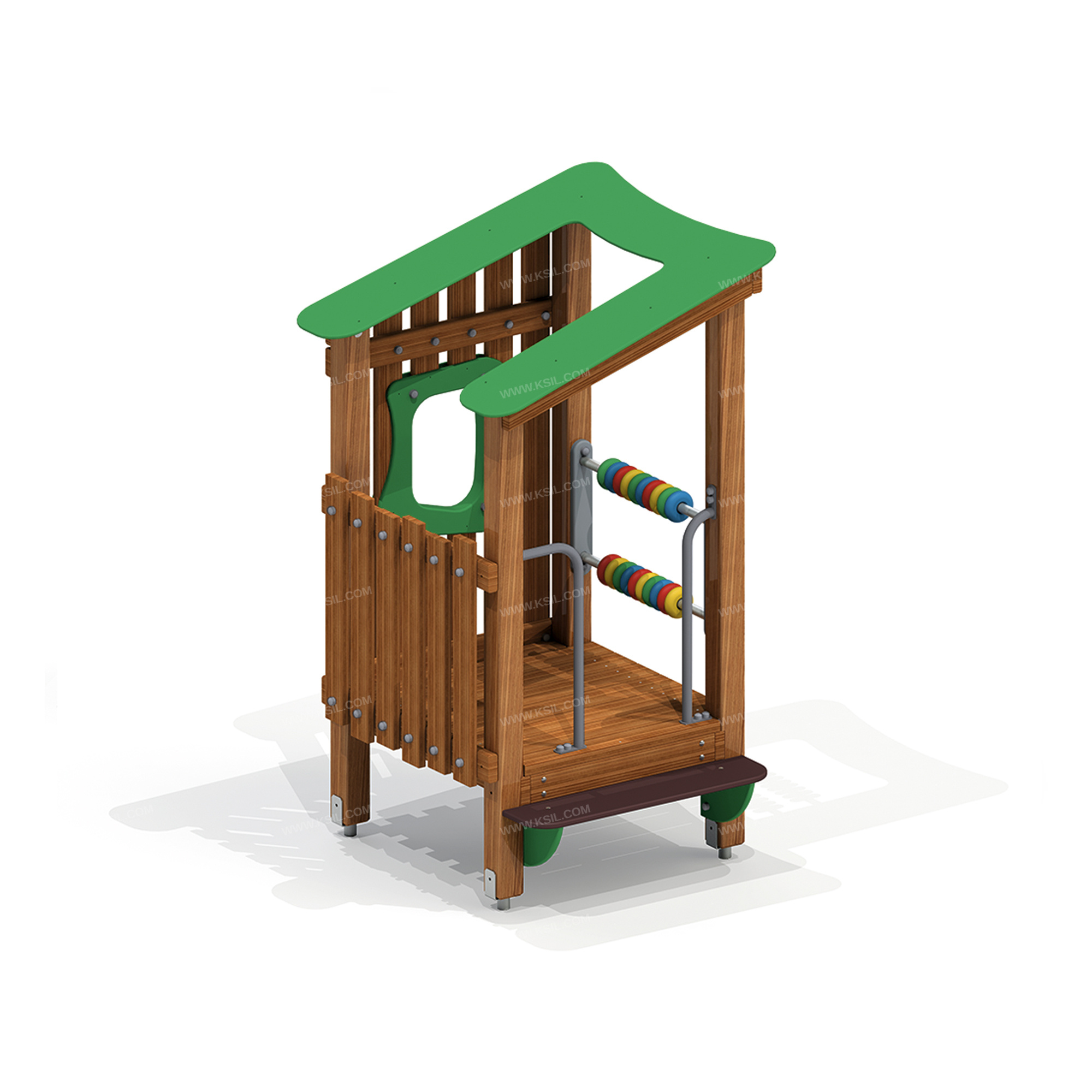 Домик - беседка должен представлять собой устойчивую, модульную конструкцию из игровых и развивающих элементов, обеспечивающие ребенку комфортные условия для игры на открытом воздухе и состоять из башни с крышей.К башне должны быть пристроены: счеты, 2 ограждения в виде наборных экранов, один из которых выполнен с окном, счёты, «Г»-образные поручни, ступенька.Несущие столбы должны быть выполнены из бруса лиственницы сечением не менее 100х100 мм и иметь скругленный профиль, снизу столб должен заканчиваться металлическим оцинкованным подпятником диаметром не менее 42 мм, который бетонируется в землю.Пол башни должен быть выполнен из деревянной доски толщиной не менее 40 мм.Ограждения в виде заборчика состоят из горизонтальных направляющих, выполненных из досок лиственницы сечением 100х40 мм и вертикальных досок из лиственницы сечением 100х30 мм. Все кромки должны быть скруглены радиусом не менее 3 мм. Декоративное окошко выполнено из влагостойкой фанеры толщиной не менее 15 мм. Счеты должны состоять из двух металлических перекладин диаметром не менее 33 мм, закрепленных к столбам с помощью накладок из влагостойкой фанеры толщиной не менее 21 мм, и пластиковых колец.Крыша выполнена в виде фигурного ската из влагостойкой фанеры толщиной не менее 15 мм, опирающегося на столбы и прогоны из доски лиственницы сечением 100х40 мм. «Г» образные поручни должны быть выполнены из металлической трубы диаметром не менее 33 мм.Ступенька должна быть выполнена из влагостойкой противоскользящей фанеры толщиной не менее 21 мм, опорные ребра ступеньки выполнены из влагостойкой фанеры толщиной не менее 21 мм.