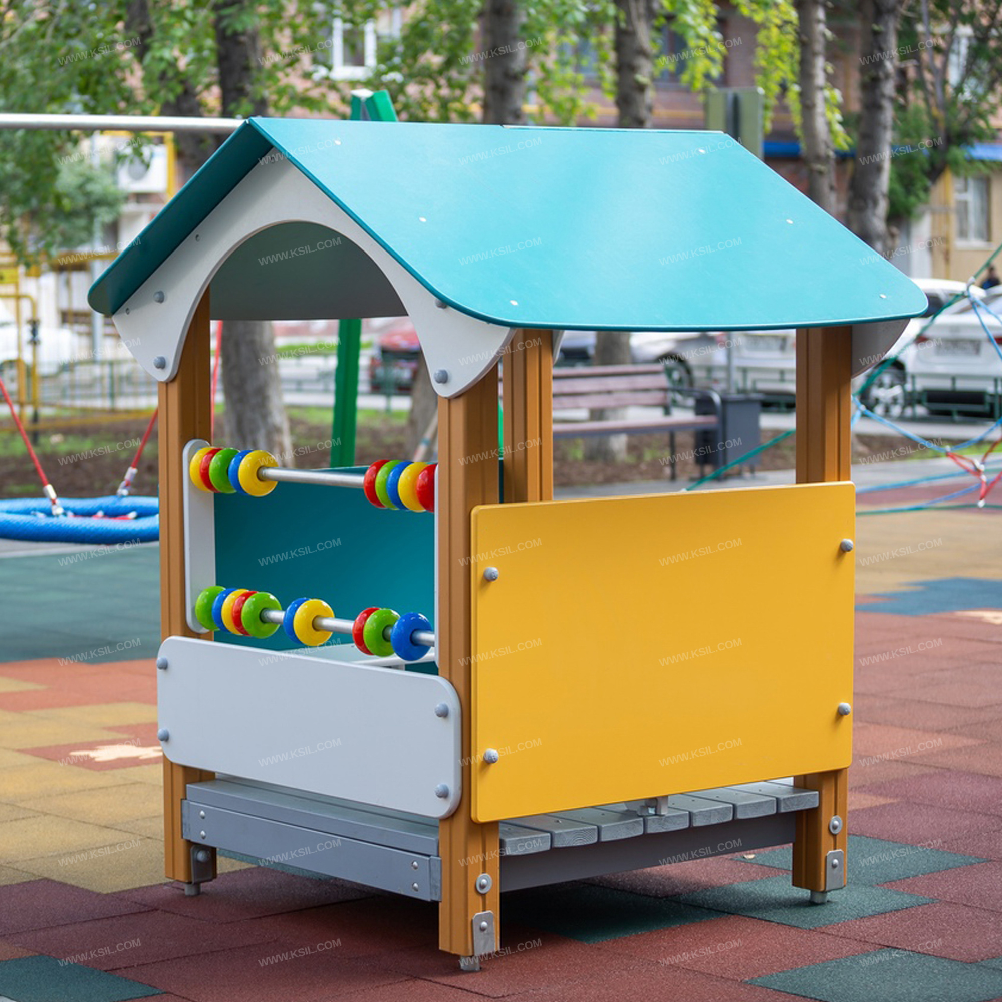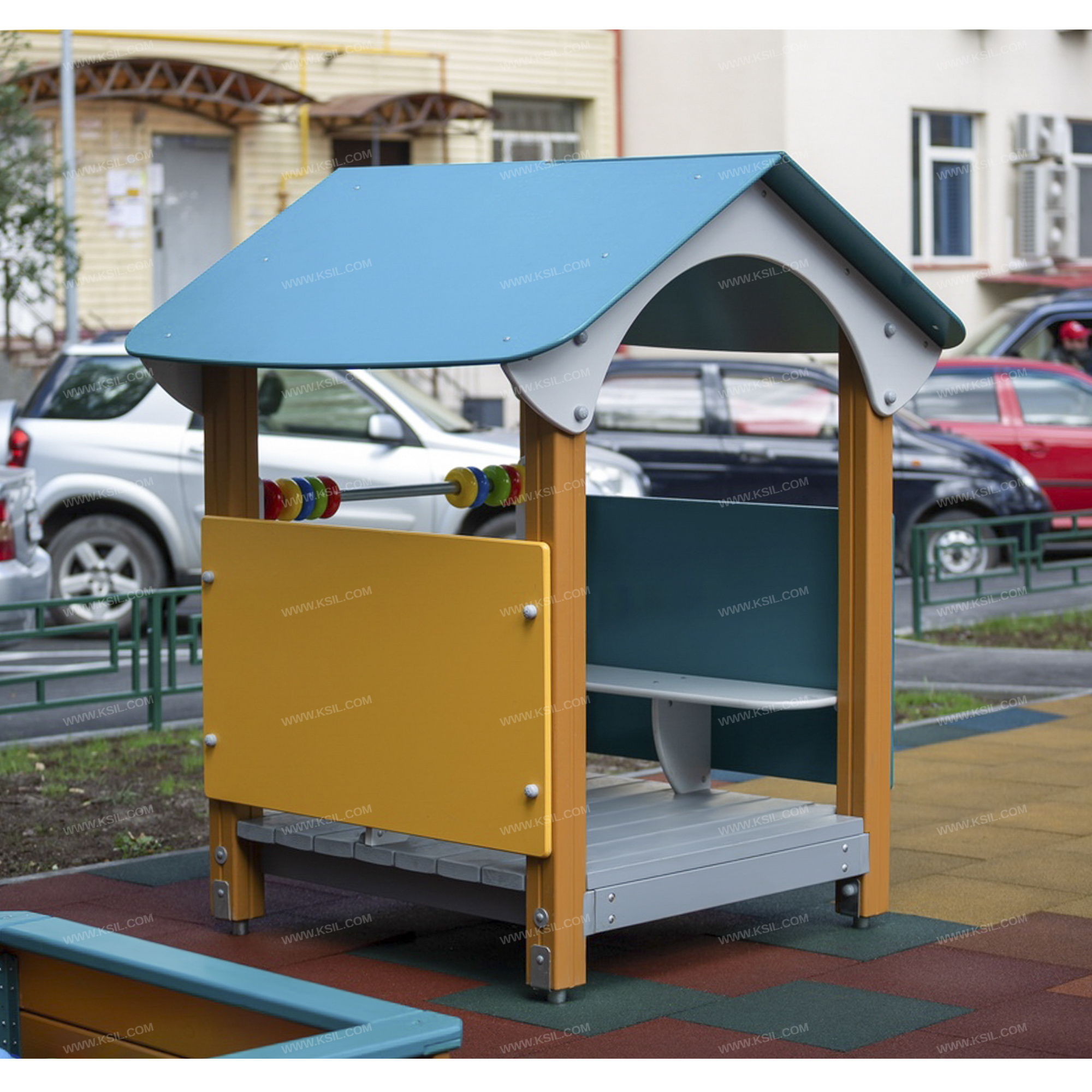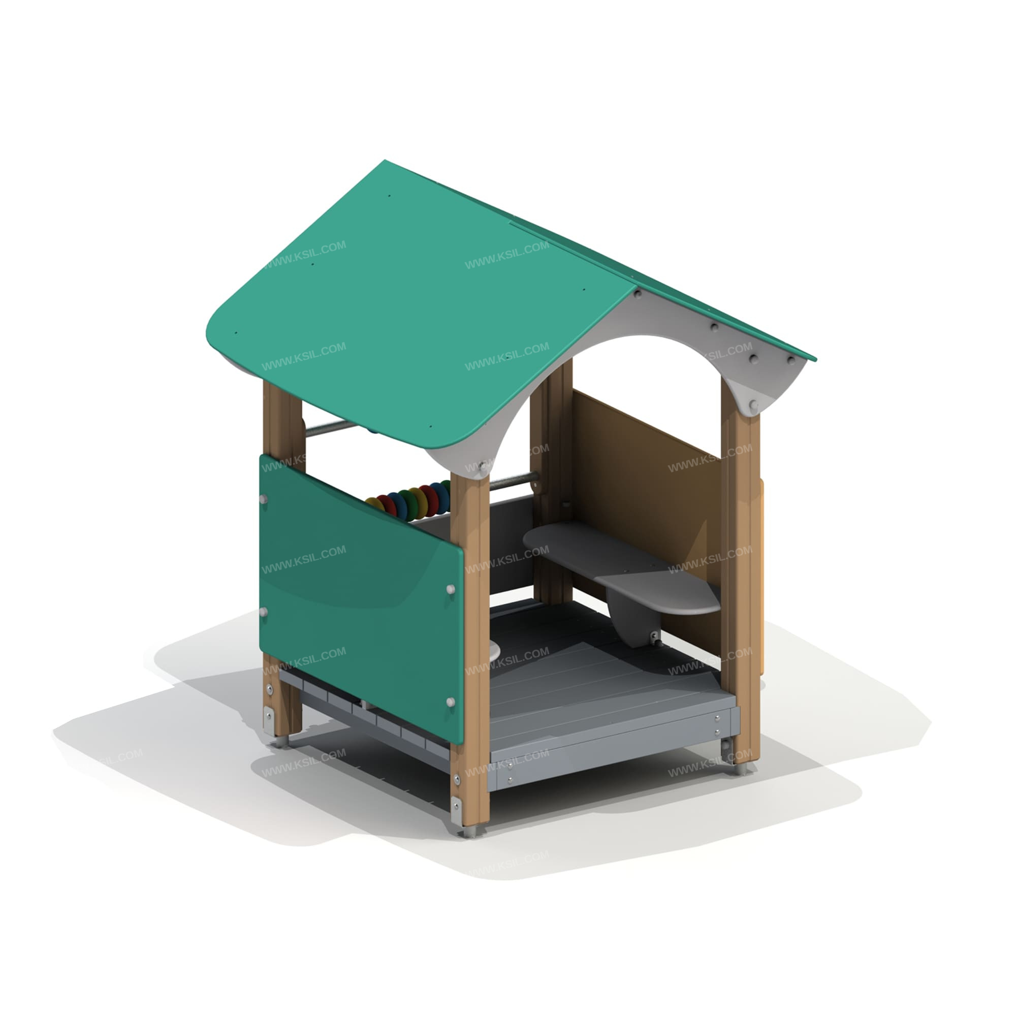 Домик - беседка должен представлять собой устойчивую, модульную конструкцию из игровых и развивающих элементов, обеспечивающие ребенку комфортные условия для игры на открытом воздухе и состоять из башни с крышей.К башне должны быть пристроены: счеты, 3 фанерных ограждения, один из которых находиться под счетами, 2 скамейки.Несущие столбы должны быть выполнены из клееного деревянного бруса сечением не менее 100х100 мм и иметь скругленный профиль с канавкой посередине. Снизу столб должен заканчиваться металлическим оцинкованным подпятником диаметром не менее 42 мм, который бетонируется в землю.Пол башни должен быть выполнен из деревянной доски толщиной не менее 40 мм.Ограждение должно быть выполнено из влагостойкой окрашенной фанеры толщиной не менее 21 мм. Счеты должны состоять из двух металлических перекладин диаметром не менее 33 мм и пластиковых или деревянных «баранок».Крыша двухскатная должна состоять из скатов, выполненных из влагостойкой фанеры толщиной не менее 15 мм и фронтонов из влагостойкой фанеры толщиной не менее 21 мм.
