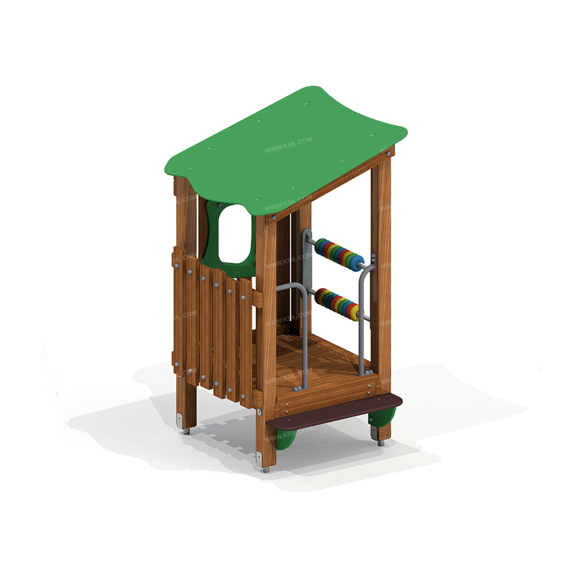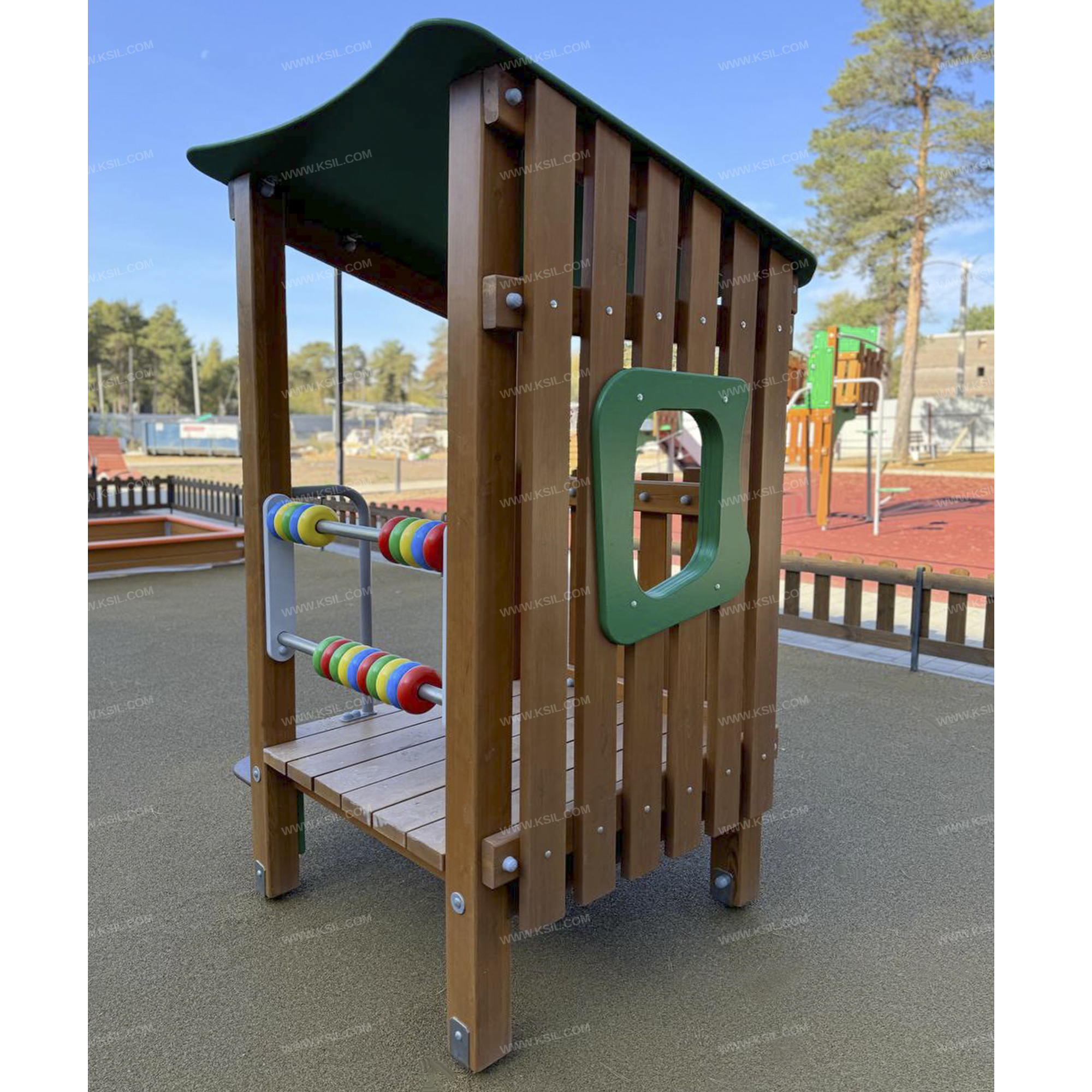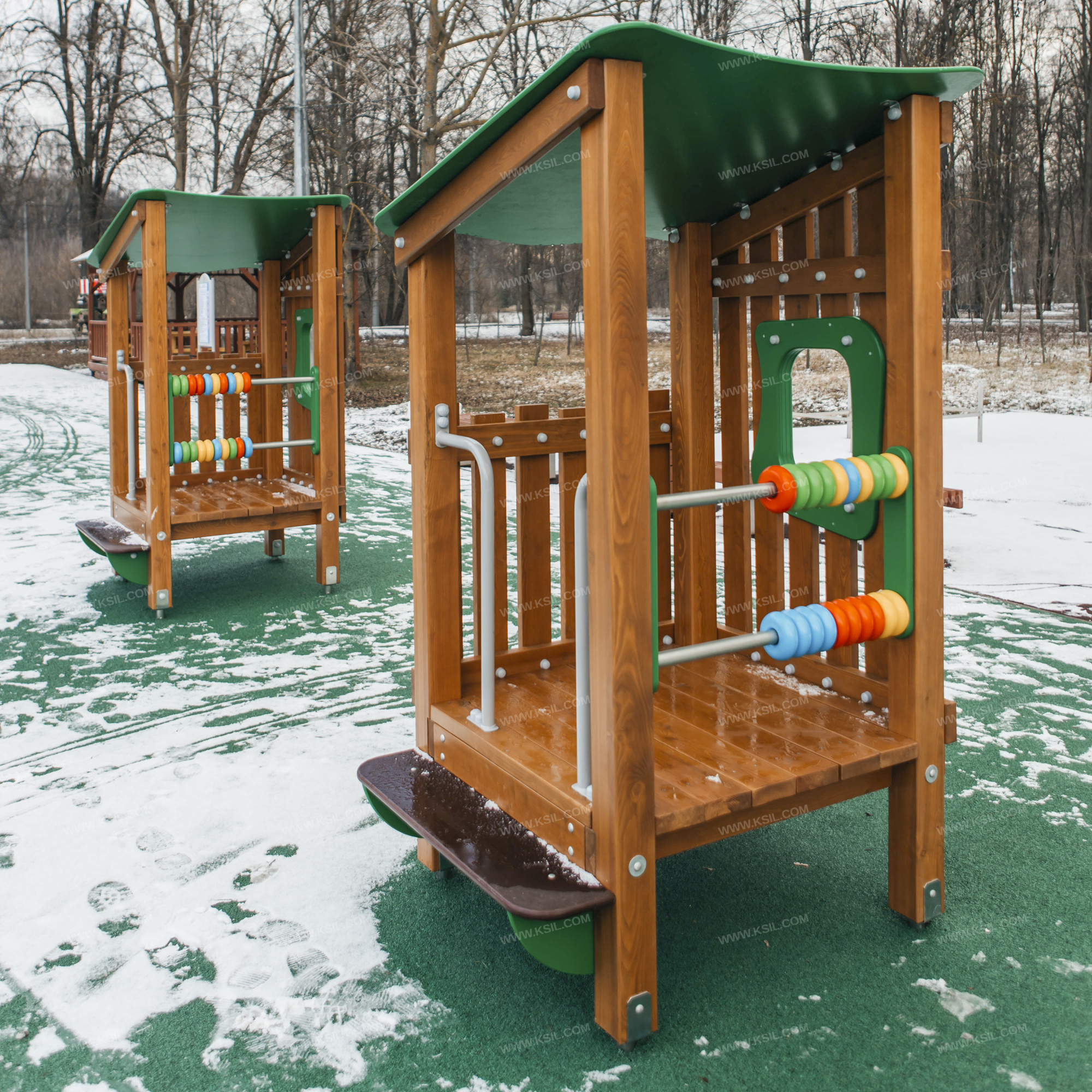 Домик - беседка должен представлять собой устойчивую, модульную конструкцию из игровых и развивающих элементов, обеспечивающие ребенку комфортные условия для игры на открытом воздухе и состоять из башни с крышей.К башне, с высотой площадки не менее 510 мм, должны быть пристроены: счеты, 2 ограждения в виде заборчика, одно из которых выполнено с окном, «Г» -образные поручни, ступенька.Несущие столбы комплекса должны быть выполнены из клееного деревянного бруса лиственницы сечением не менее 100х100 мм и иметь скругленный профиль. Снизу столб крепится на металлический оцинкованный подпятник диаметром трубы не менее 42 мм, который бетонируется в землю.Пол башни должен быть выполнен из деревянной доски толщиной не менее 40 мм.Ограждения в виде заборчика состоят из горизонтальных направляющих, выполненных из досок лиственницы сечением 100х40 мм и вертикальных досок из лиственницы сечением 100х30 мм. Все кромки должны быть скруглены радиусом не менее 3 мм. Декоративное окошко выполнено из влагостойкой фанеры толщиной не менее 15 мм.Счеты должны состоять из двух металлических перекладин диаметром не менее 33 мм, закрепленных к столбам с помощью накладок из влагостойкой фанеры толщиной не менее 21 мм, и пластиковых колец.Крыша выполнена в виде фигурного ската из влагостойкой фанеры толщиной не менее 15 мм, опирающегося на столбы и прогоны из доски лиственницы сечением 100х40 мм. «Г» -образные поручни должны быть выполнены из металлической трубы диаметром не менее 33 мм.Ступенька должна быть выполнена из влагостойкой противоскользящей фанеры толщиной не менее 21 мм, опорные ребра ступеньки выполнены из влагостойкой фанеры толщиной не менее 21 мм.