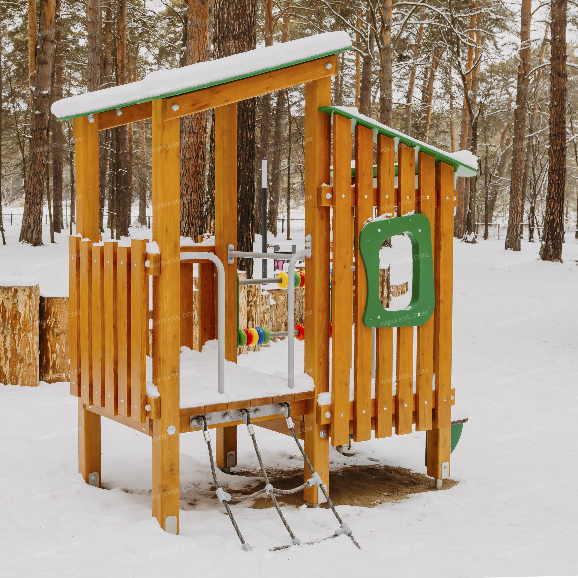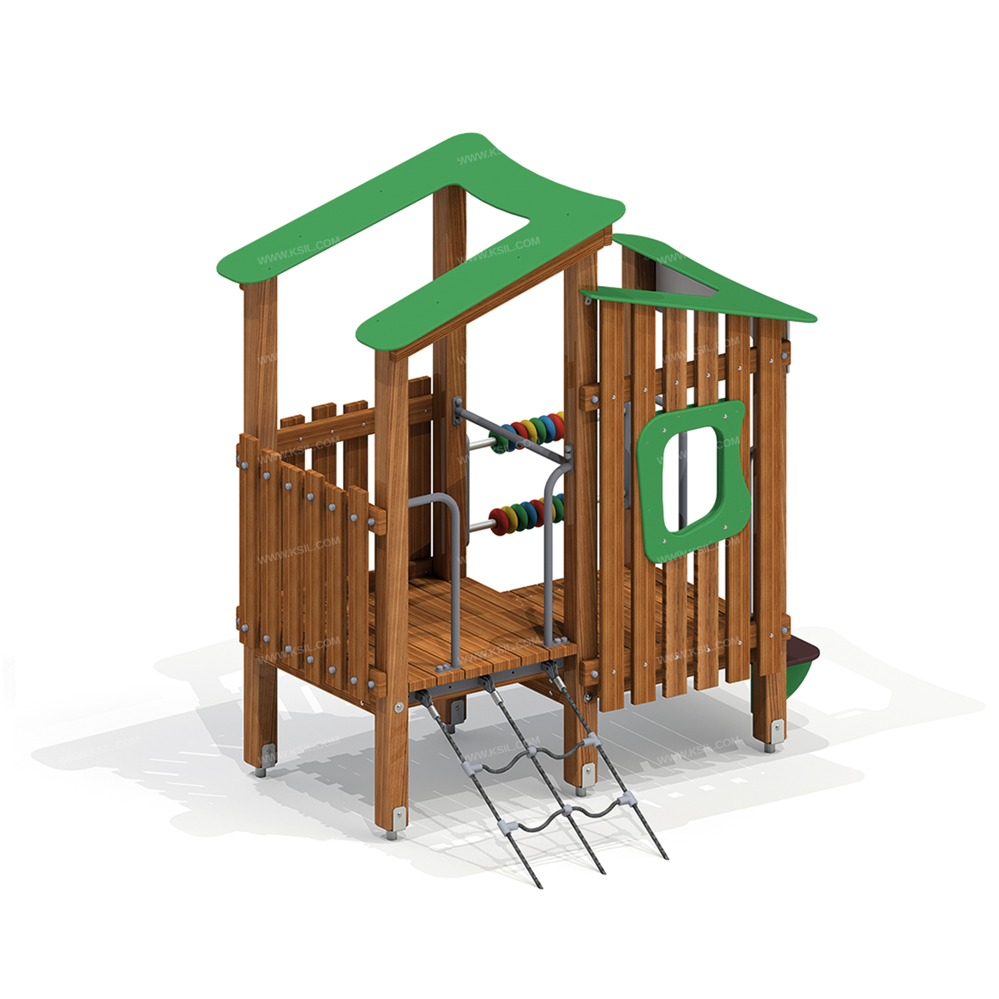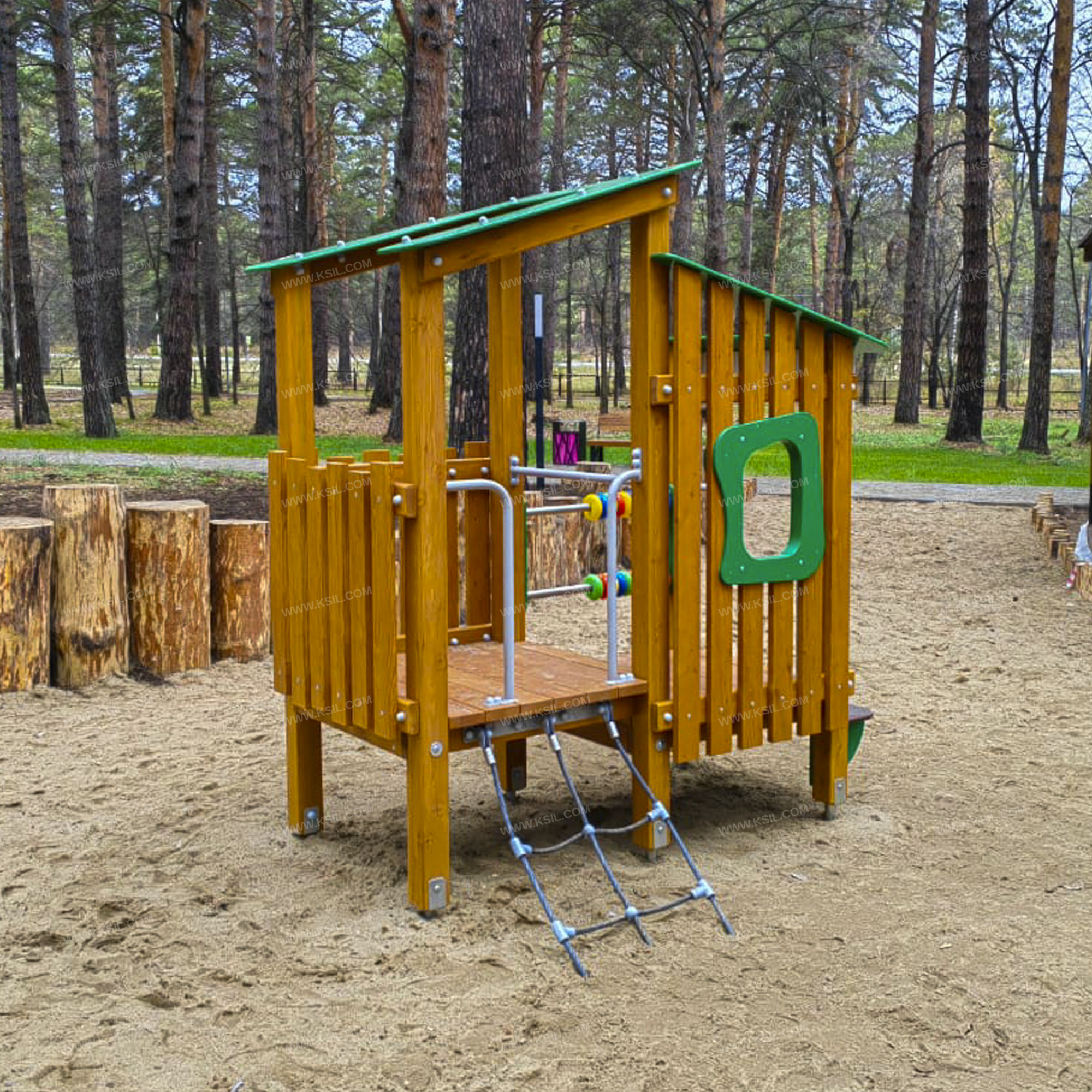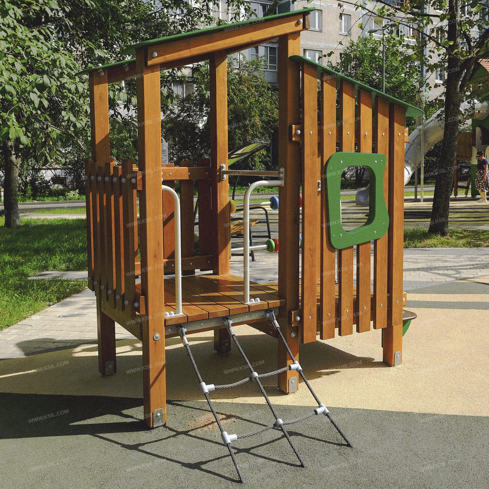 Домик - беседка должен представлять собой модульную сборно-разборную конструкцию из игровых и развивающих элементов, обеспечивающих ребенку комфортные условия для игры на открытом воздухе и состоять из башни и полубашни. К полубашне, с высотой площадки не менее 510 мм, должны быть пристроены: Г-образные поручни, ограждение в виде заборчика с окном, комплект счёт, ступенька, односкатная крыша.К башне, с высотой площадки не менее 650 мм, должны быть пристроены наклонная сетка с Г-образными поручнями, ограждение в виде заборчика, односкатная крыша. Несущие столбы комплекса должны быть выполнены из клееного деревянного бруса лиственницы сечением не менее 100х100 мм и иметь скругленный профиль. Снизу столб крепится на металлический оцинкованный подпятник диаметром трубы не менее 42 мм, который бетонируется в землю. Пол башен должен быть выполнен из деревянной доски лиственницы толщиной не менее 40 мм.Сетка должна быть выполнена из полипропиленового 6-прядного армированного металлом каната тросовой свивки, канат сетки должен быть диаметром не менее 16 мм и соединен между собой пластиковыми креплениями. Сетка должна крепиться к домику через пластину, выполненную из металлического листа толщиной не менее 4 мм. Ограждения в виде заборчика состоят из горизонтальных направляющих, выполненных из досок лиственницы сечением 100х40 мм и вертикальных досок из лиственницы сечением 100х30 мм. Все кромки должны быть скруглены радиусом не менее 3 мм. Декоративное окошко выполнено из влагостойкой фанеры толщиной не менее 15 мм. Счеты должны состоять из двух металлических перекладин диаметром не менее 33 мм, закрепленных к столбам с помощью накладок из влагостойкой фанеры толщиной не менее 21 мм, и пластиковых колец.Крыша выполнена в виде фигурного ската из влагостойкой фанеры толщиной не менее 15 мм, опирающегося на столбы и прогоны из доски лиственницы сечением 100х40 мм. «Г» -образные поручни должны быть выполнены из металлической трубы диаметром не менее 33 мм.Ступенька должна быть выполнены из влагостойкой противоскользящей фанеры толщиной не менее 21 мм, опорные ребра скамейки выполнены из влагостойкой фанеры толщиной не менее 21 мм.