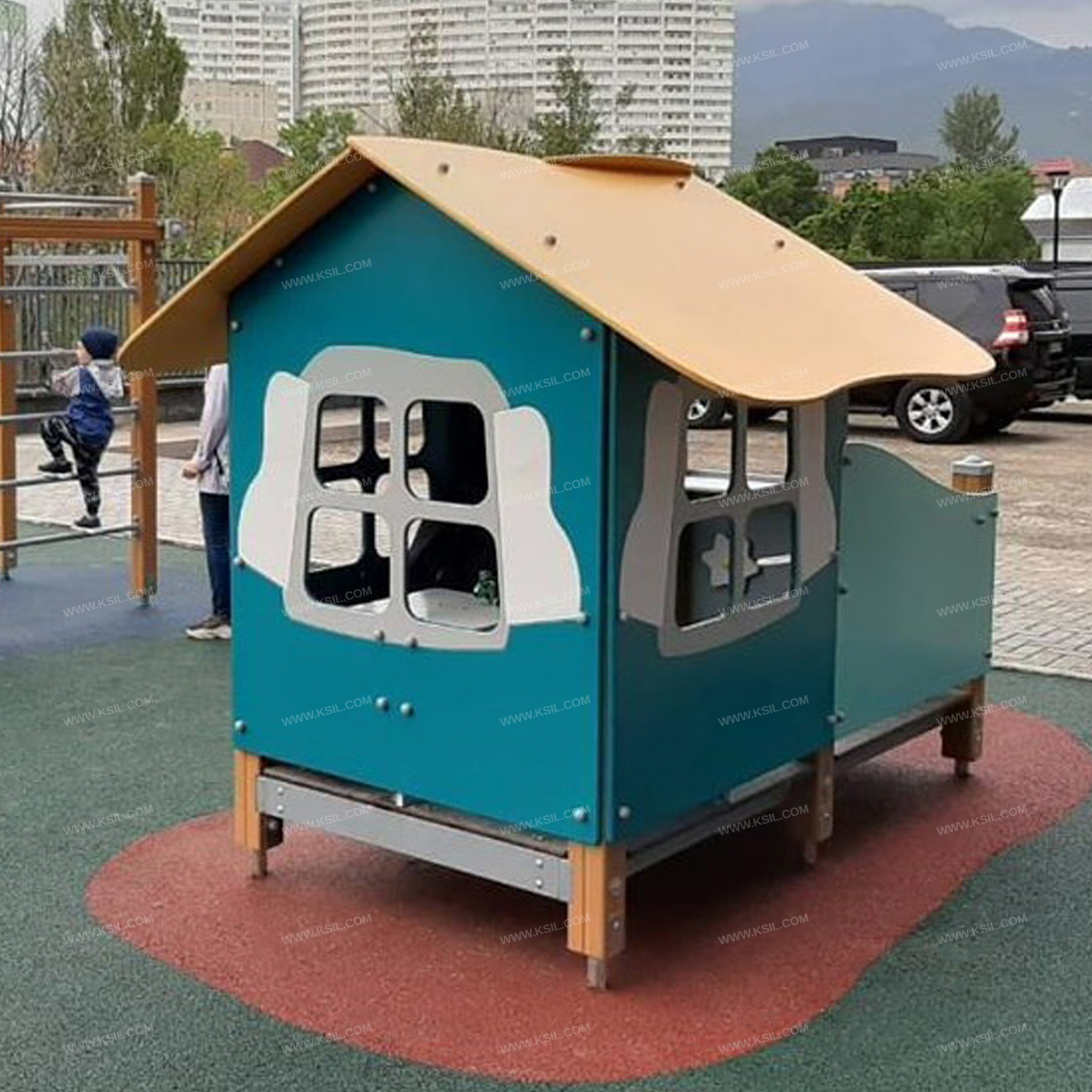 Домик – беседка должен представлять собой устойчивую модульную конструкцию обеспечивающая ребенку комфортные условия для игры на открытом воздухе.Конструкция должна состоять из башни с двухскатной крышей и полубашни в виде балкона с перилами и входом. К башне должны быть пристроены: 3 боковые стенки с окошками в виде 4-х секций-прорезей, стол, 2 сиденья.К полубашне должны быть пристроены: балкон с перилами, столик, порученьНесущие столбы должны быть выполнены из клееного деревянного бруса сечением не менее 100х100 мм и иметь скругленный профиль с канавкой посередине. Сверху открытый столб должен заканчиваться пластиковой заглушкой, снизу столб должен заканчиваться металлическим оцинкованным подпятником диаметром не менее 42 мм, который бетонируется в землю.Пол башни и полубашни должен быть выполнен из влагостойкой противоскользящей фанеры толщиной не менее 21 мм. Стенки, скамейки, столики, балкон должны быть изготовлены из влагостойкой фанеры толщиной не менее 21 мм. Крыша башни двухскатная должна состоять из скатов, выполненных из влагостойкой фанеры толщиной не менее 15 мм и фронтонов из влагостойкой фанеры толщиной не менее 21 мм.Поручень должен быть выполнен из металлической трубы диаметром не менее 33 мм.